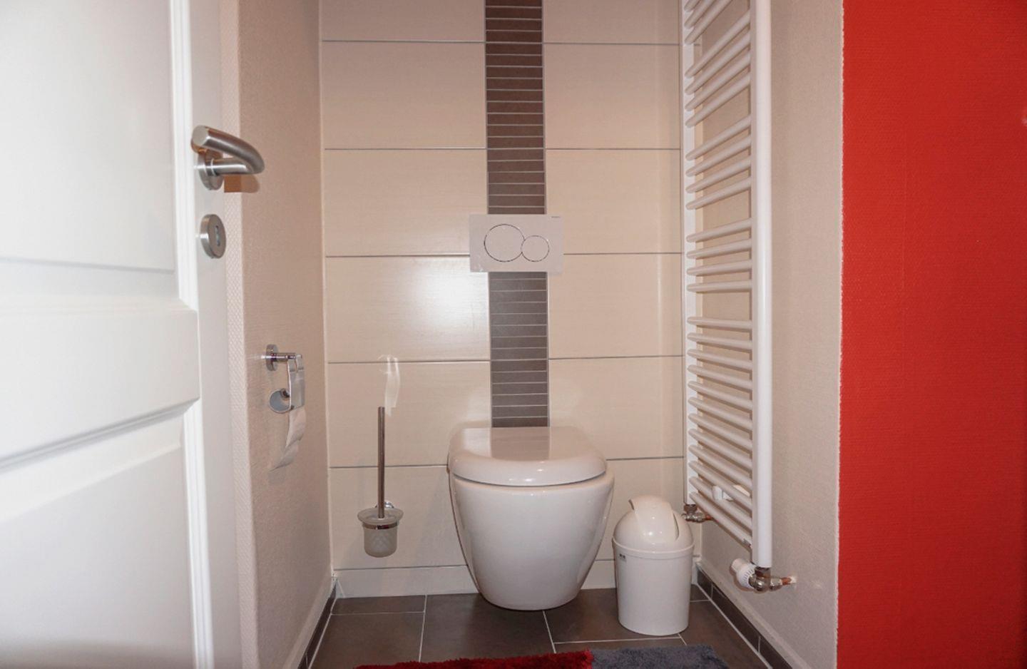 Ein modernes Bad mit großer Dusche befindet sich gleich dahinter.