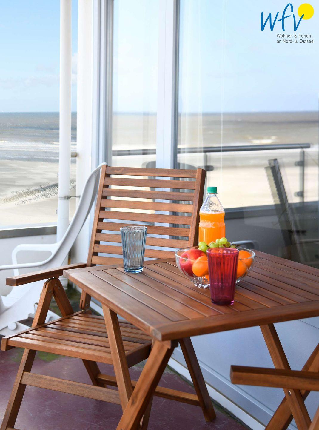 Bereits beim Ferienfrühstück starten Sie am Esstisch mit einem herrlichen Ausblick in den Urlaubstag. In Gedanken wird schon die Badetasche gepackt oder der Rucksack für den Strandspaziergang. Bei gutem Wetter können Sie natürlich auch auf dem Balkon frühstücken: Bequeme Gartenmöbel laden hier zum Verweilen und Ausspannen ein. Der Balkon ist überdacht und liegt in Richtung Westen, so kommen Sie in den Genuss lauschiger Abendstunden mit herrlichen Sonnenuntergängen.