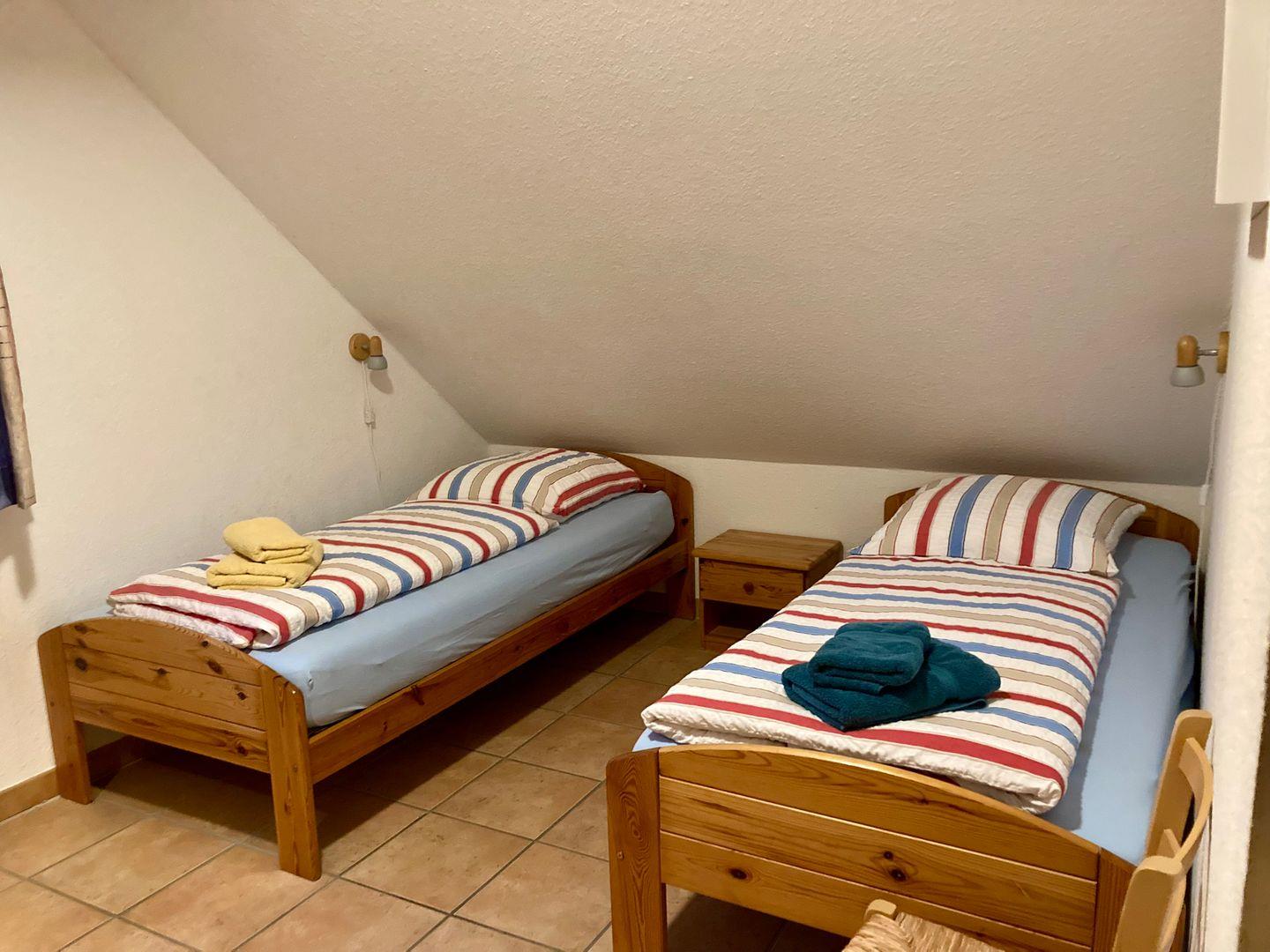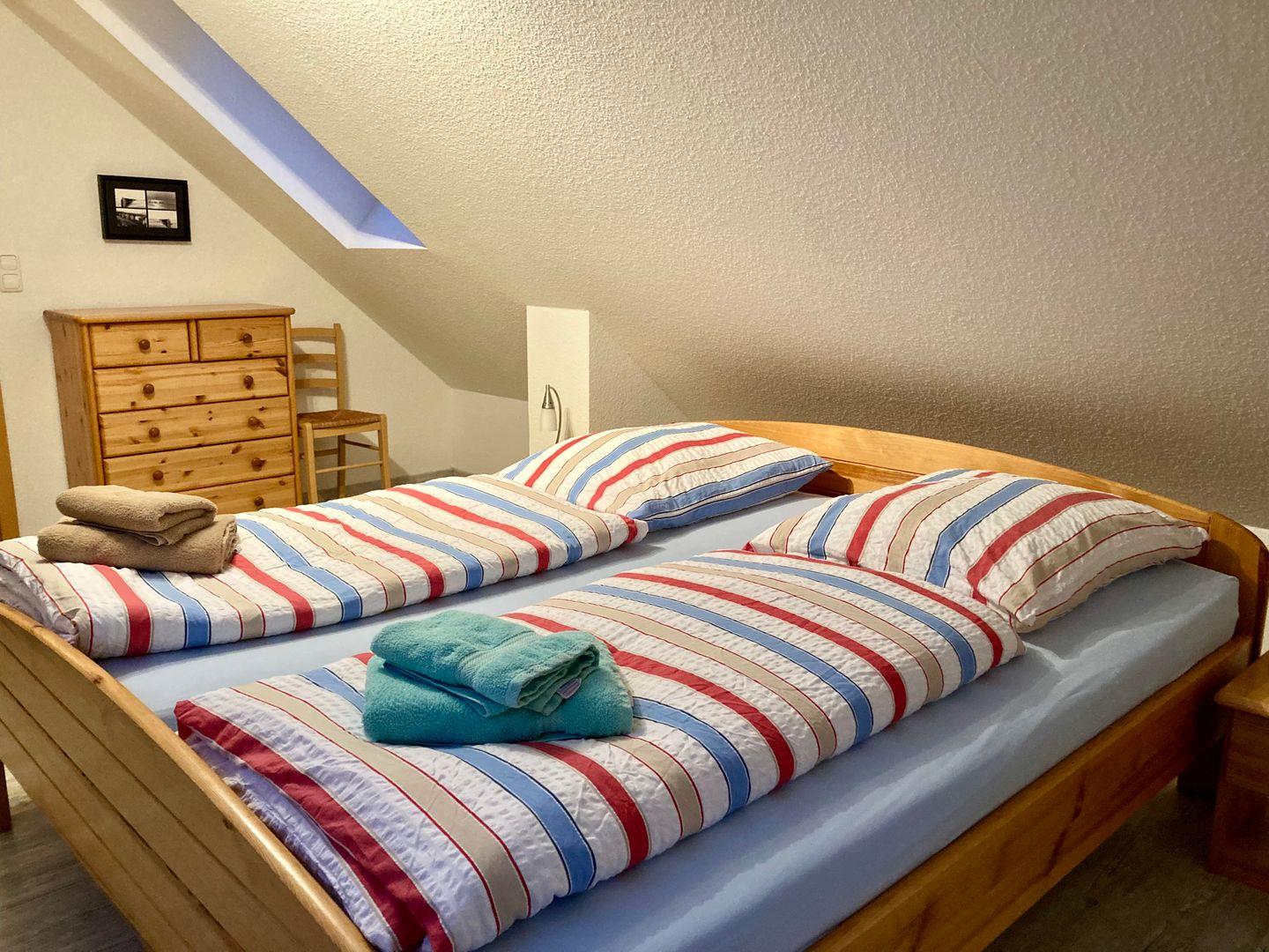 Im unteren Bereich der Wohnung (1.Etage) befindet sich der Wohnbereich, die Küche, das Badezimmer und ein Schlafzimmer mit 2 Einzelbetten. Im oberen Geschoss ist dann das große "Elternschlafzimmer"
