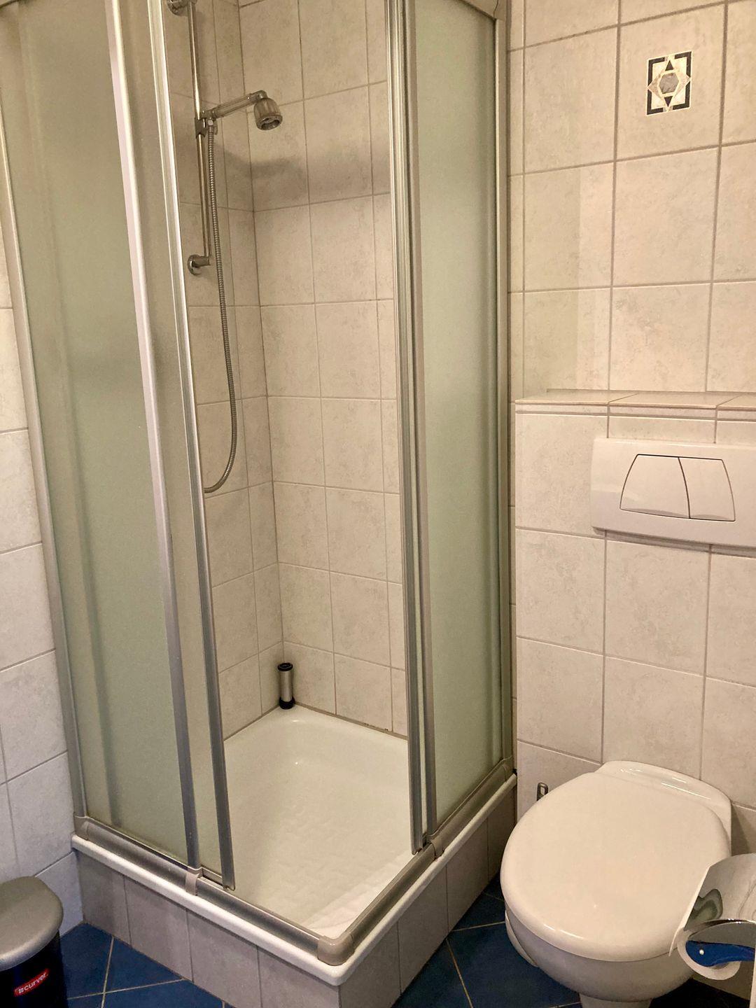 Das Schlafzimmer verfügt über ein Doppel- und einem Einzelbett. Es grenzt direkt an das helle Badezimmer an