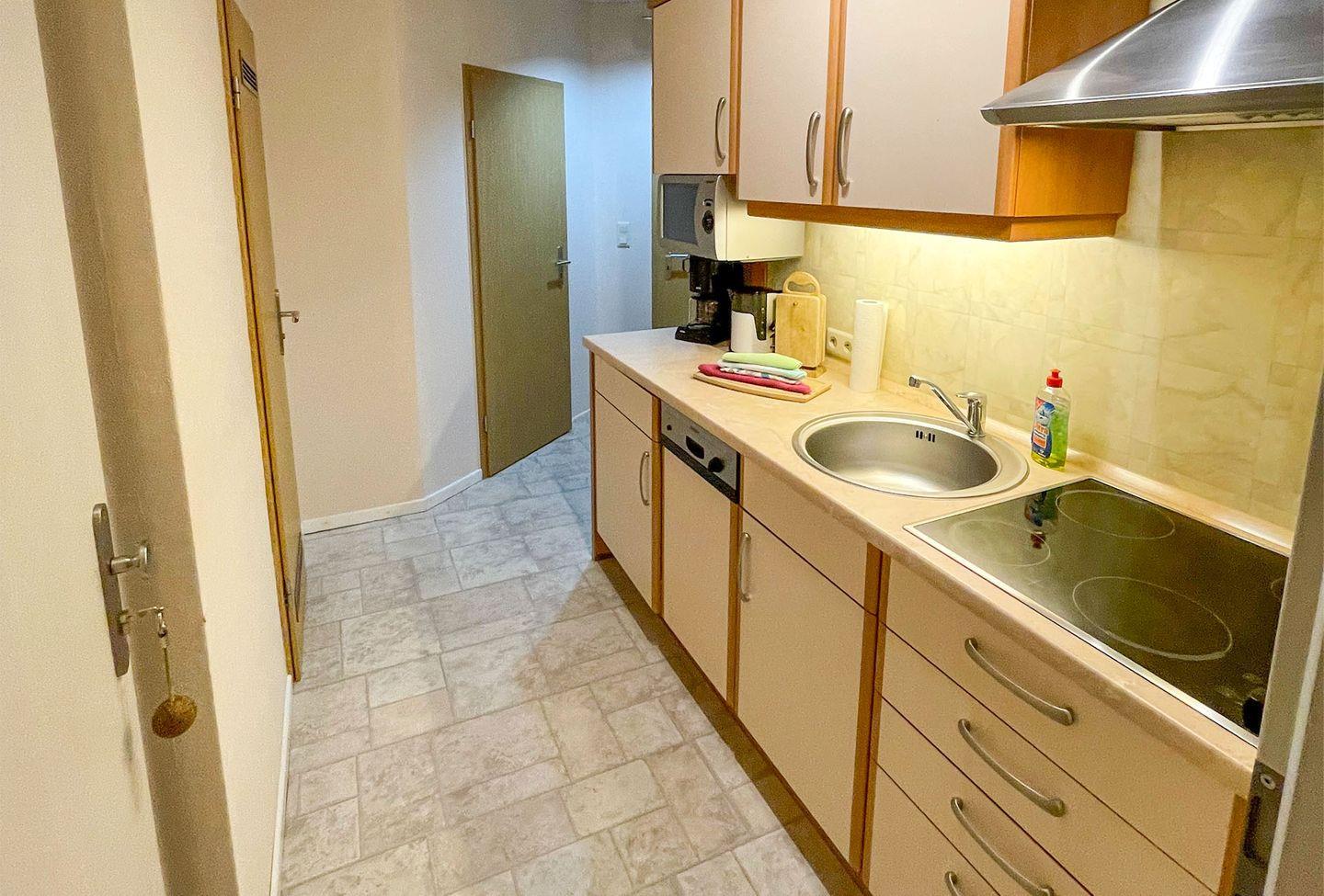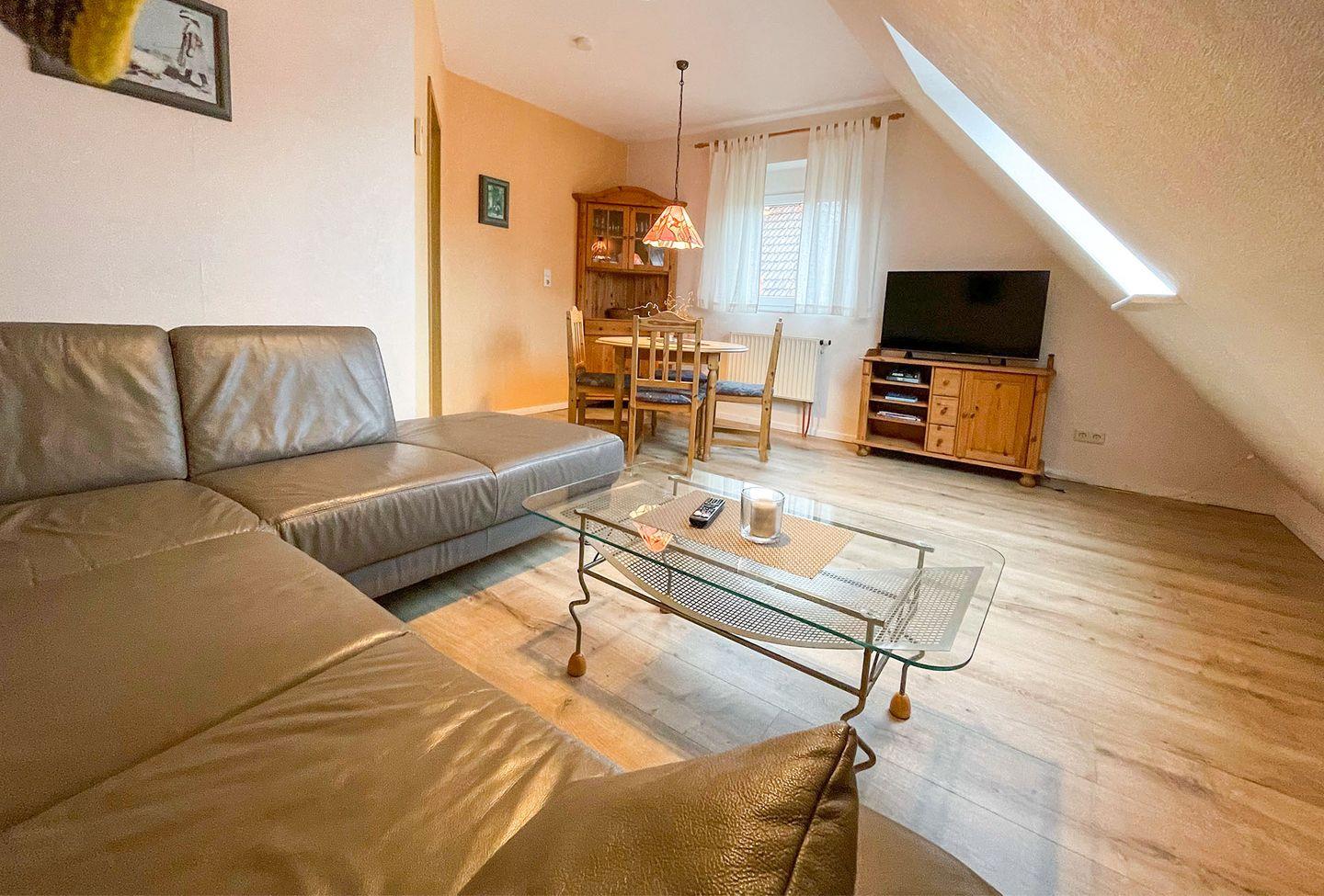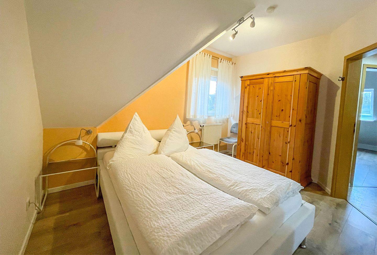 Ferienwohnung mit 2 Schlafräumen, Wohnraum mit Ess- und Sitzecke, Du/WC. Kochzeile, Geschirrspüler, Mikrowelle, TV, Radio. kostenloser WLANzugang. Gartennutzung