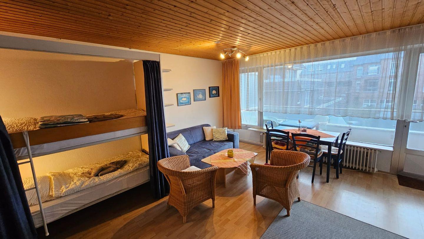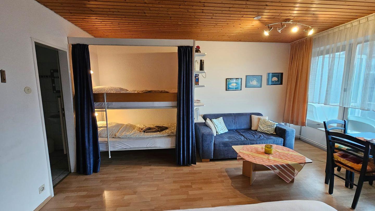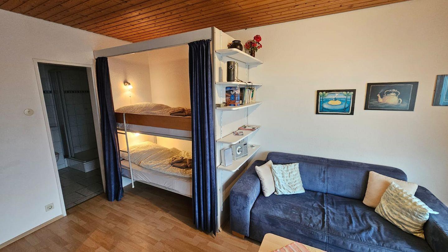 Im Wohnbereich ist ein Schrankbett mit Doppelmatratze und ein Etagenbett