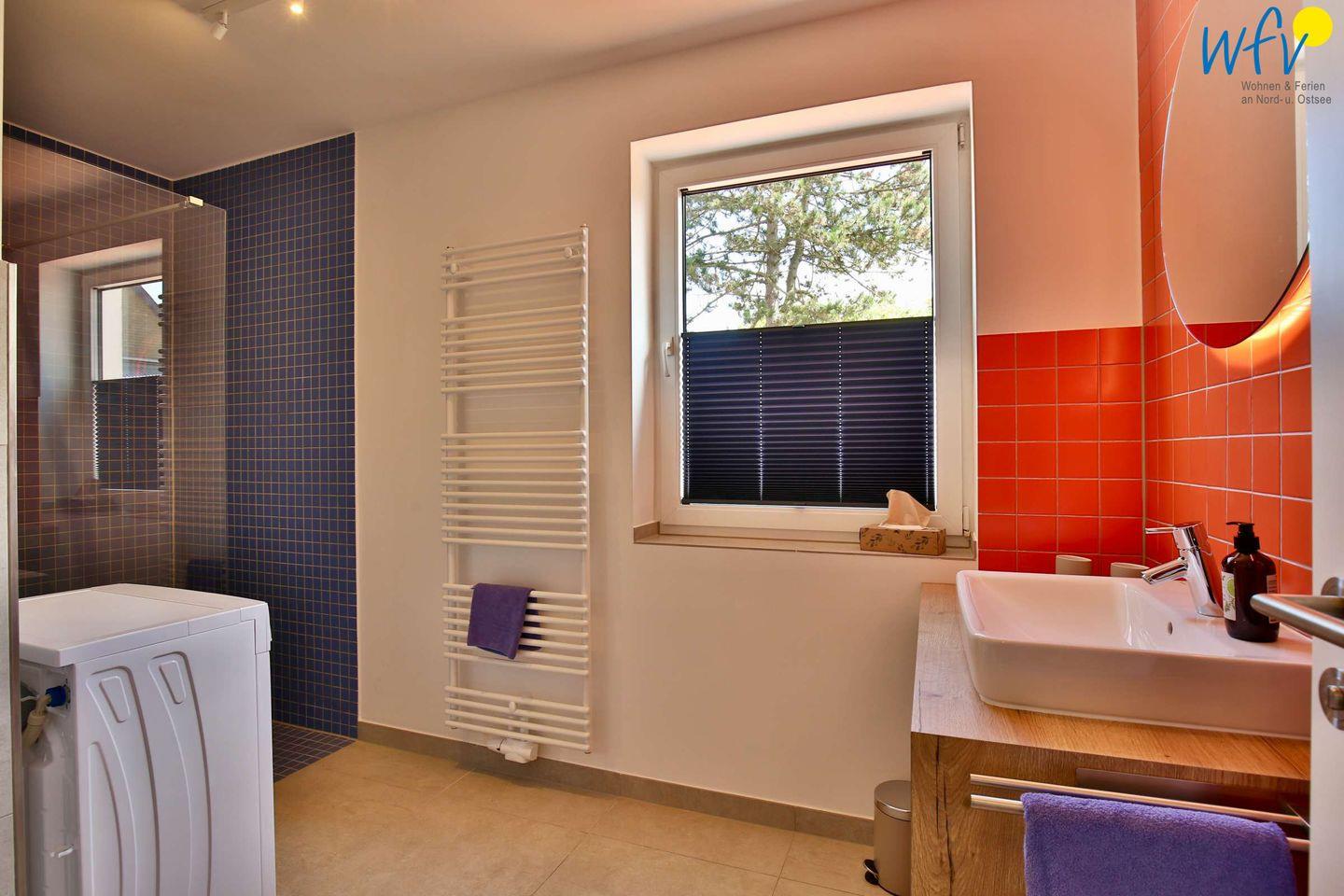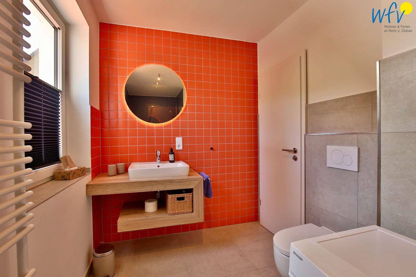 Ein weiteres Highlight bietet Ihnen das Badezimmer. Die große Dusche, der passgenaue Waschtisch und die fein abgestimmte Beleuchtung machen auch diesen Raum zu einem Entspannungsort.