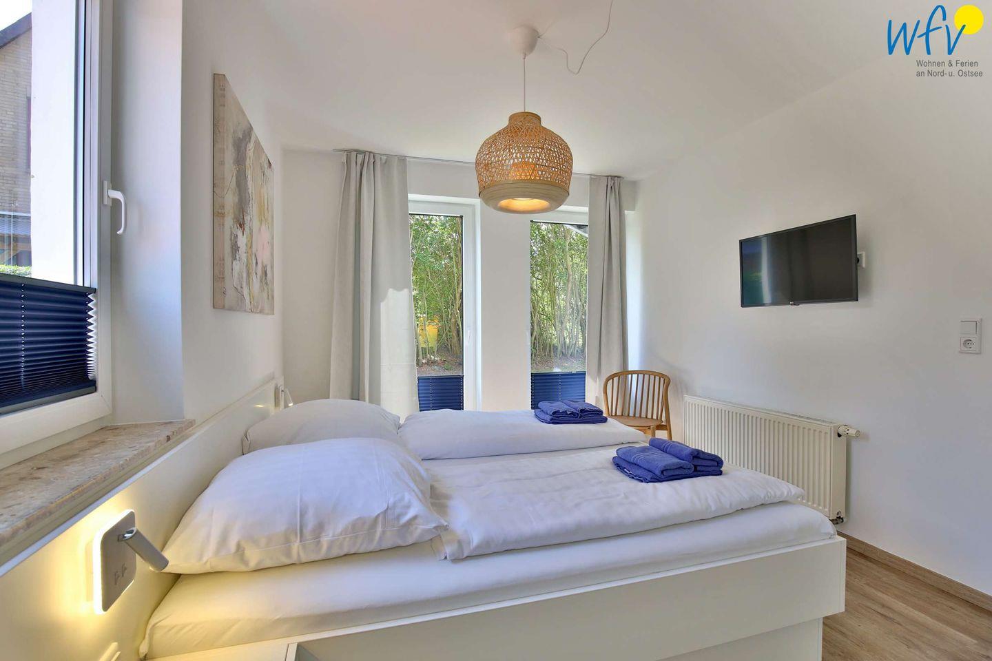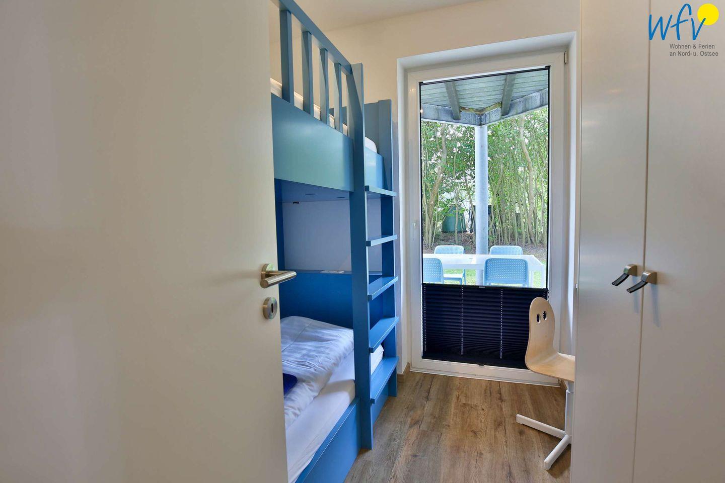In dem großen und gemütlich eingerichteten Elternschlafzimmer befindet sich ein maßgeschneidertes Bett, ein SmartTV und ein Kleiderschrank für Ihre Urlaubsgarderobe. Von hier aus haben Sie einen direkten Zugang zur Terrasse, auf dem Sie herrlich entspannte Stunden verbringen können. Das Kinderzimmer mit passgenauem Etagenbett und einem kleinen Maltisch für Kinder ist ein wunderbarer Wohlfühlort für unsere kleinen Gäste; ebenfalls mit direktem Zugang zur Terrasse.