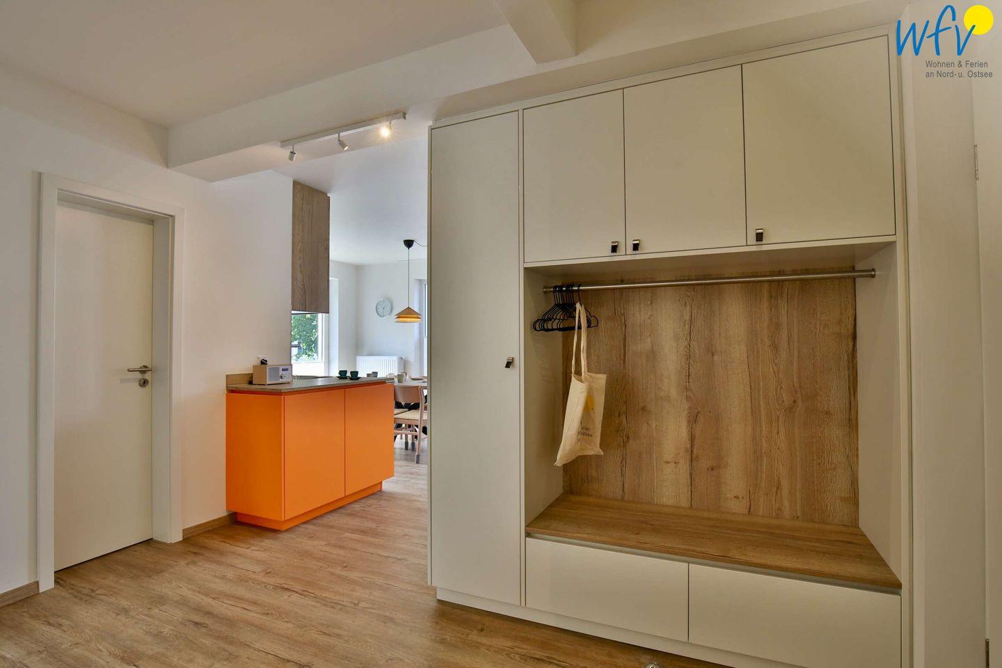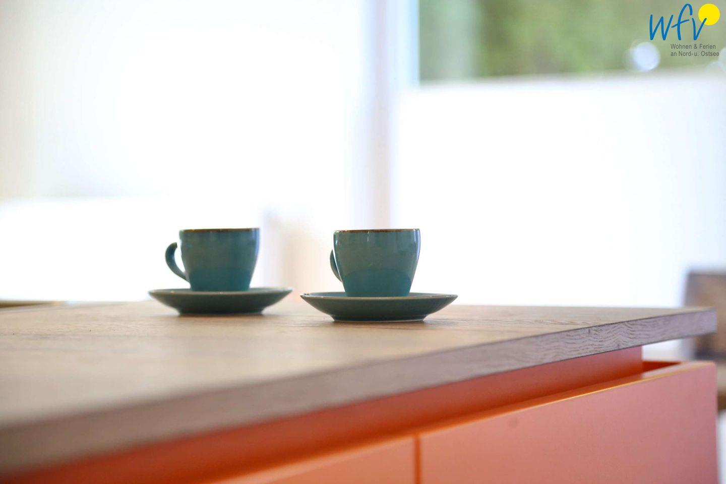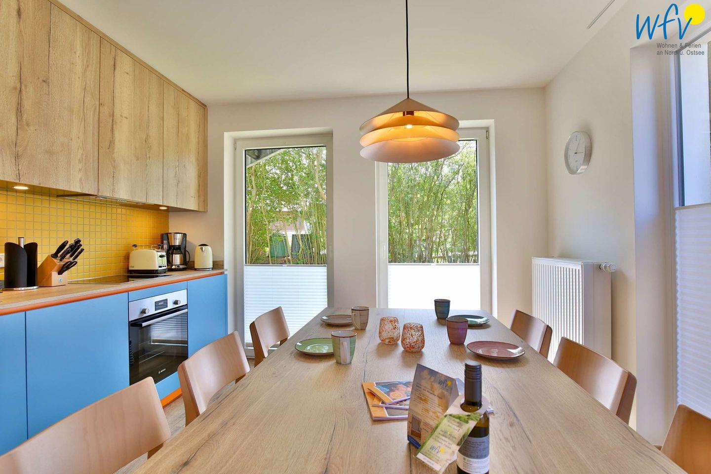 Schlicht und elegant lädt das Wohnzimmer mit Küche, Sofa und großem Esstisch zum Relaxen, zu gemütlichen Fernsehabenden und zu gemeinsamen Mahlzeiten ein. Von hier aus gelangen Sie auf die große Terrasse. Die Küche der Ferienwohnung "Welle" ist bestens ausgestattet und lässt auch im Urlaub die Kochfreunde zur wahren Gourmets werden.