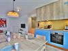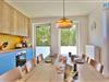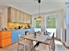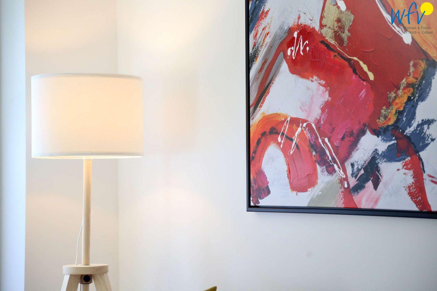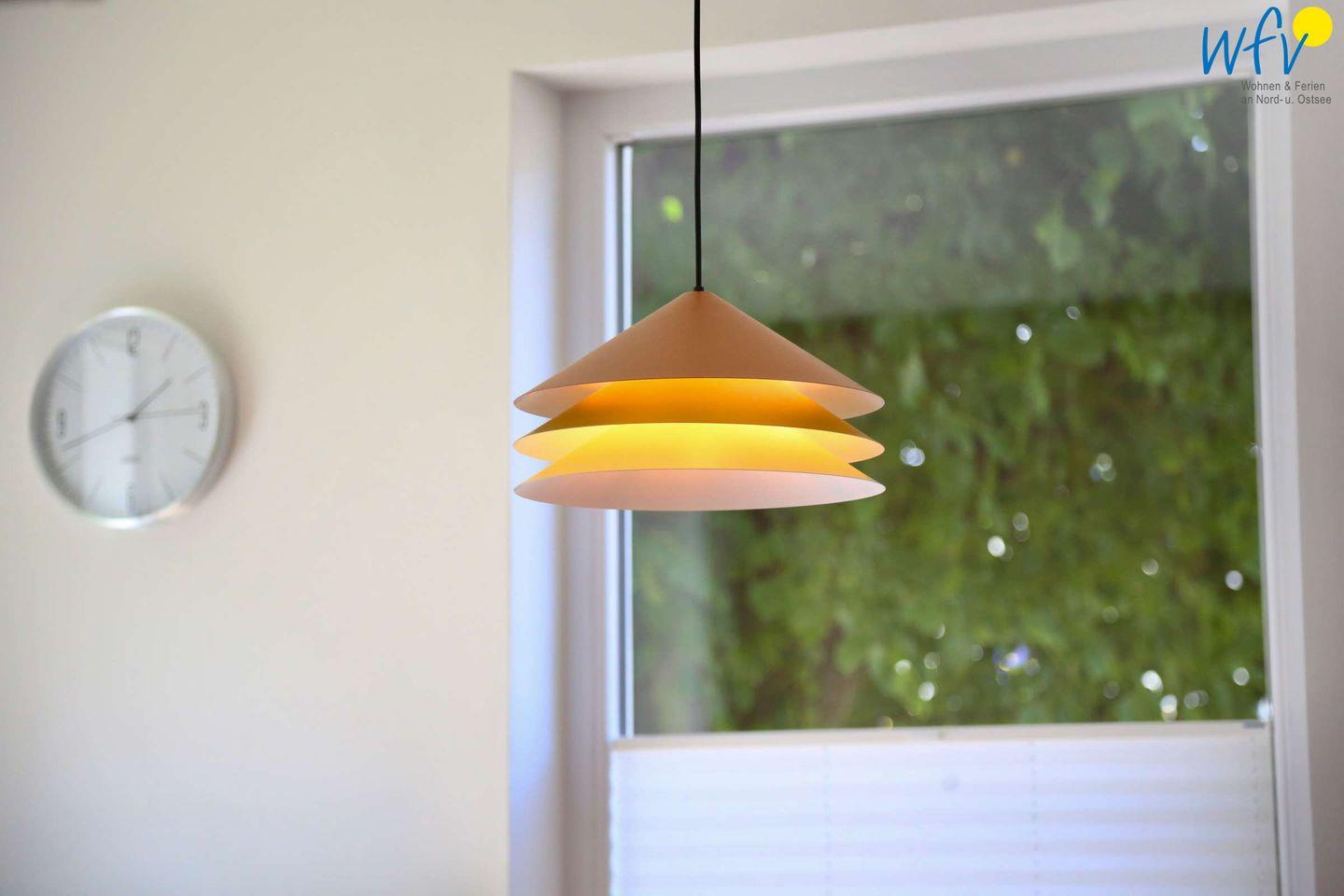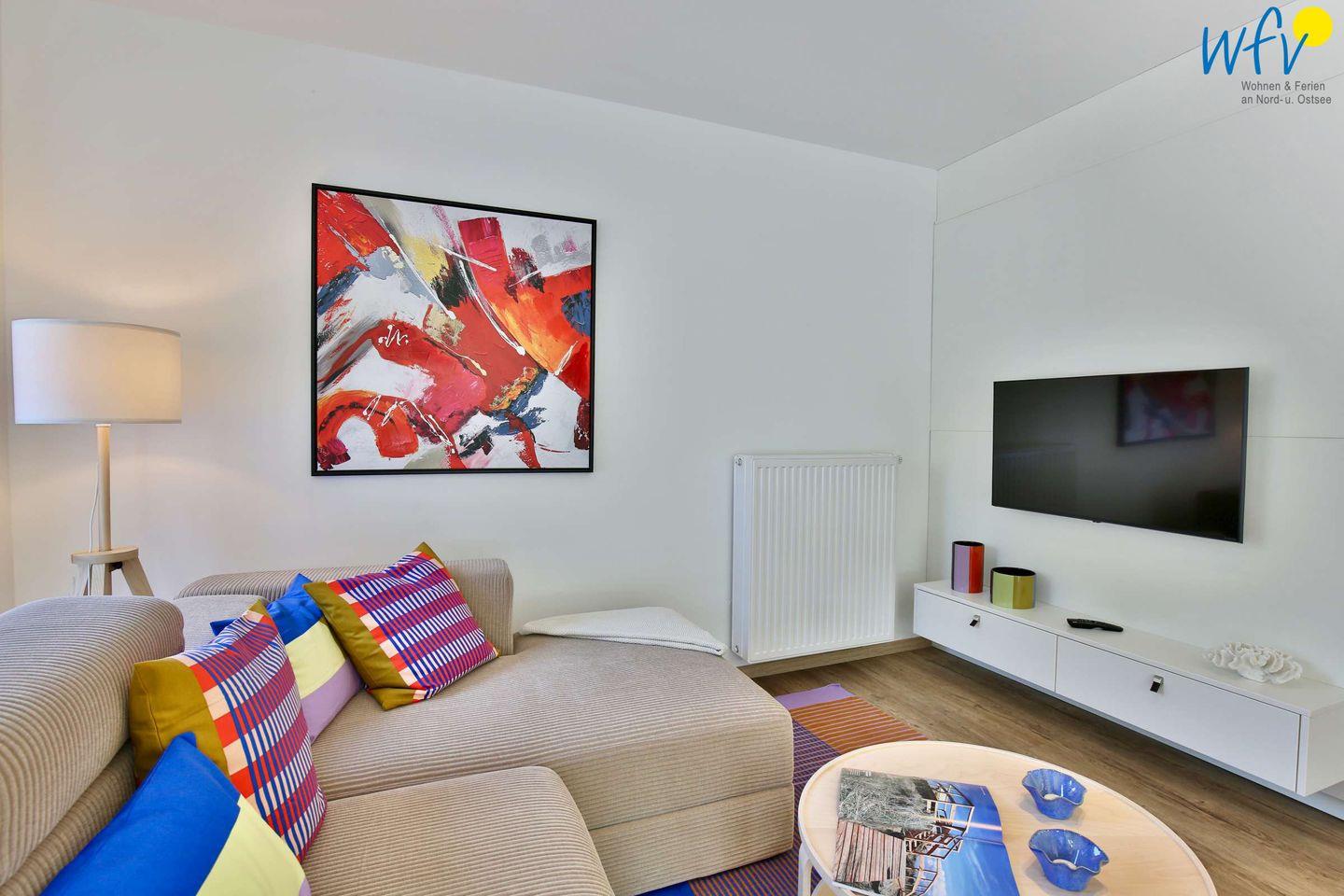 Schlicht und elegant lädt das Wohnzimmer mit Küche, Sofa und großem Esstisch zum Relaxen, zu gemütlichen Fernsehabenden und zu gemeinsamen Mahlzeiten ein. Von hier aus gelangen Sie auf die große Terrasse. Die Küche der Ferienwohnung "Welle" ist bestens ausgestattet und lässt auch im Urlaub die Kochfreunde zur wahren Gourmets werden.