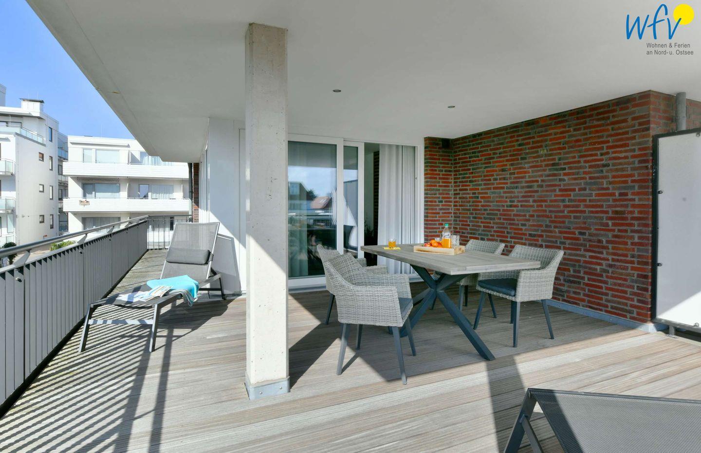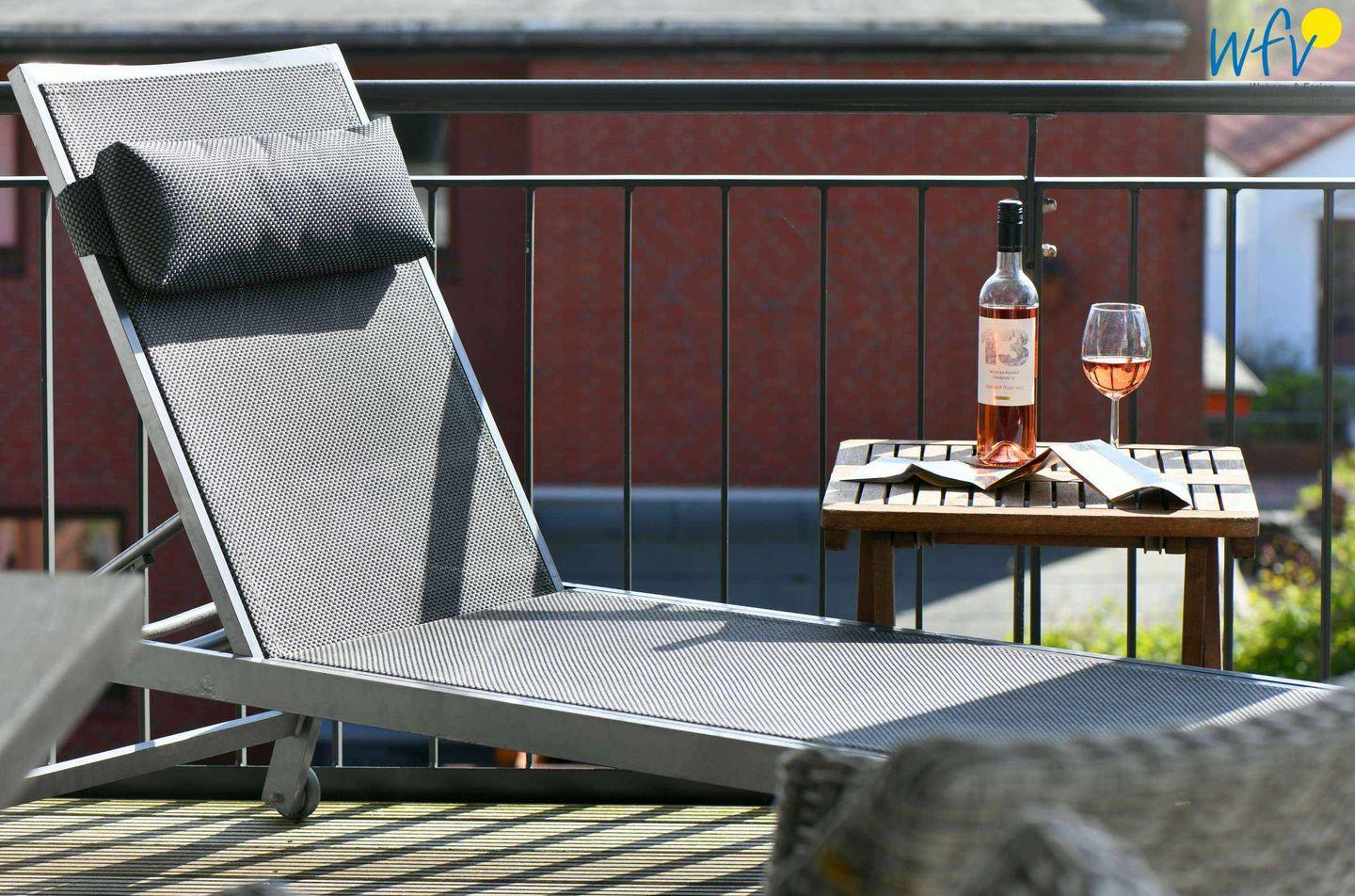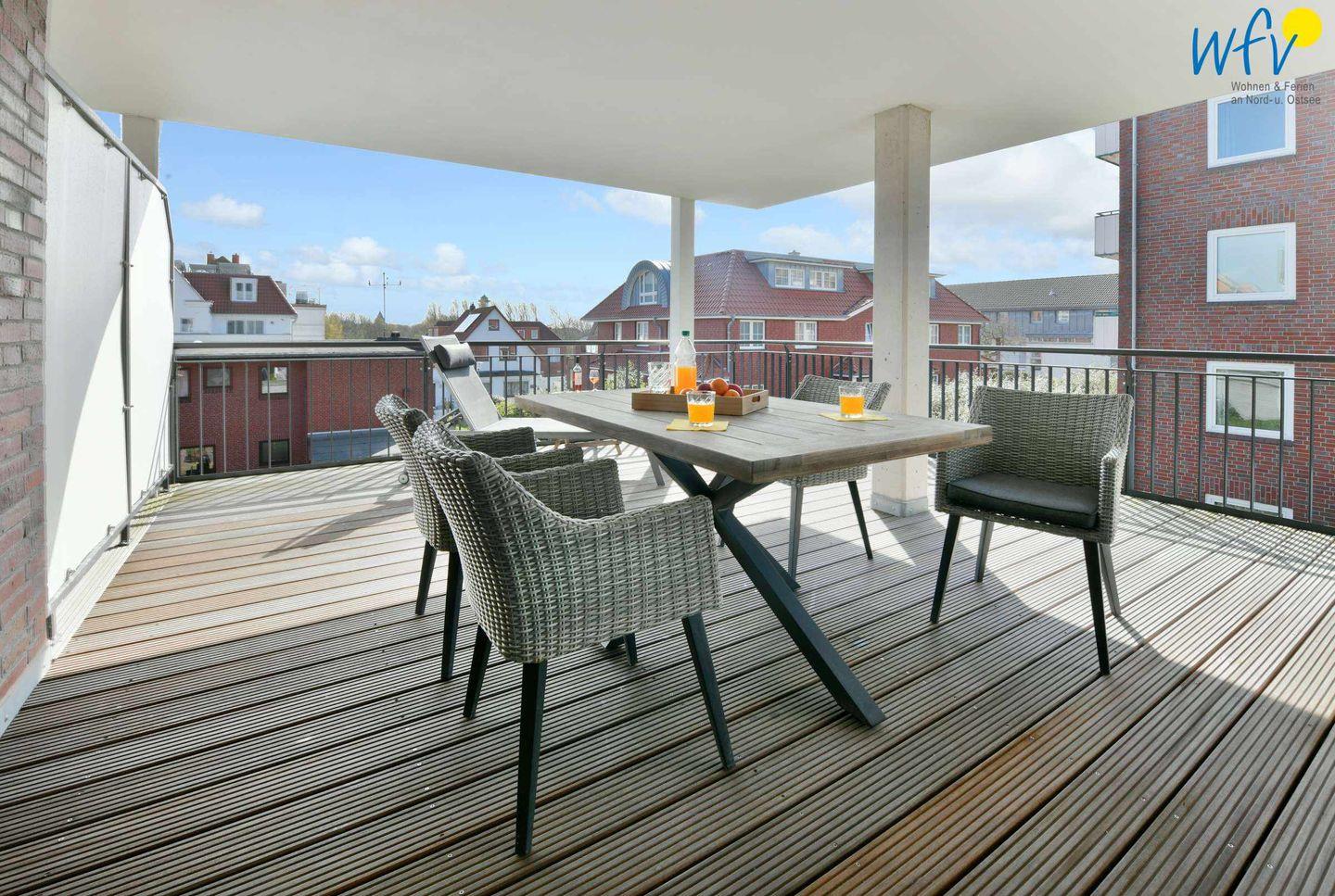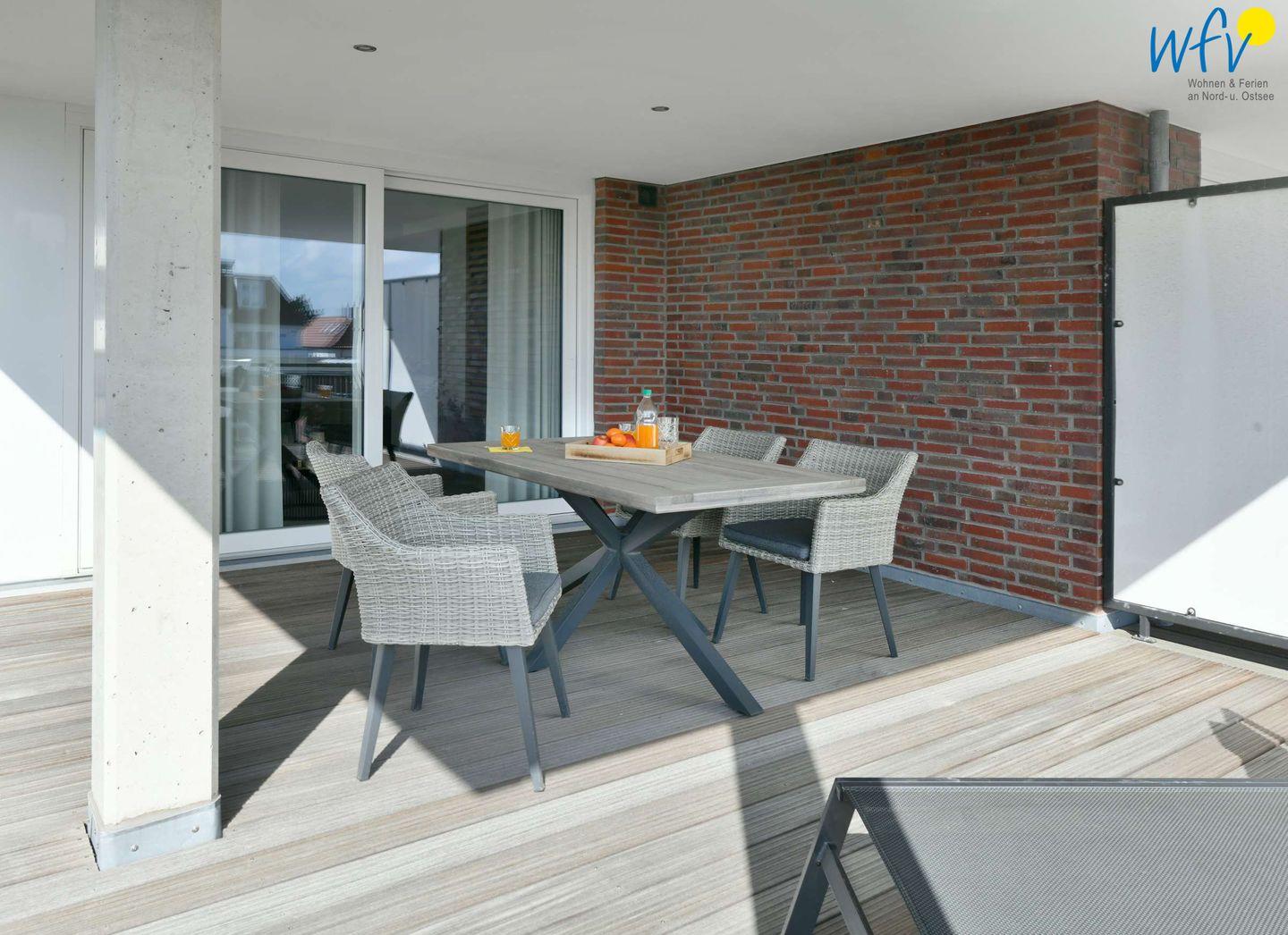 Das Bonbon der Ferienwohnung ist die sehr große überdachte Dachterrasse, auf der Sie traumhaft entspannte Stunden verbringen können! Eine Sitzgruppe und zwei Sonnenliegen laden dazu ein, gemeinsame Mahlzeiten im Freien zu genießen, sich mit einem spannenden Buch zurückzuziehen oder den Abend bei einem guten Glas Wein ausklingen zu lassen. Ein herrliches Urlaubsgefühl!
