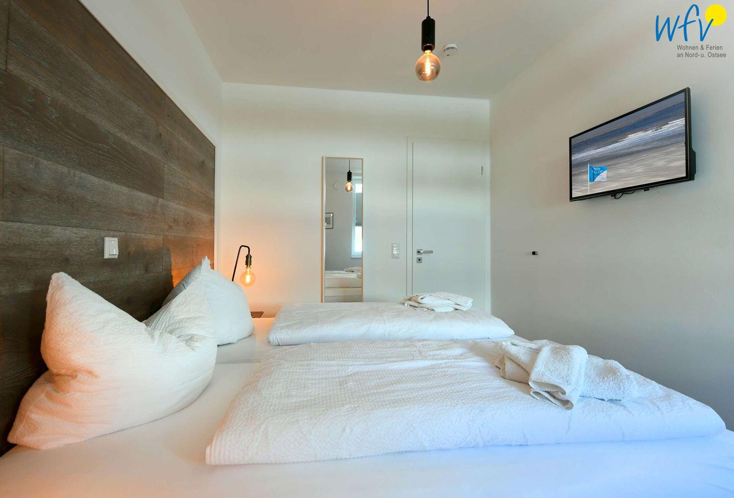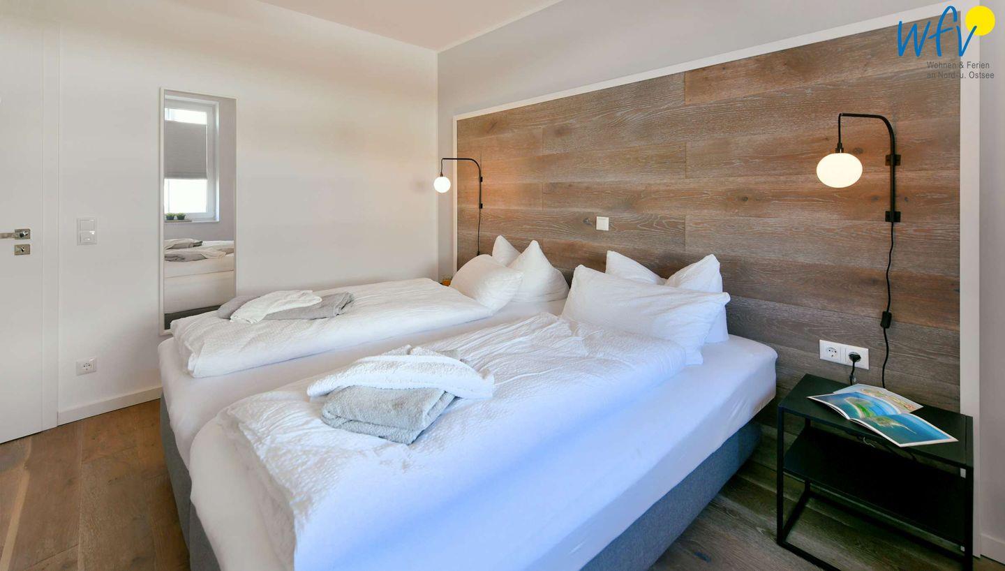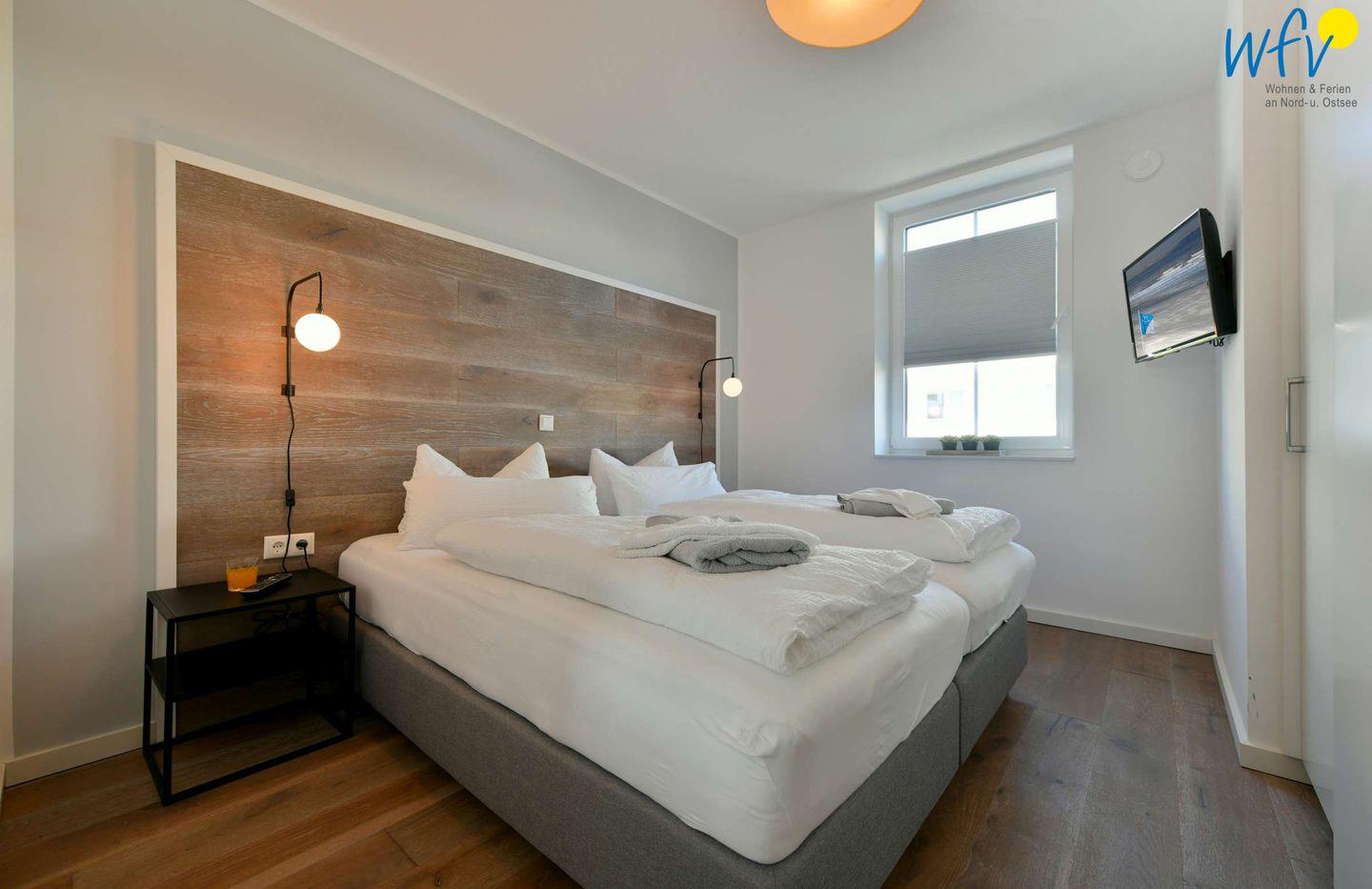 Zwei separate Schlafzimmer in edlem Design bieten Ihnen in der Ferienwohnung angenehme Rückzugsmöglichkeiten. Beide Zimmer sind jeweils mit einem komfortablen Doppelbett ( 2 x 90 cm x 200 cm), einem Kleiderschrank und einem TV ausgestattet.