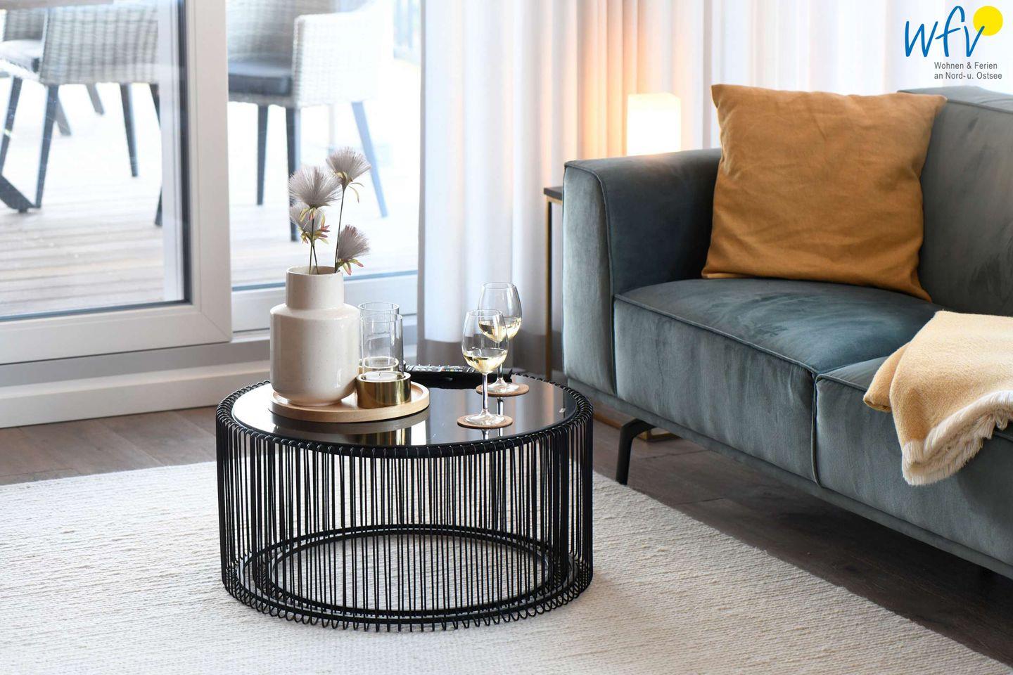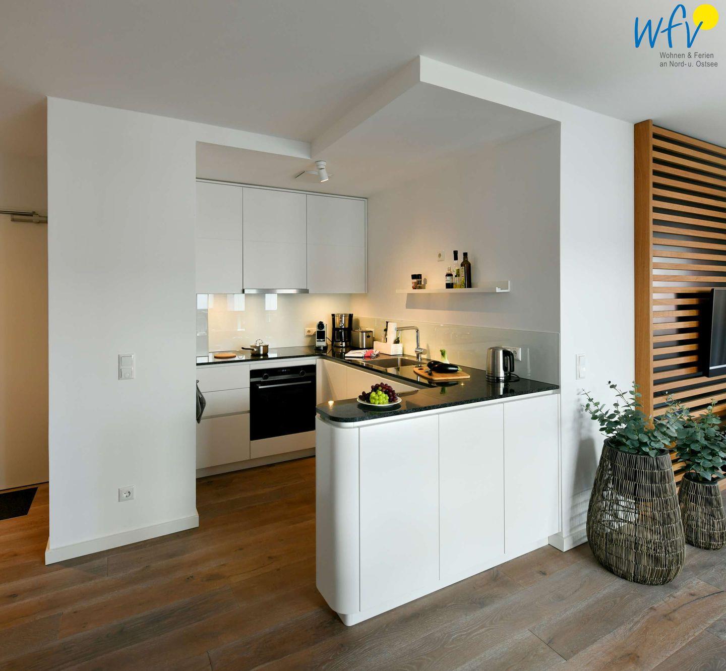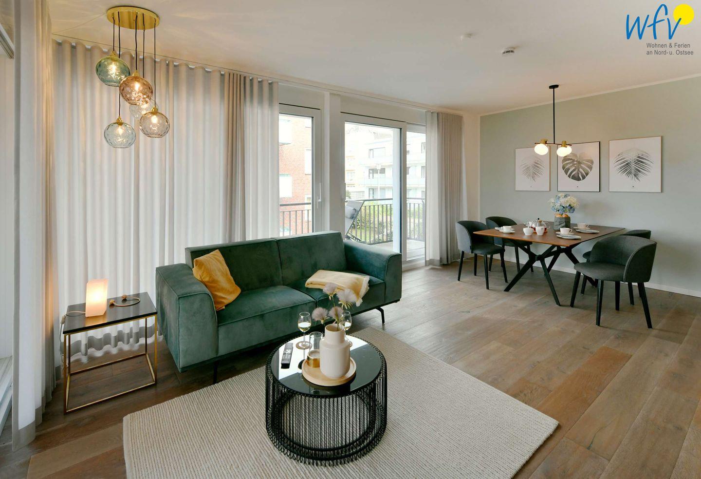 Breite Fensterfronten mit schönem Lichteinfall sowie eine optimale Raumaufteilung mit Wohnraum, offener Küche und zwei separaten Schlafzimmern sorgen für ein weites Raumgefühl. Eine hochwertige Einrichtung und stilvolle Accessoires entfalten ein modernes Ambiente mit sehr geschmackvoller Farbgestaltung. Klare Formen korrespondieren mit edlen Materialien; eine Fußbodenheizung, Parkett und Dielen verleihen der Ferienwohnung die entsprechende Gemütlichkeit.