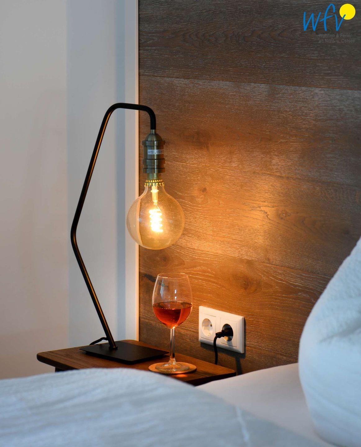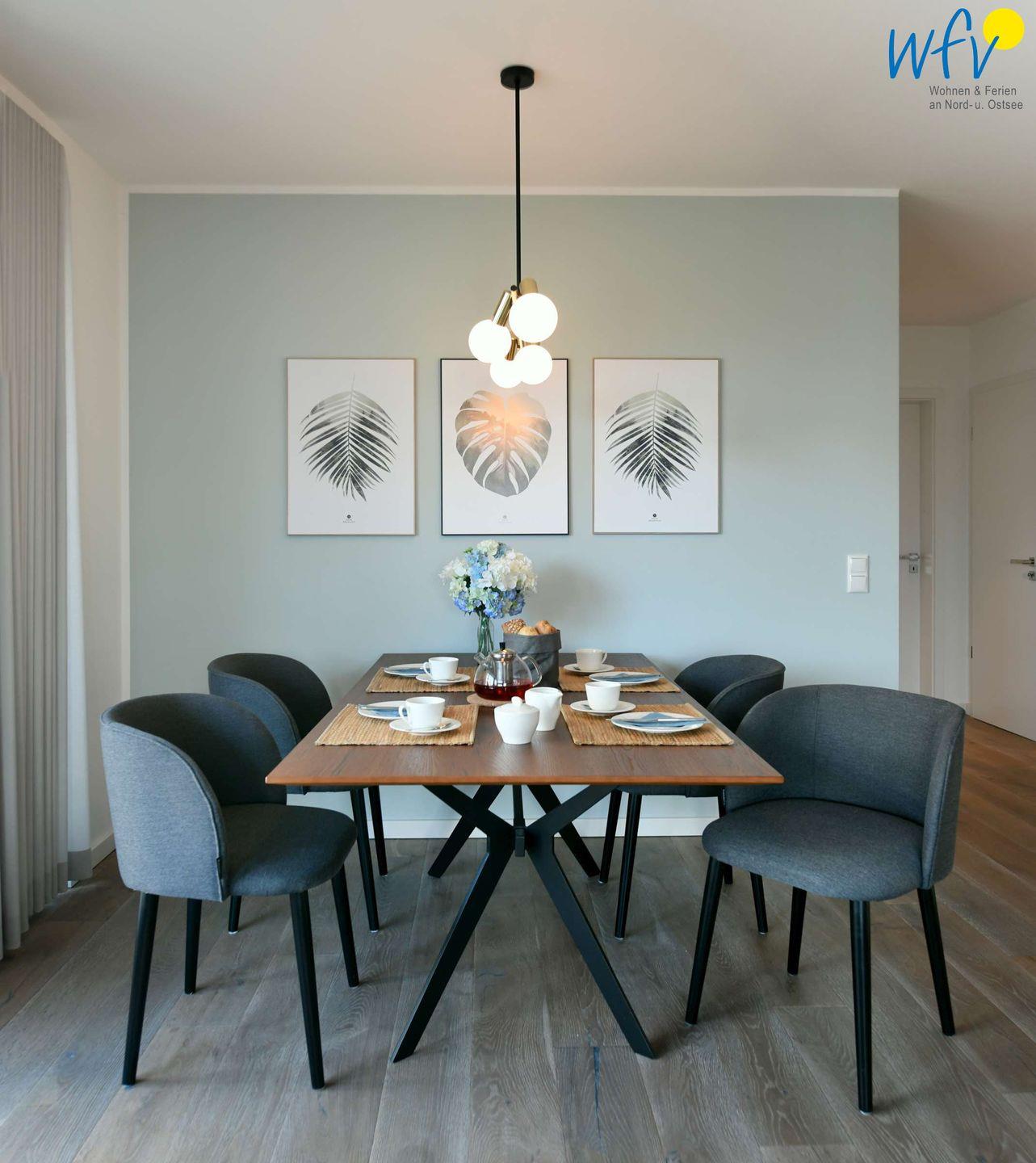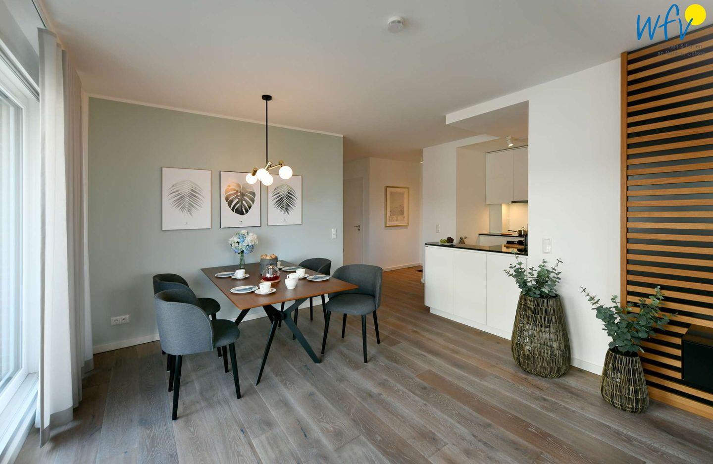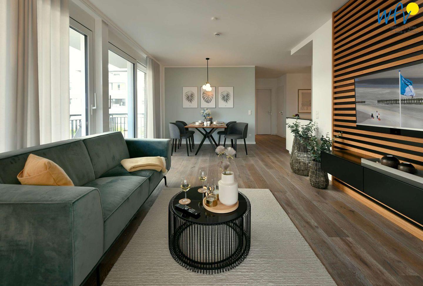 Breite Fensterfronten mit schönem Lichteinfall sowie eine optimale Raumaufteilung mit Wohnraum, offener Küche und zwei separaten Schlafzimmern sorgen für ein weites Raumgefühl. Eine hochwertige Einrichtung und stilvolle Accessoires entfalten ein modernes Ambiente mit sehr geschmackvoller Farbgestaltung. Klare Formen korrespondieren mit edlen Materialien; eine Fußbodenheizung, Parkett und Dielen verleihen der Ferienwohnung die entsprechende Gemütlichkeit.