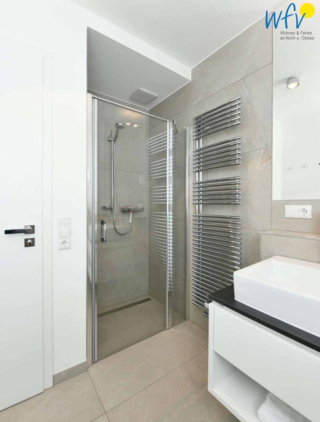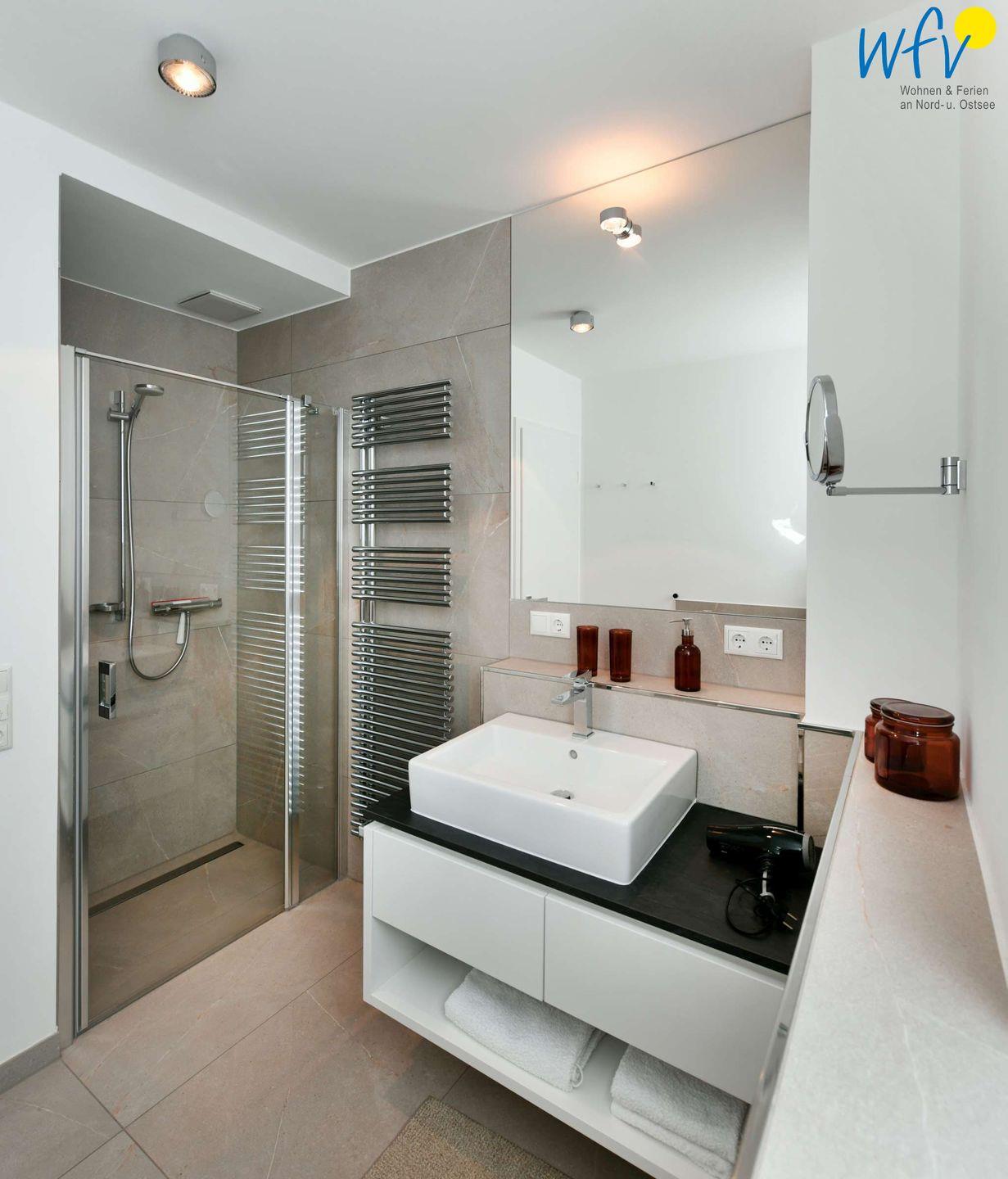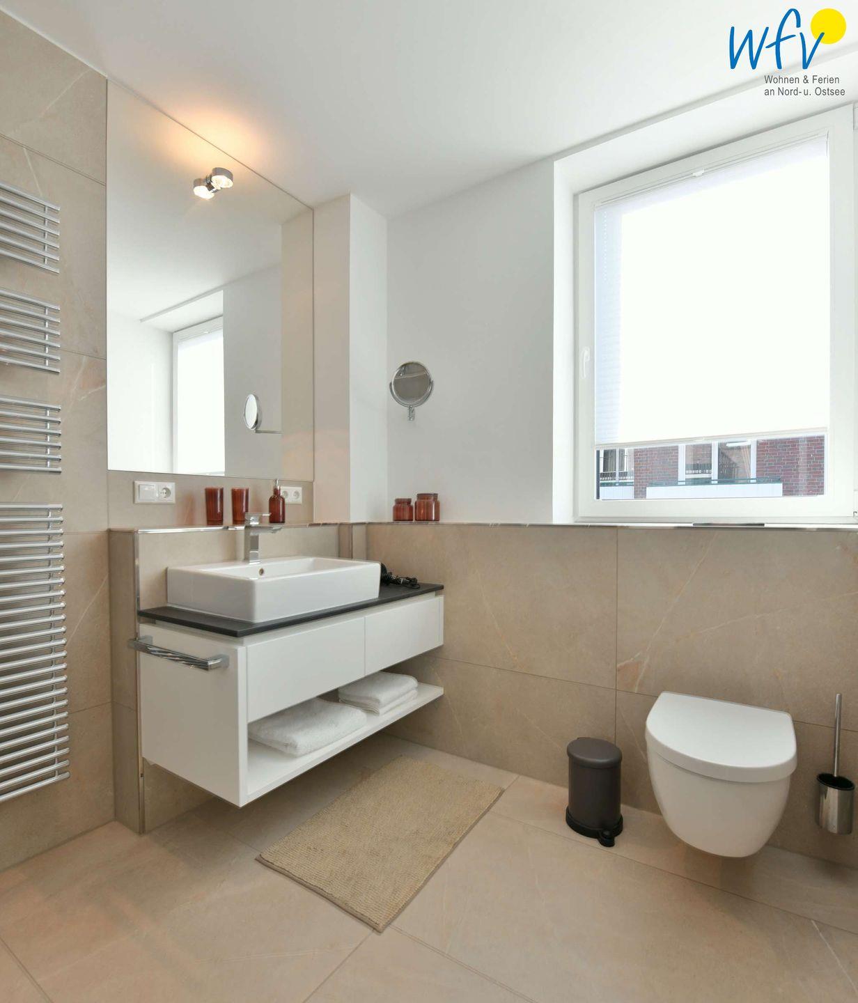 Weiteren Wohnkomfort bietet Ihnen das elegante Tageslichtbad. Eine Glasdusche, ein breiter Waschtisch mit großem Spiegel, sanfte Deckenstrahler sowie eine Handtuch- und eine Fußbodenheizung sorgen für Behaglichkeit.