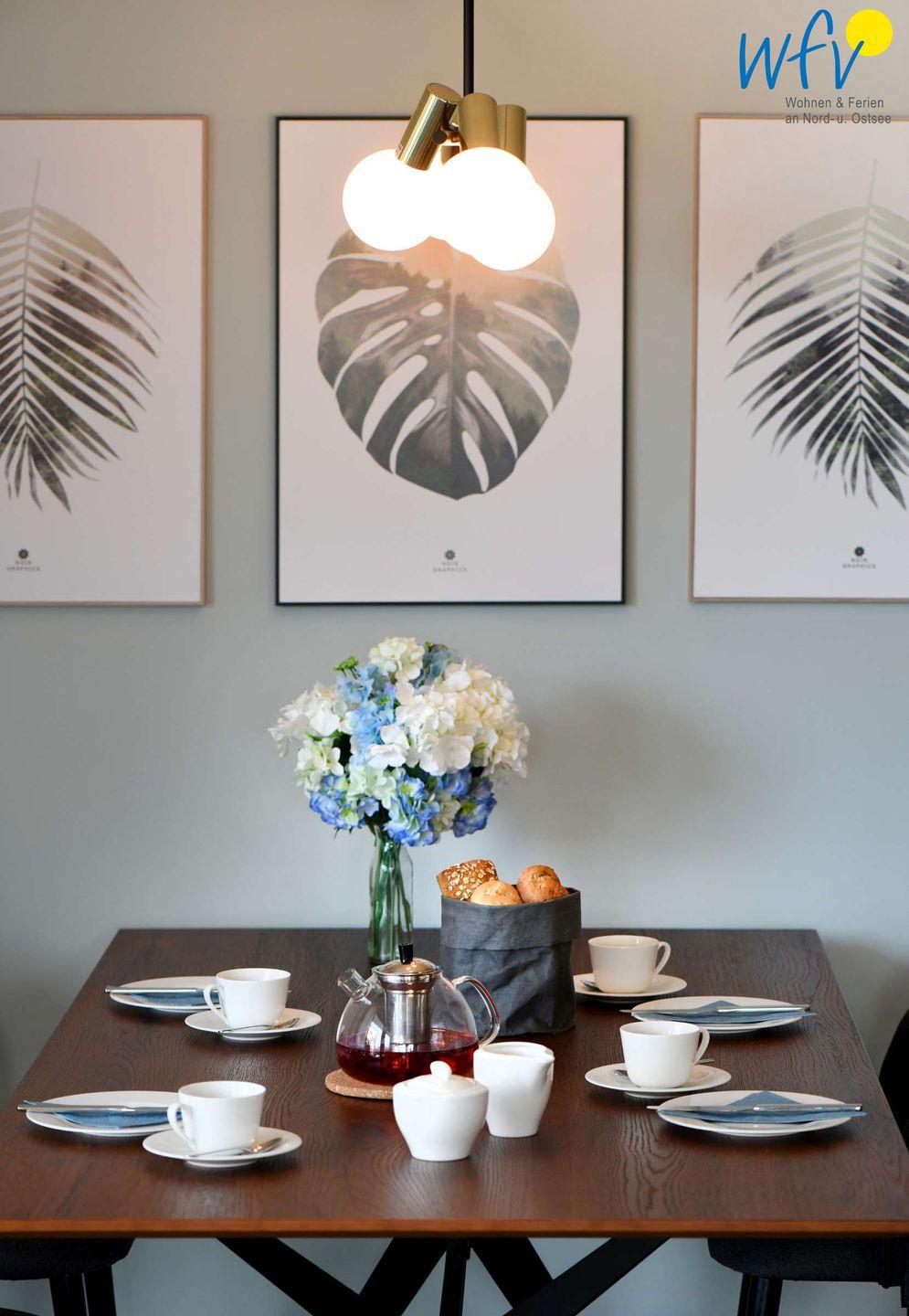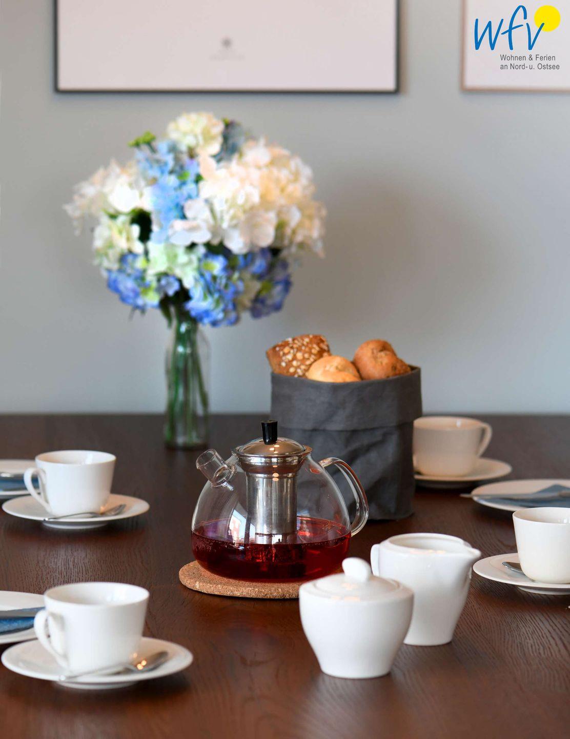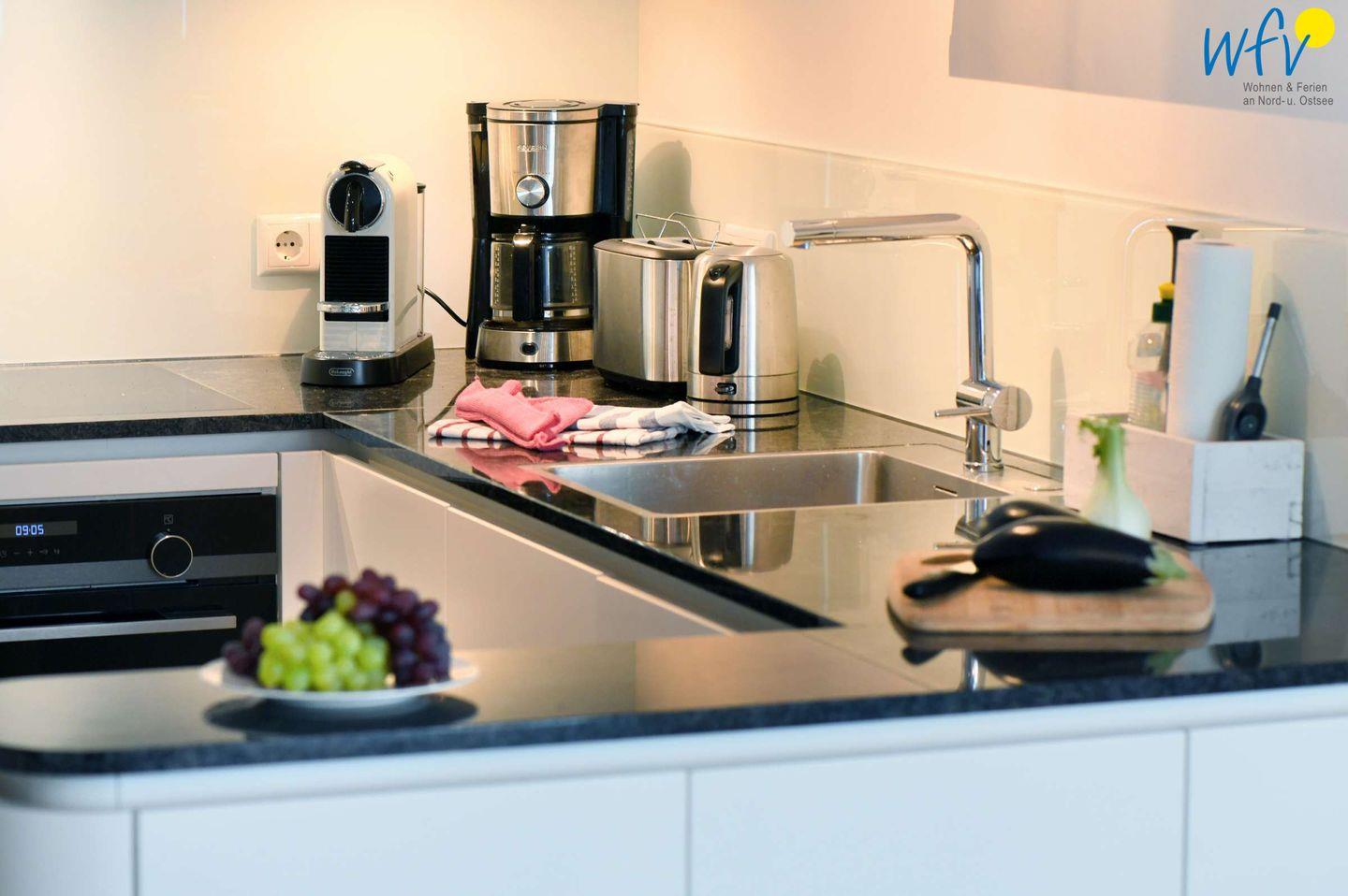 Der große Esstisch lädt zum ausgiebigen Ferienfrühstück ein. Frischer Kaffee, warmes Toast und gekochte Eier lassen sich bequem in der modernen integrierten Küche zubereiten. Kaffeeliebhaber wählen zwischen der klassischen Kaffeemaschine und einer Nespresso Maschine. So können Sie ganz gemütlich den bevorstehenden Urlaubstag auf Wangerooge planen - mit Fahrradtour, Strandspaziergang oder Badetag.