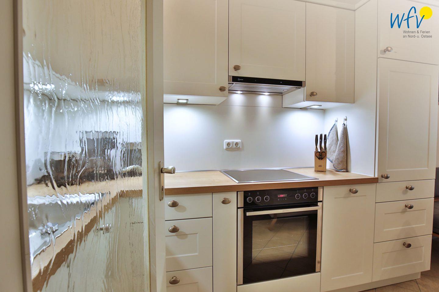 Das Ferienfrühstück, Snacks für den Ausflug oder das leckere Abendessen können Sie schnell und einfach in der modernen Küche zubereiten. Sie verfügt u.a. über einen Ceranherd, einen Backofen und eine Spülmaschine sowie über diverse Kleingeräte wie Kaffeemaschine, Wasserkocher und Toaster. Die Schränke in der Küche sind beleuchtet und werden durch einen Sensor unter dem Schrank eingeschaltet.