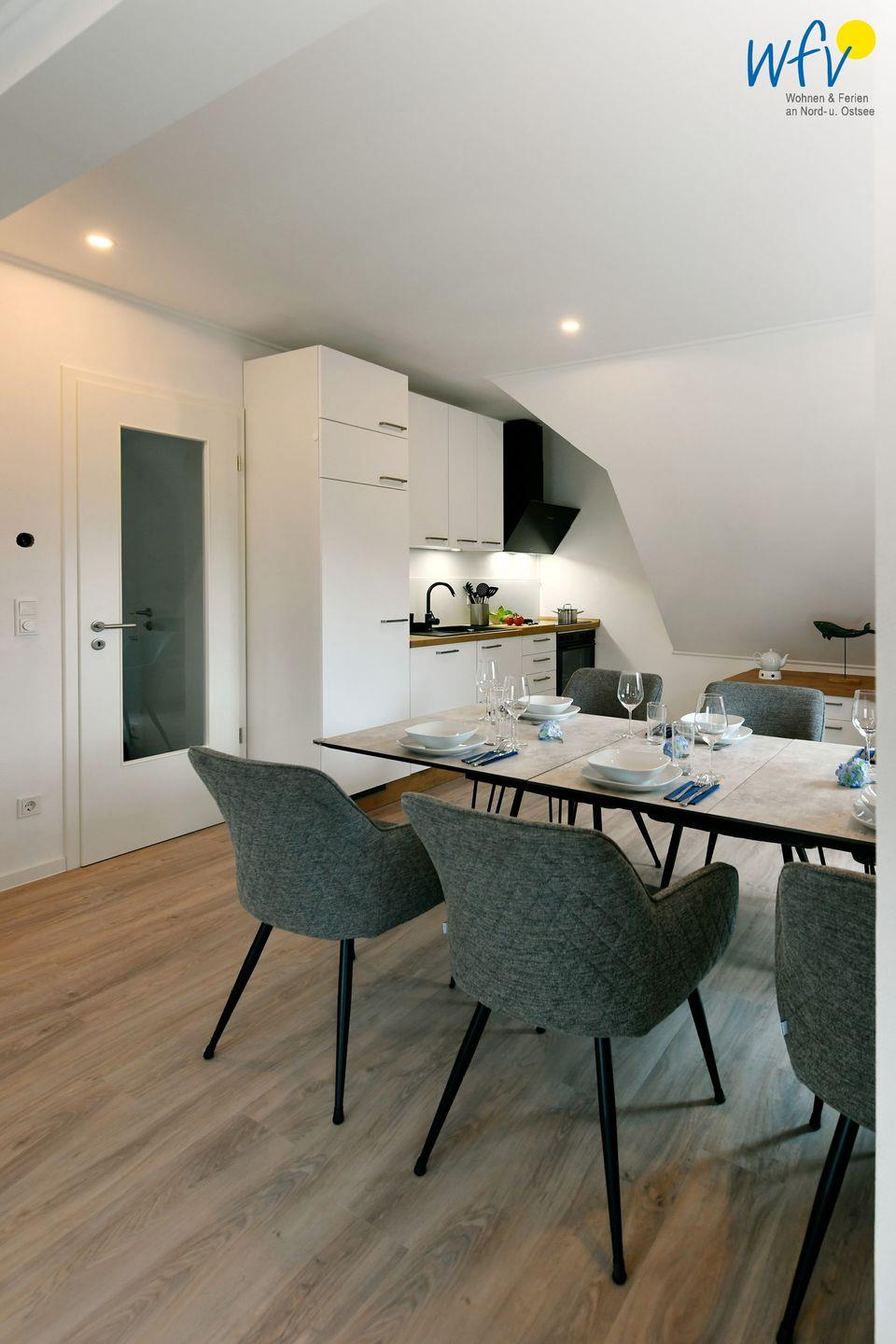 In dieser komfortablen Dachgeschosswohnung haben Sie Platz mit bis zu 8 Personen - perfekt für den Urlaub mit der großen Familie oder mit Freunden! Auf der ersten 1. Etage erwartet Sie ein großzügiger Wohnraum mit Couchecke und Essbereich, eine moderne offene Küche, zwei separate Schlafzimmer, ein Duschbad und ein Abstellraum sowie ein sonniger Balkon mit Südausrichtung. Im Spitzboden befinden sich zwei weitere Schlafzimmer und ein Gäste-WC mit niedriger Dusche.