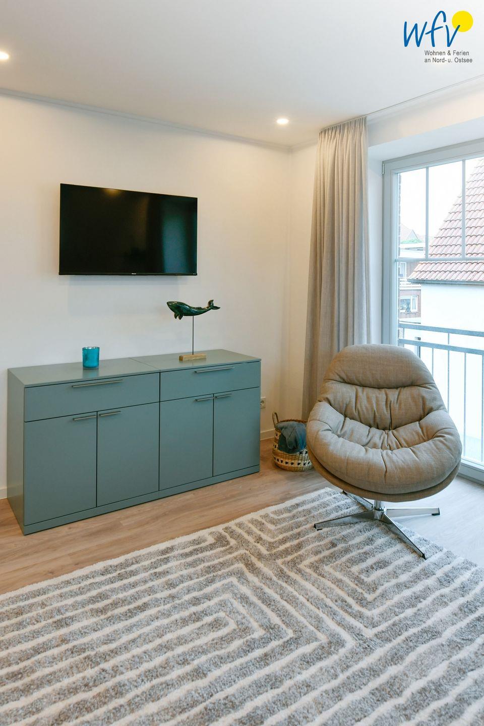 Nach dem Strandtag oder der Fahrradtour lädt der Wohnraum mit Couch, Relaxsessel und modernem TV zu entspannten Stunden ein.