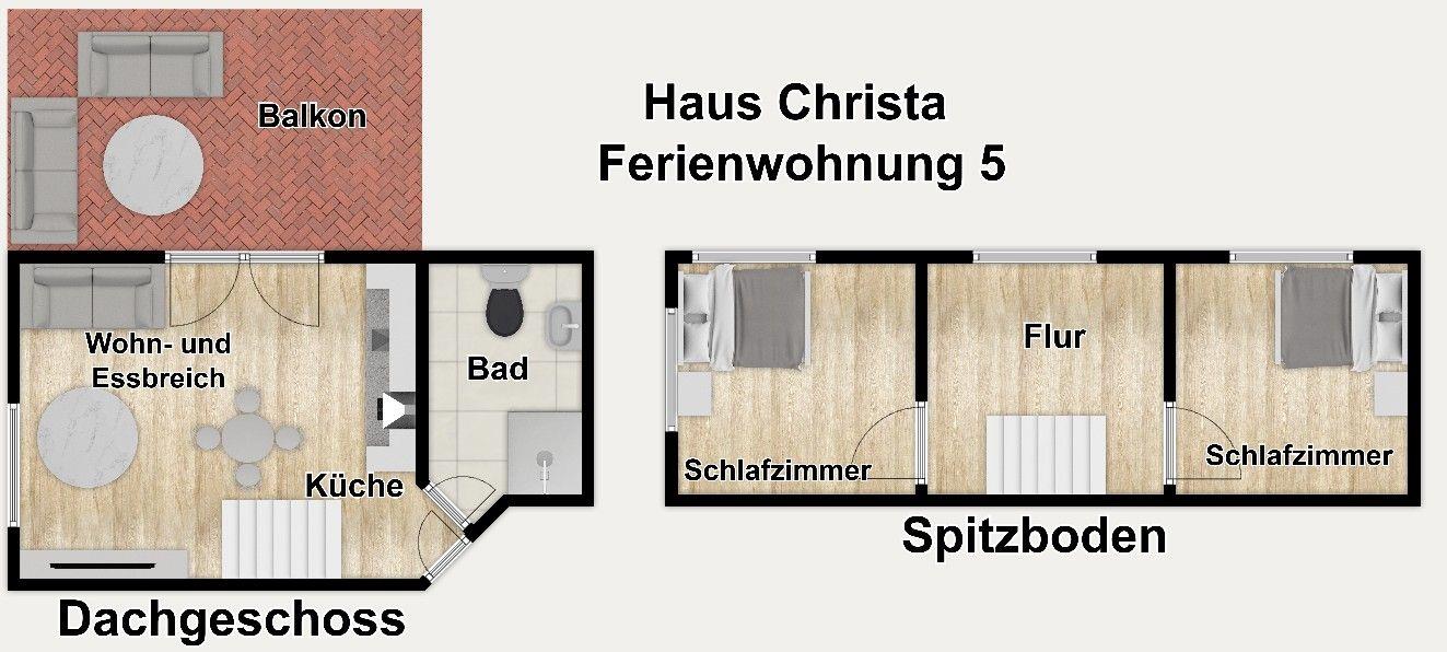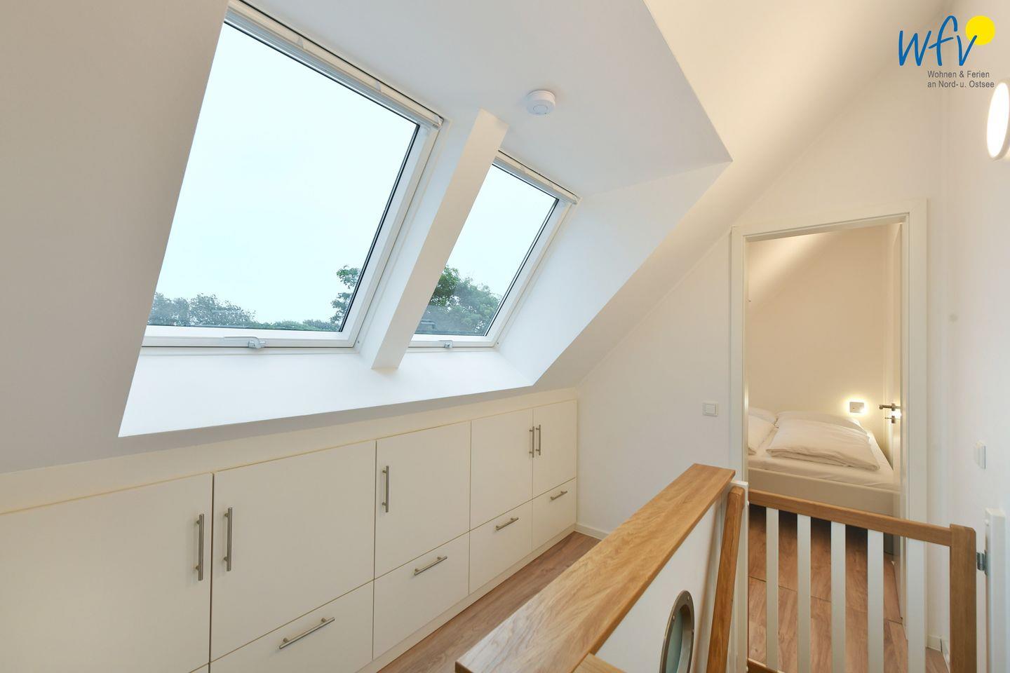Angenehme Rückzugsmöglichkeiten bieten Ihnen zwei separate Schlafzimmer im Spitzboden. Sie sind mit einem komfortablen Doppelbett (160 cm x 200 cm) bzw. einem Einzelbett ausgestattet (90 x 200 cm; mit Auszug 80 cm x 190 cm). Für Ihre Urlaubsgarderobe befindet sich im Flur zwischen den Schlafzimmern ein geräumiger Kleiderschrank. Aufhängevorrichtungen mit Bügeln gibt es in den Einbauschränken unter der Treppe. Auf der bequemen Schlafcouch im Wohnzimmer können zwei weitere Personen schlafen.