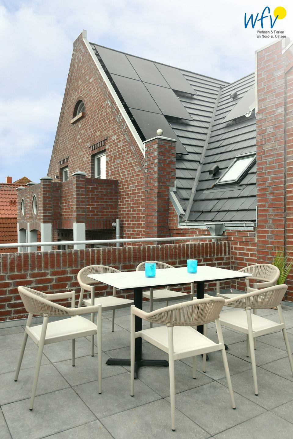 Wohltuende Nordseeluft genießen Sie auf der großen sonnigen Dachterrasse. Hier können Sie wunderbar zusammensitzen, ausspannen und die Seele baumeln lassen - ein herrliches Urlaubsgefühl!
