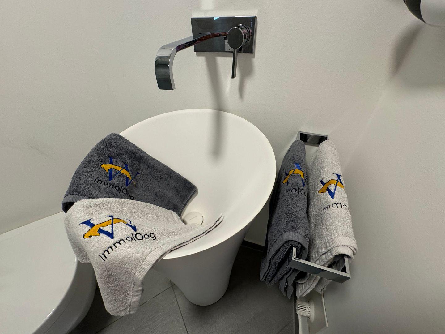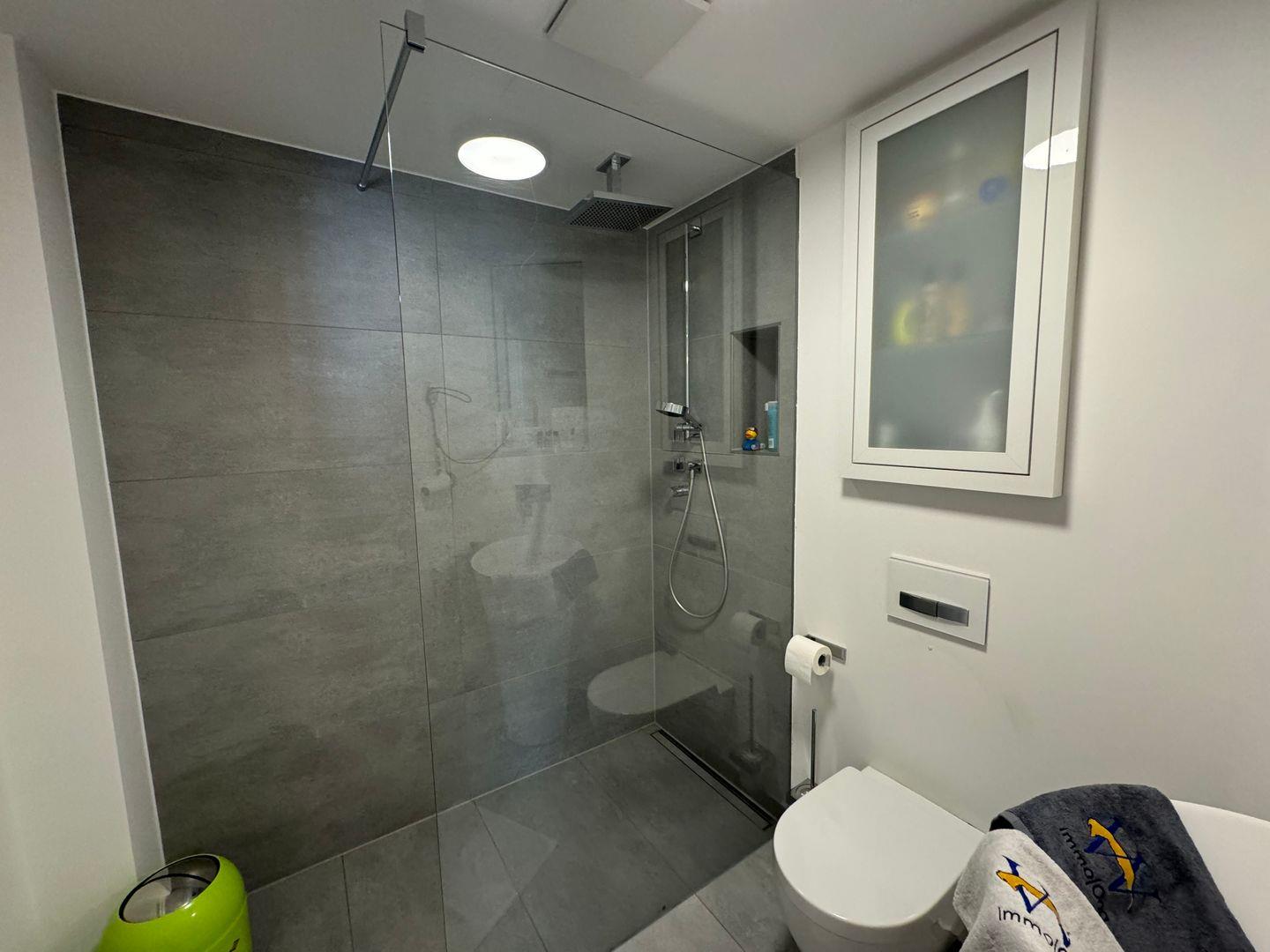 Badezimmer: Modernes Badezimmer mit bodengleicher Dusche, Waschbecken und WC.