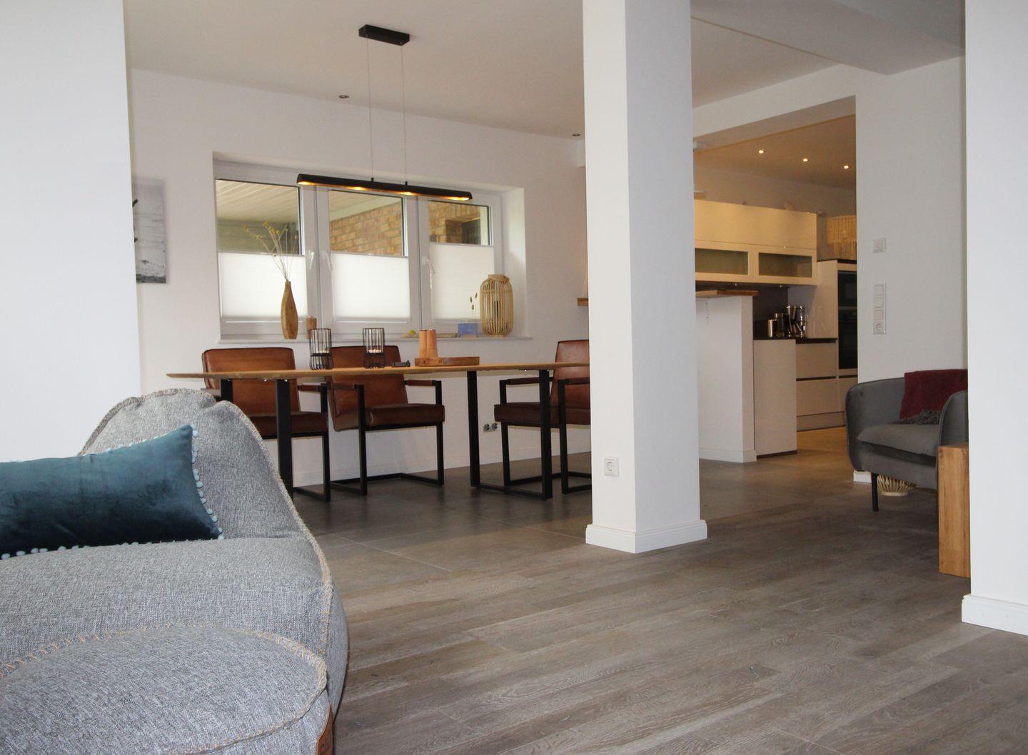 Sehr großer offener Wohnraum mit großem Sofa, smart-TV und gemütlichen Leseecken, offene Küche mit Zugang zur Terrasse, zwei Schlafzimmer , eines davon als gemütliches Nest ins Wohnzimmer integriert (siehe Foto, Verdunkelungsvorhang ), zwei Duschbäder, sehr gut ausgestattete Küche mit großem Esstisch und Ledersesseln, zusätzliche Bar, Kaffeevollautomat und einer Sauna.