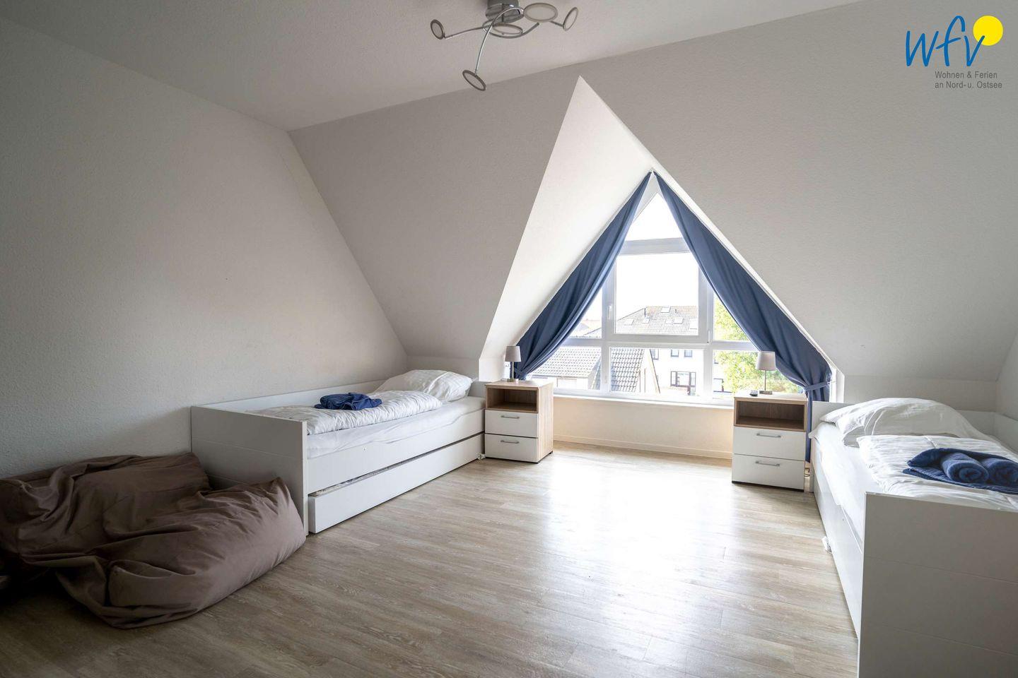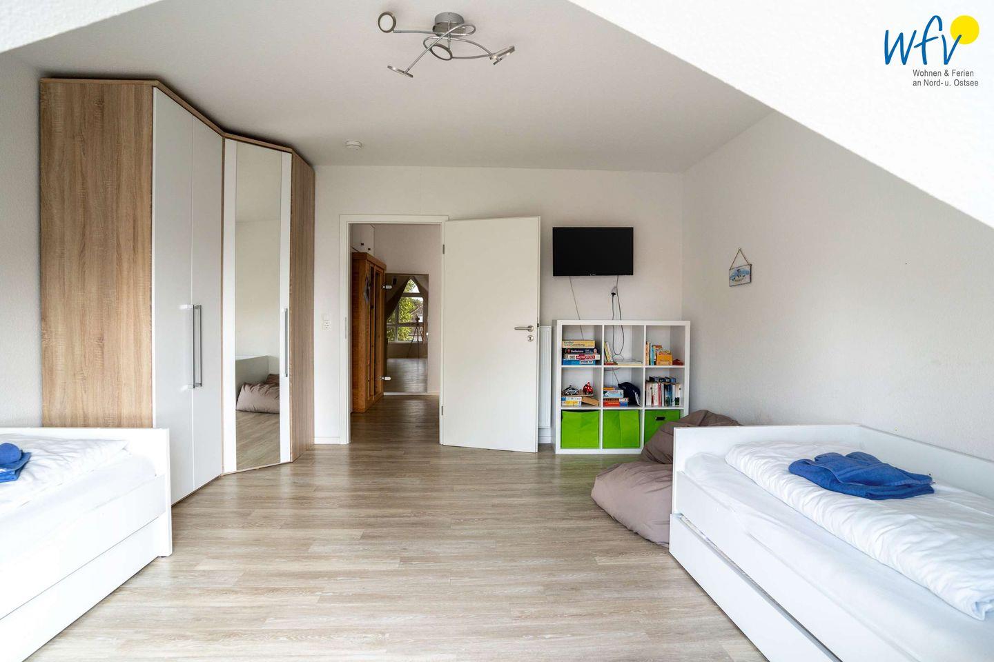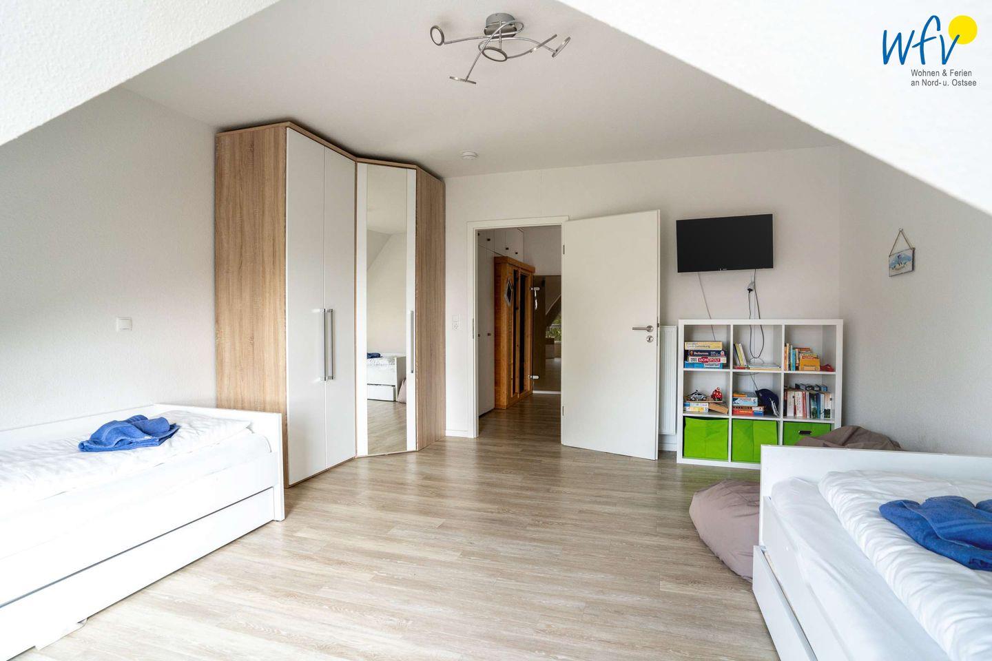 Durch zwei separate Schlafzimmer bestehen angenehme Rückzugsmöglichkeiten. Eines der Zimmer befindet sich im Obergeschoss und ist mit einem Doppelbett ausgestattet (1,80 x 2 m), das andere Zimmer liegt im Dachgeschoss und verfügt über drei Einzelbetten oder wahlweise ein Doppel- und ein Einzelbett (0,90 x 2 m). Für unsere kleinen Gäste besteht hier viel Platz zum Spielen. Diverse Spiele, Autos und Lego sind ebenfalls vorhanden.