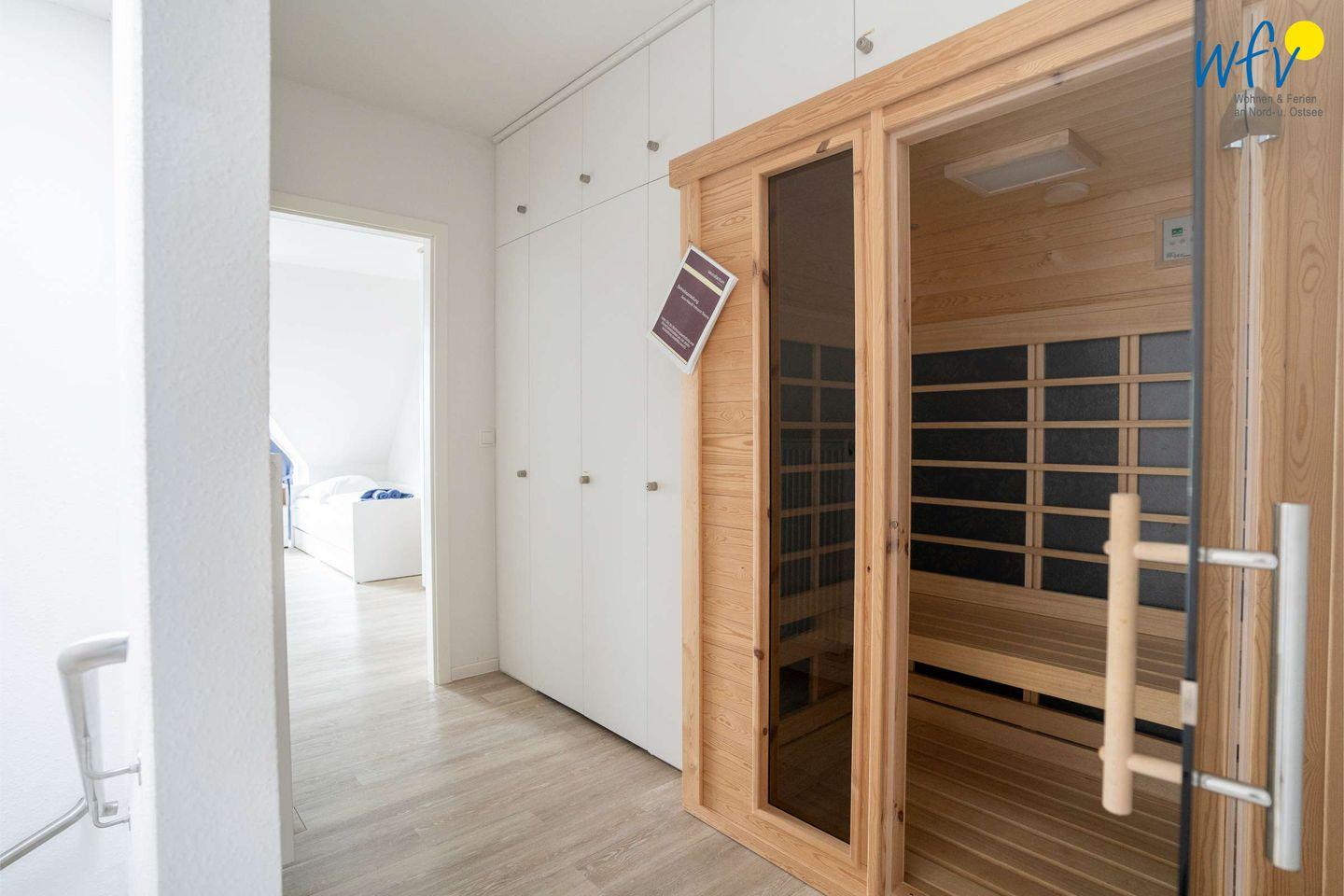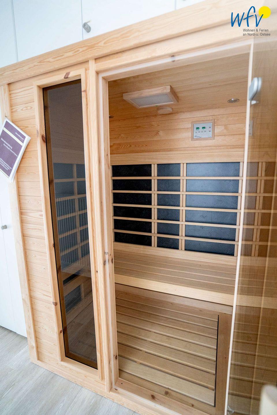 Die wohnungseigene Infrarot-Sauna verwöhnt Sie mit wohltuender Entspannung nach dem Strandspaziergang! Zwei Duschbäder mit Fußbodenheizung (OG + DG) sorgen für zusätzlichen Wohnkomfort.