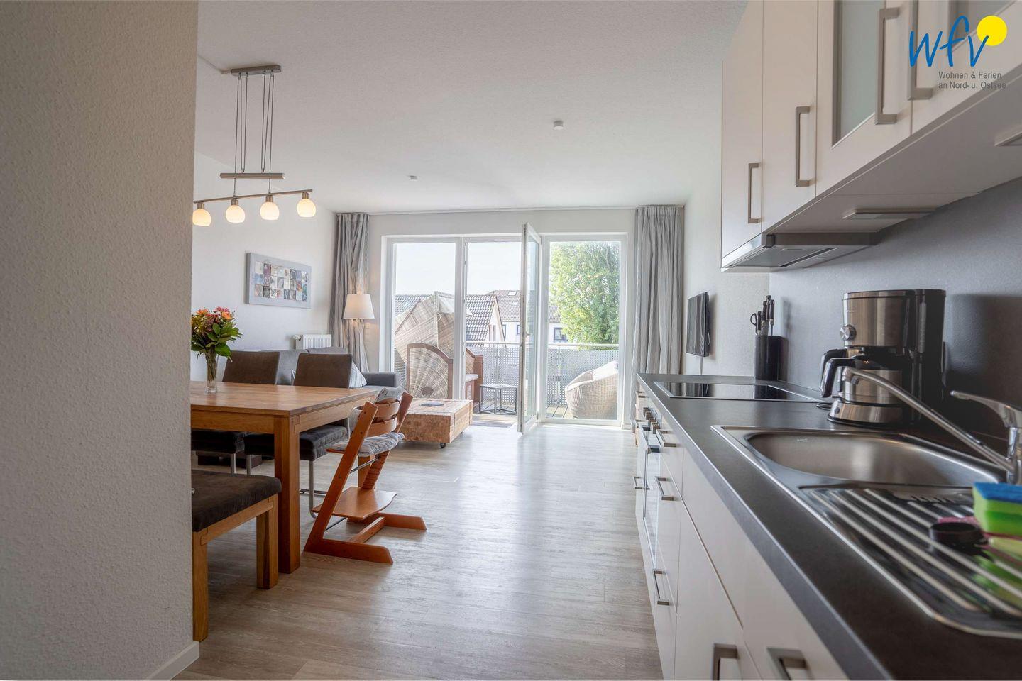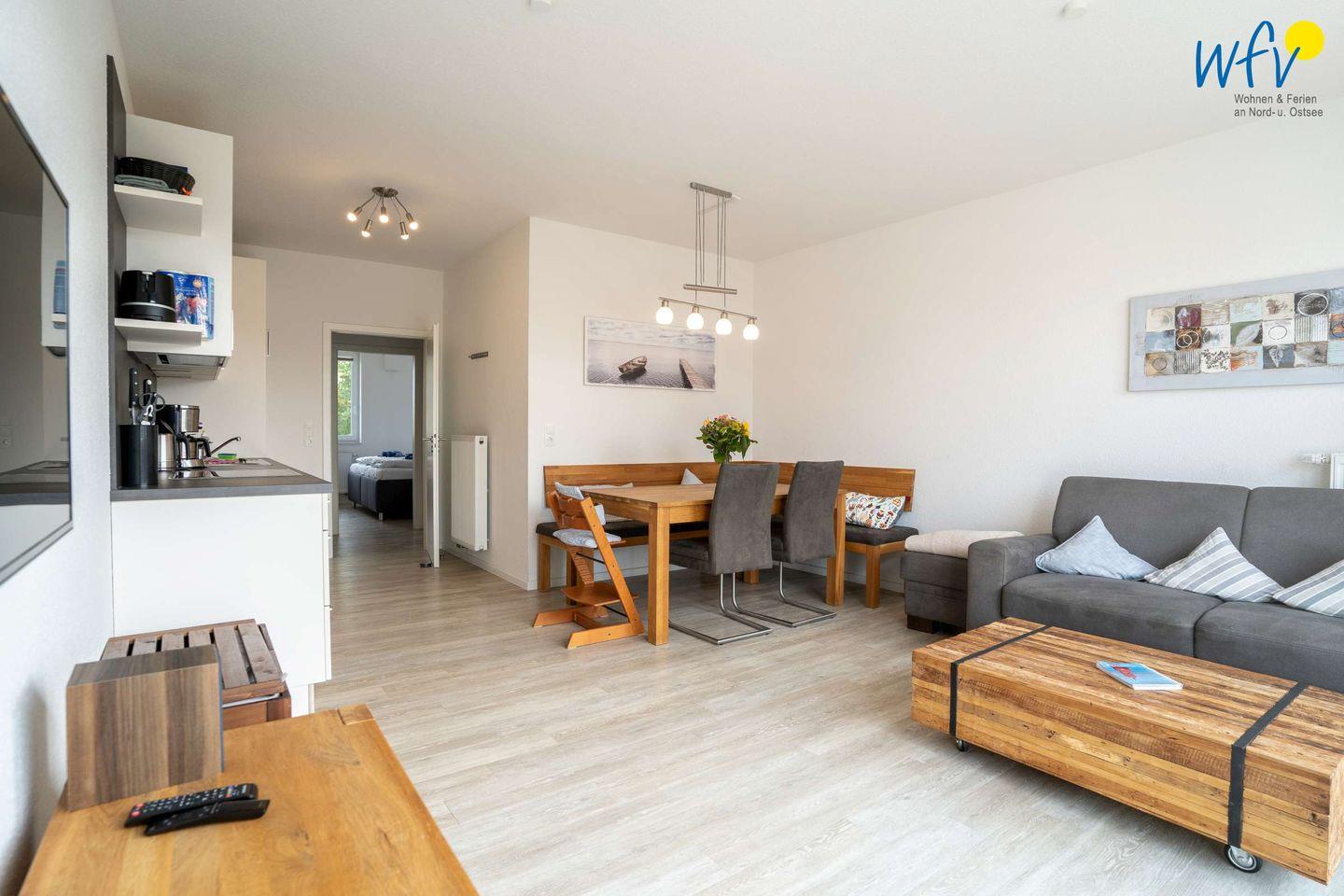 Die 86 m² große Ferienwohnung bietet Ihnen auf zwei Etagen (1. OG und DG) eine großzügige Wohnatmosphäre für bis zu fünf Personen. Im Obergeschoss erwartet Sie ein Wohnraum, der mit einer gemütlichen Couchecke und einem Esstisch eingerichtet ist. Hier können Sie wunderbar gemeinsame Stunden verbringen. Die moderne integrierte Einbauküche verfügt u.a. über einen Ceranherd mit Backofen, eine Mikrowelle und eine Geschirrspülmaschine. Auch für ein leckeres Waffelbacken am Nachmittag und für gesellige Raclette-Abende sind entsprechende Geräte vorhanden.