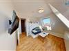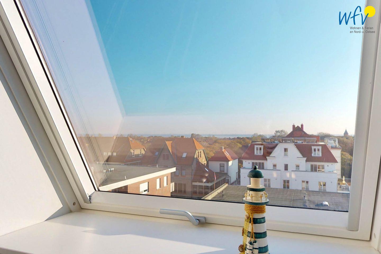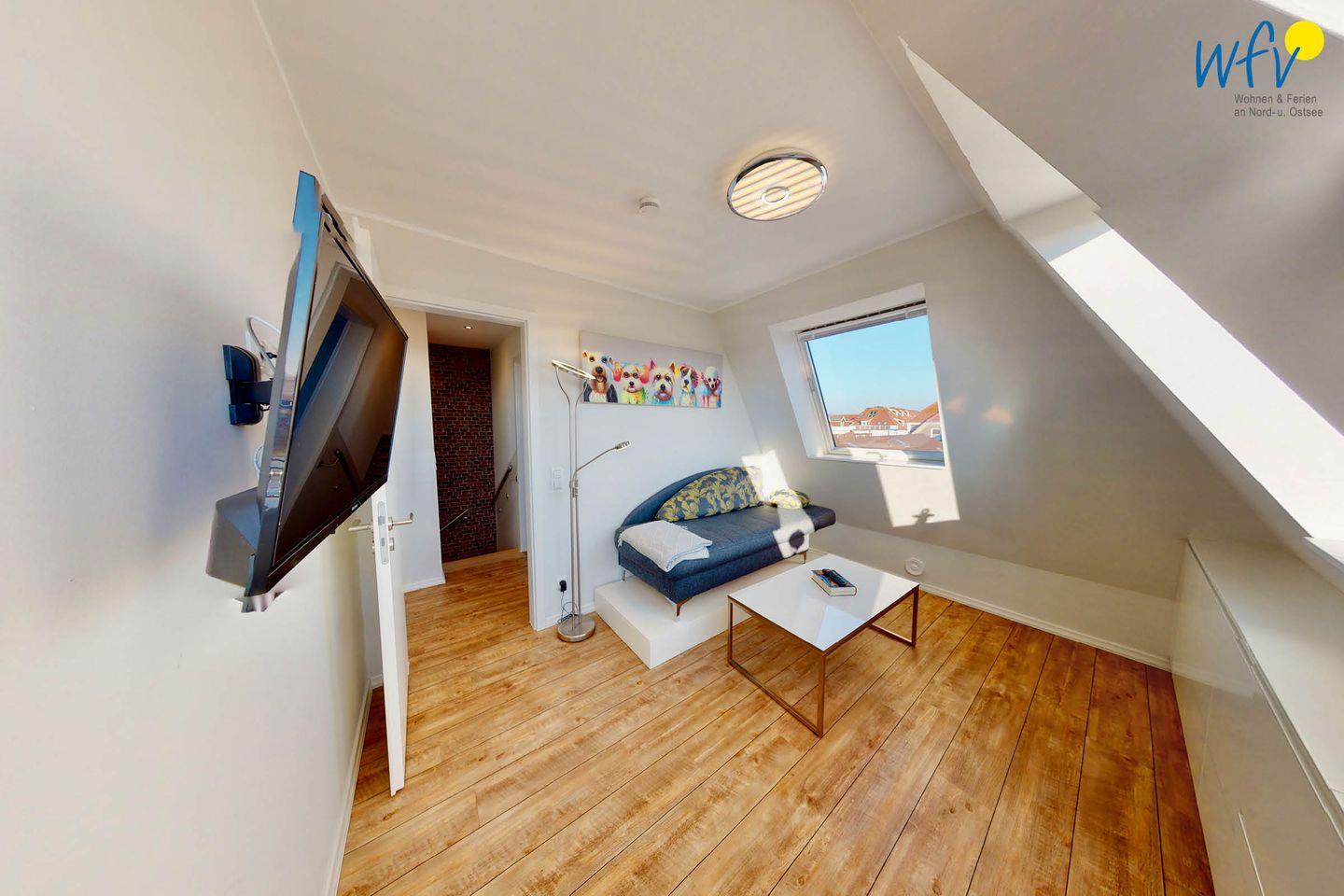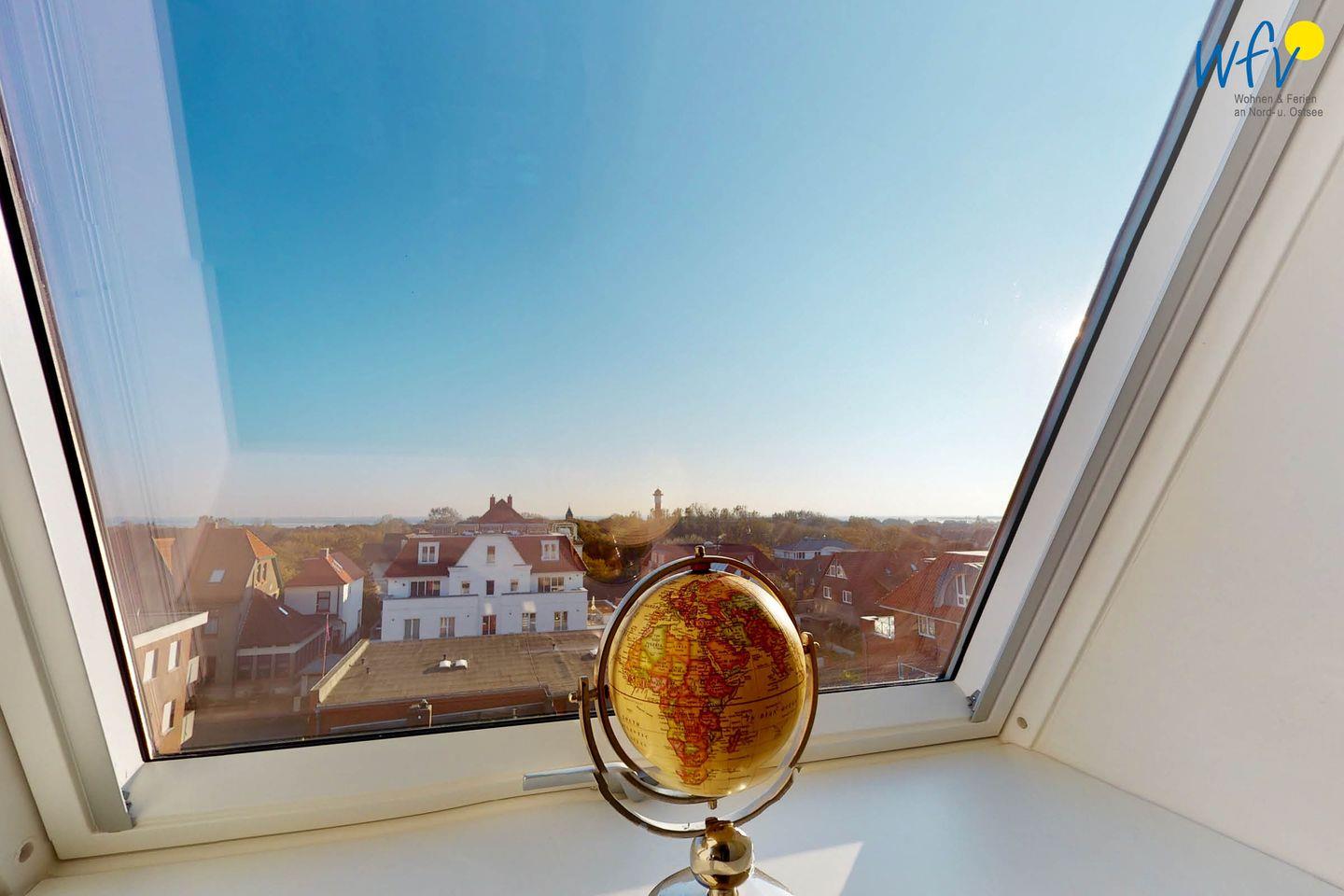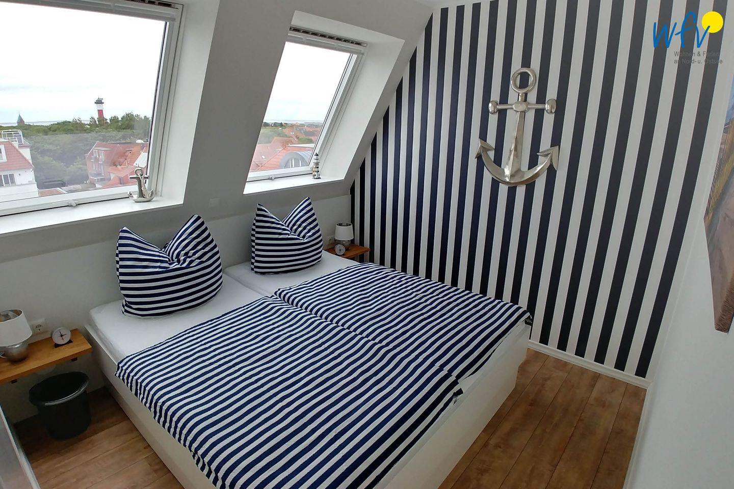 Im Dachgeschoß wartet das heimliche Highlight dieser Ferienwohnung auf Sie: Das liebevoll als „Turmzimmer“ bezeichnete zweite Wohnzimmer! Von hier aus haben Sie einen noch spektakuläreren Blick vom Hafen im Westen, über das Wattenmeer und Festland im Süden bis zur Inselspitze im Osten! Das gemütliche Sofa, das gleichzeitig ein Luxusschlafsofa ist, wurde extra erhöht, damit Sie auch beim Lesen oder Fernsehen (Flachbildfernseher mit Internetanschluss) immer mal wieder den unbeschreiblichen Blick aus den Fenstern genießen können. Die Aussicht aus dem danebengelegenen maritim gehaltenen Elternschlafzimmer mit angefertigtem Doppelbett und Einbauschrank ist genauso komfortabel. Außerdem befinden sich auf dieser Etage noch ein weiteres Schlafzimmer mit Einbauschrank sowie ein großes Bad mit ebenerdiger Dusche.