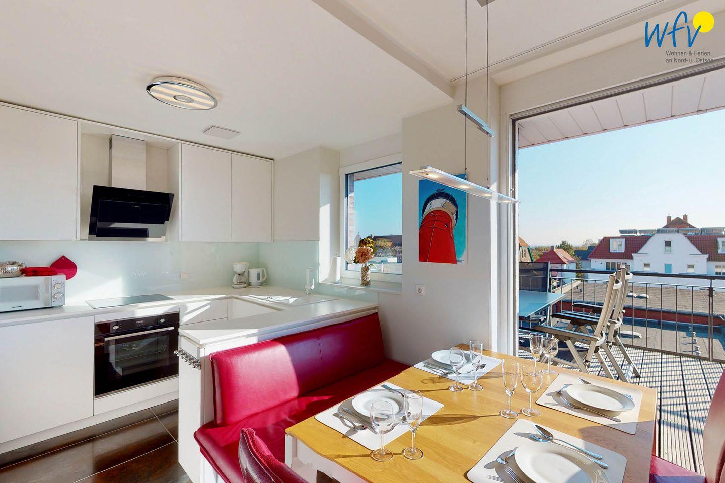 Die hochwertige Einbauküche macht das Kochen auch im Urlaub zum Hobby, zumal es bei der Aussicht vom Essbereich und dem Balkon keinen Grund mehr gibt, ein Restaurant aufzusuchen. Sie verfügt u.a. über Ceranherd, Backofen, Kühlschrank mit Gefrierfach, Mikrowelle und Geschirrspüler sowie Wasserkocher, Toaster und Kaffeemaschine. Bei gutem Wetter können Sie auf dem vorhandenen Elektrogrill grillen. Sie werden den 20 m² großen, mit Echtholz verkleideten Balkon, der mit bequemen Kettler-Gartenmöbeln und einem Sonnenschirm ausgestattet ist, gar nicht mehr verlassen wollen. Dank Südausrichtung genießen Sie den ganzen Tag Sonne und sitzen oftmals windgeschützt. Und wenn es mal windig und regnerisch sein sollte, machen Sie es sich einfach in unserem geräumigen Strandkorb gemütlich.