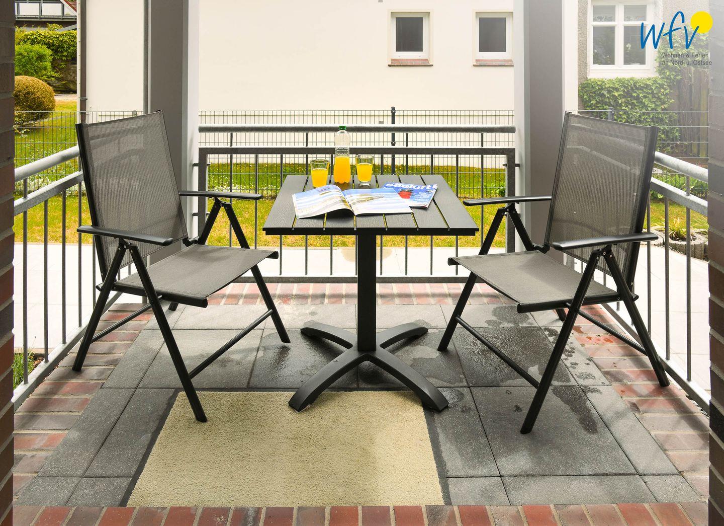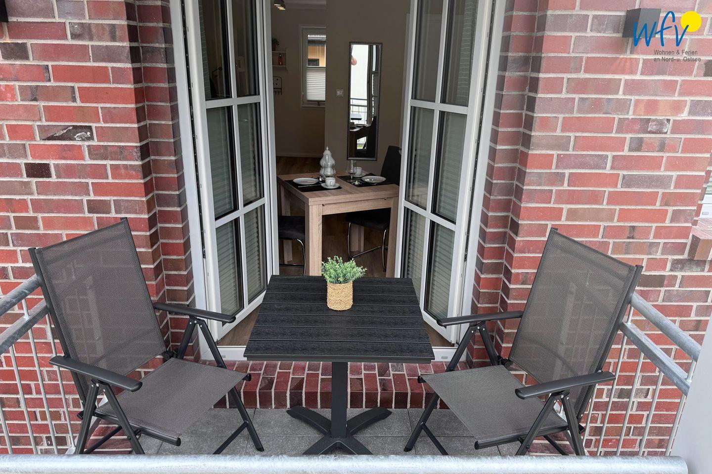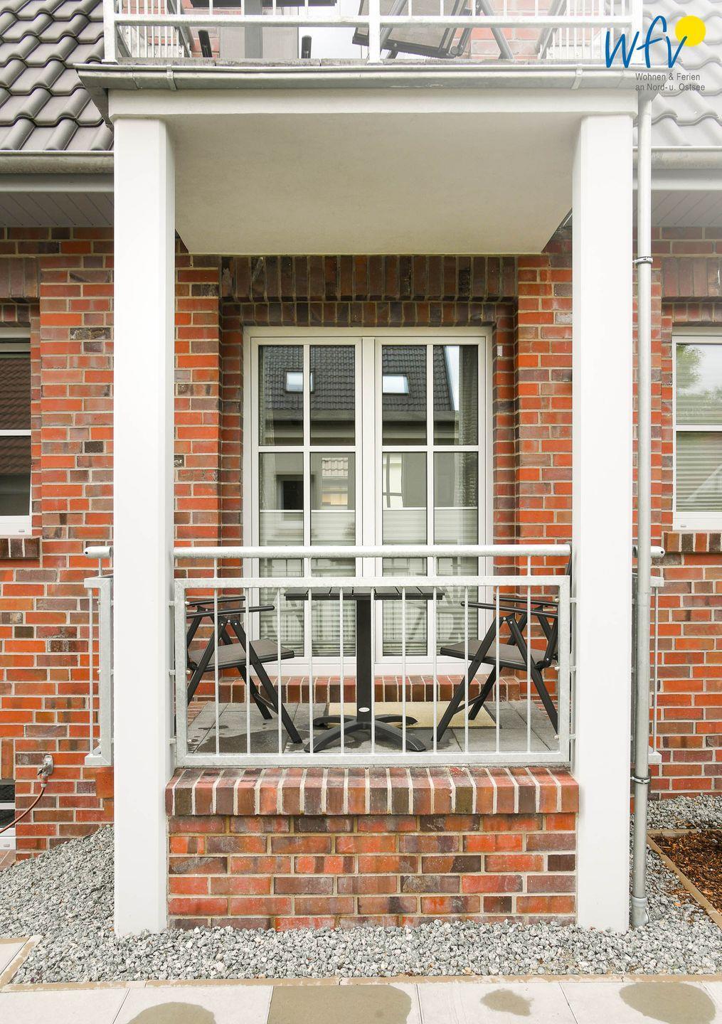 Wohltuende Nordseeluft genießen Sie auf dem hübsch möblierten, überdachten Balkon der Ferienwohnung. In Ruhe ein gutes Buch zu lesen oder den Tag bei einem guten Glas Wein ausklingen zu lassen ist ein wunderbares Urlaubsgefühl! Seitlich blicken Sie hier auf Wangerooges Naturschutzgebiet mit Wäldchen.