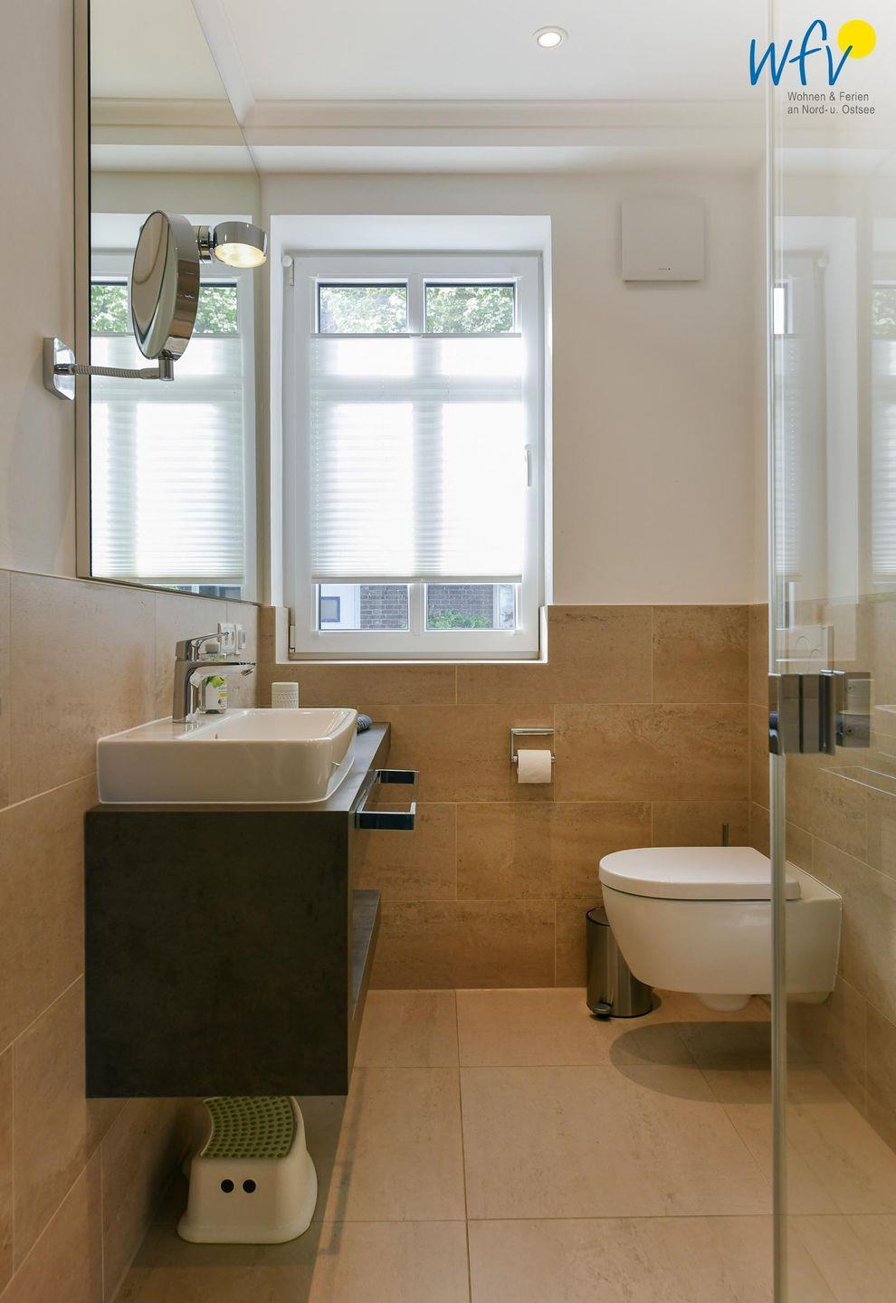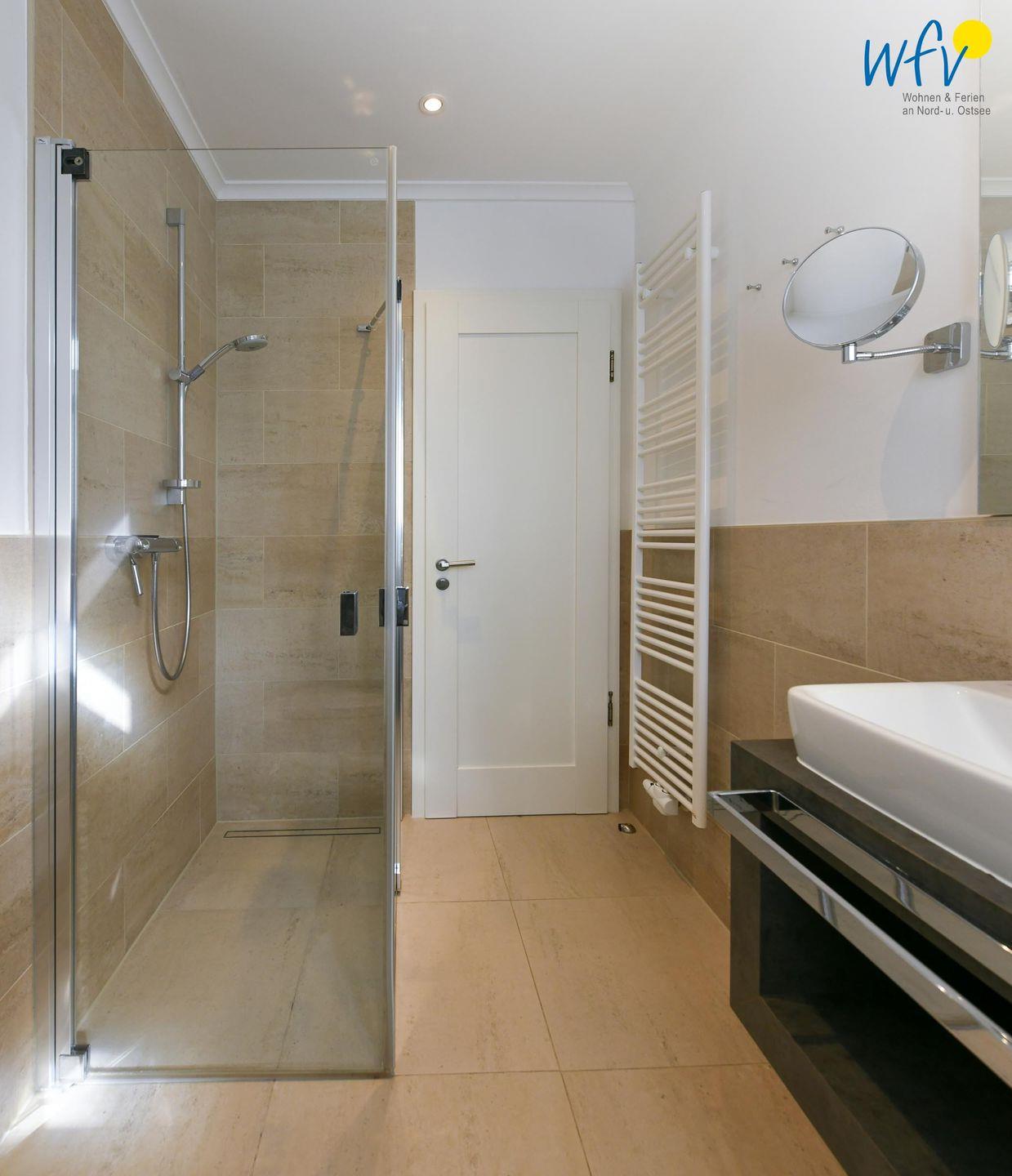 Das Tageslichtbad in elegantem Design verfügt u.a. über eine ebenerdige Dusche, eine Handtuchheizung und einen stilvollen Waschtisch mit Spiegel.
