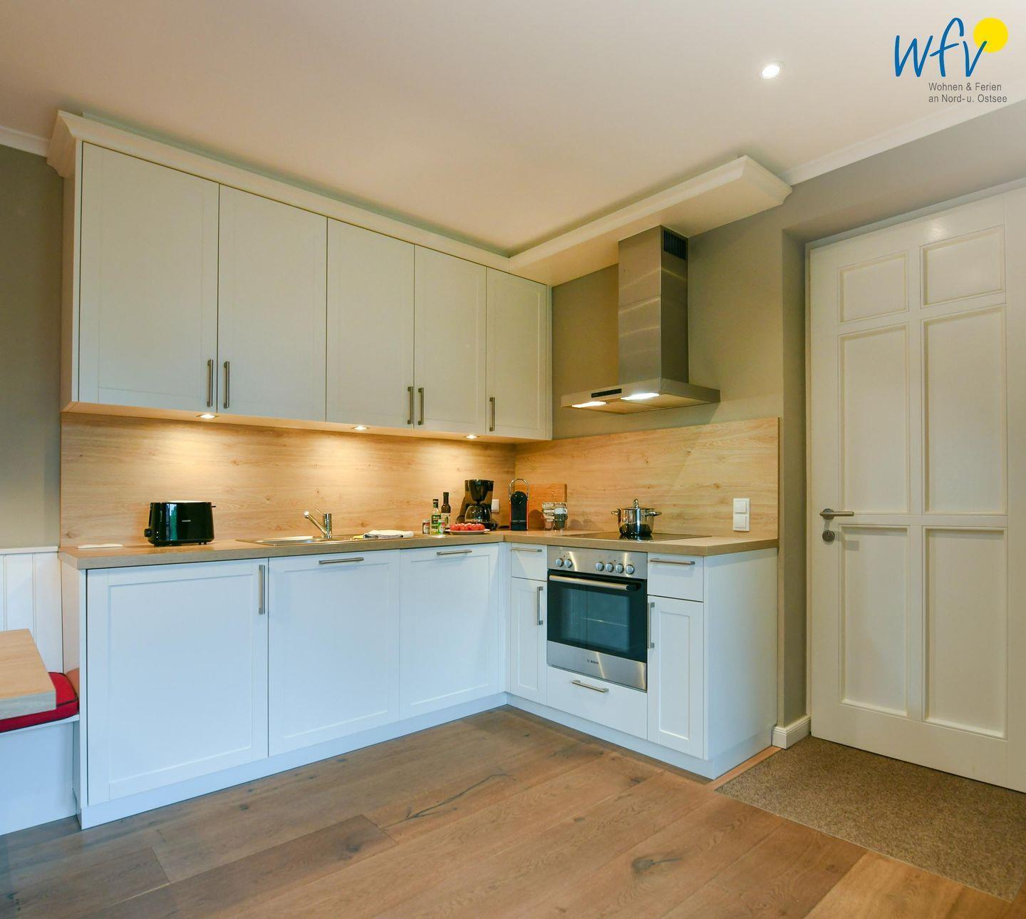 Es erwartet Sie eine großzügige Wohnfläche (68 m²) mit heller und moderner Einrichtung zum Wohlfühlen. Im gemütlichen Wohn-/Essbereich – u.a. mit Ceran-Kochfeld, Geschirrspüler und Backofen - lassen sich schnell und einfach leckere Gerichte zubereiten. Ein Esstisch lädt zu gemeinsamen Mahlzeiten ein und die angrenzende Couchecke mit TV zu entspannten Stunden nach der Fahrradtour oder dem Strandtag. Vom Wohnraum aus gelangen Sie auf die möblierte Terrasse mit Südausrichtung, auf der Sie ausgiebige Sonnenbäder genießen können.