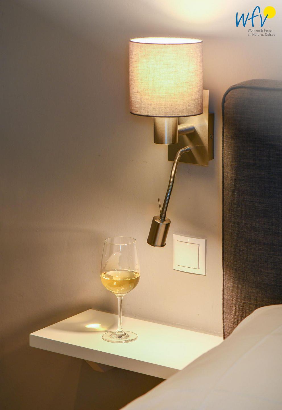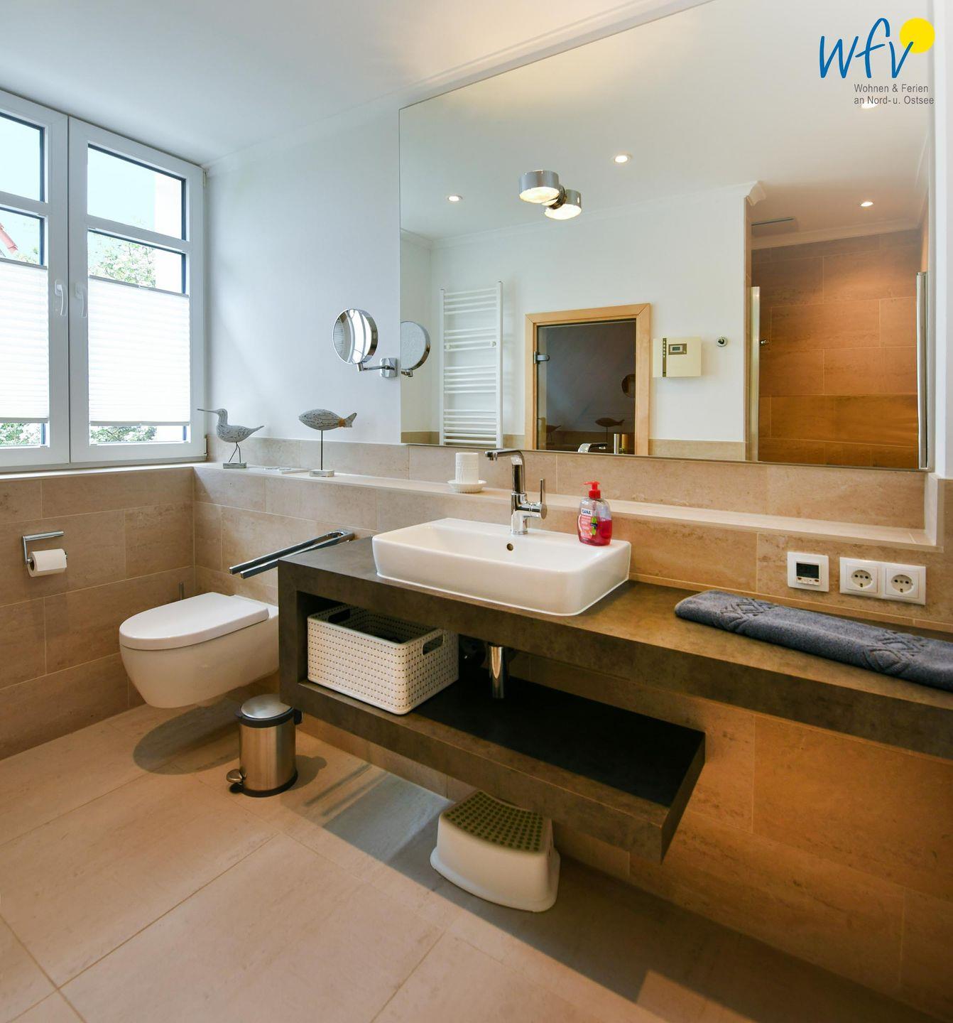 Die großzügige Wohnfläche (98 m²) mit moderner heller Einrichtung zum Wohlfühlen erstreckt sich über zwei Etagen (OG und DG). Im OG erwartet Sie eine gemütliche Wohnküche mit Essplatz – u.a. mit Ceranherd, Backofen und Geschirrspüler - sowie eine bequeme Couchecke mit TV und DVD-Player. Von hier aus gelangen Sie auf den möblierten Balkon in Südlage, der zum herrlichen Sonnenbad einlädt. Des Weiteren befindet sich im OG ein separates Schlafzimmer mit komfortablem Boxspringbett (180 x 200 cm) und ein elegantes Design-Bad mit ebenerdiger Dusche. Das Bonbon der Ferienwohnung ist die eigene Sauna, in der Sie wunderbar entspannen können.