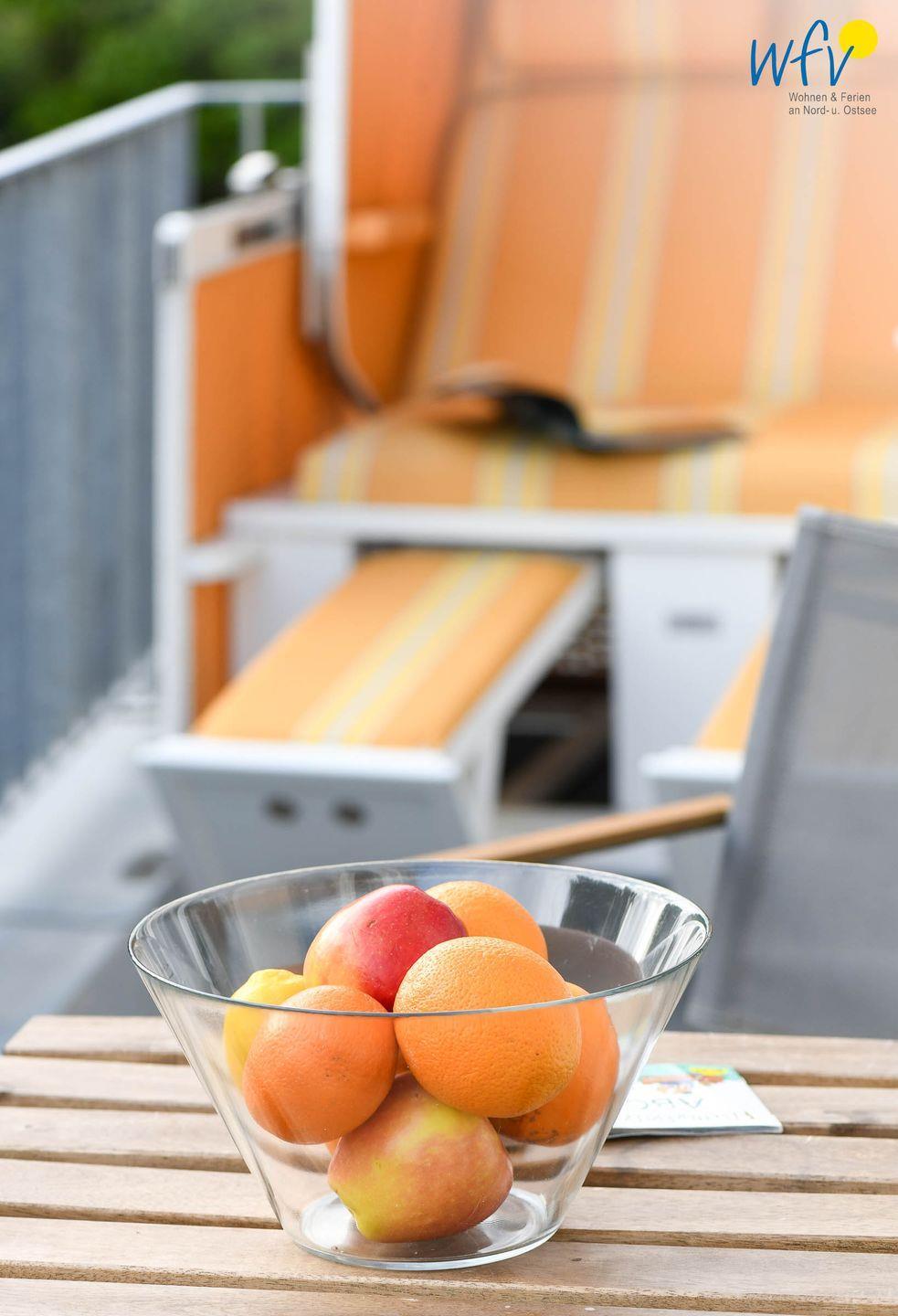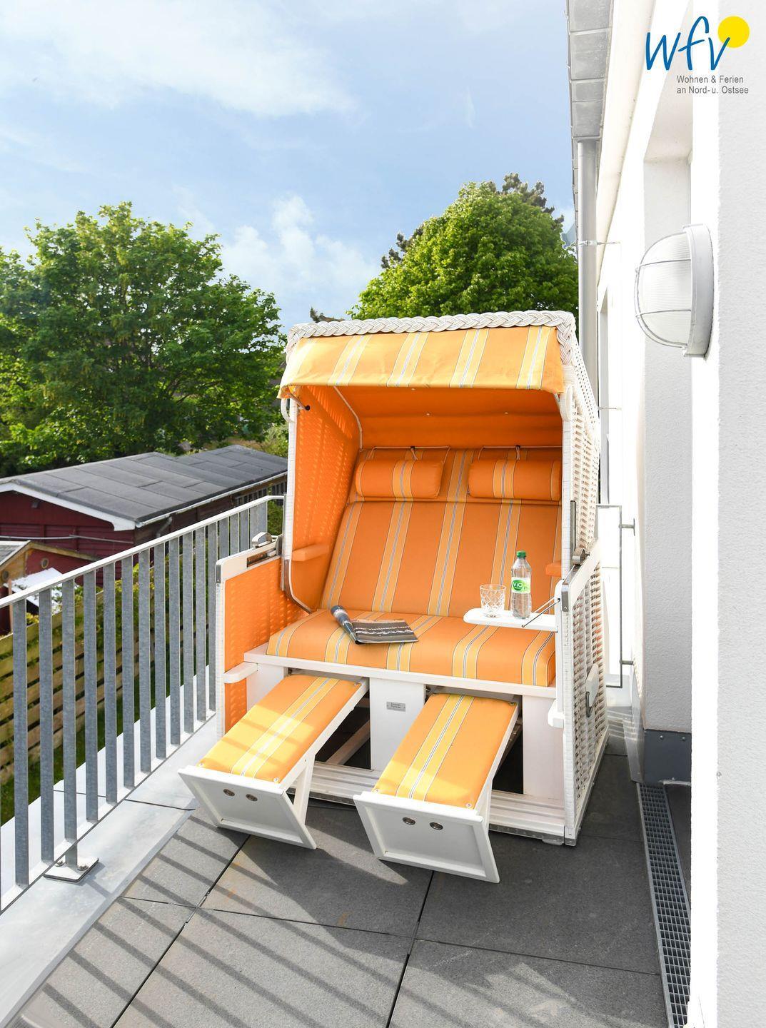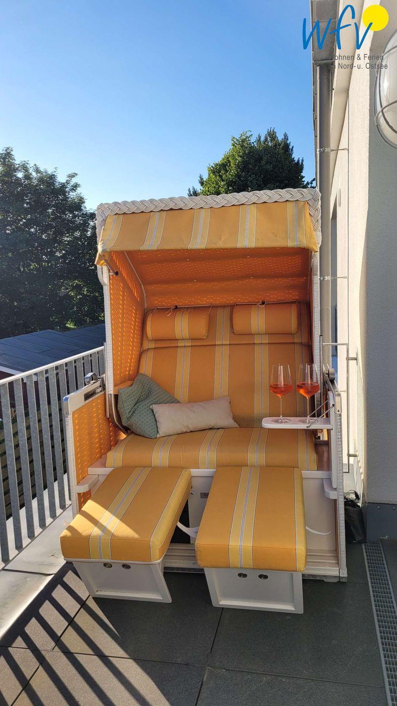 Es empfängt Sie ein sonniger Wohnraum mit kleinem Essplatz und integrierter Küchenzeile. Auf dem angrenzenden hübsch möblierten West-Balkon mit gemütlichem Strandkorb genießen Sie wohltuende Nordseeluft. Hier können herrlich ausspannen und die wunderbare Inselatmosphäre erleben.
