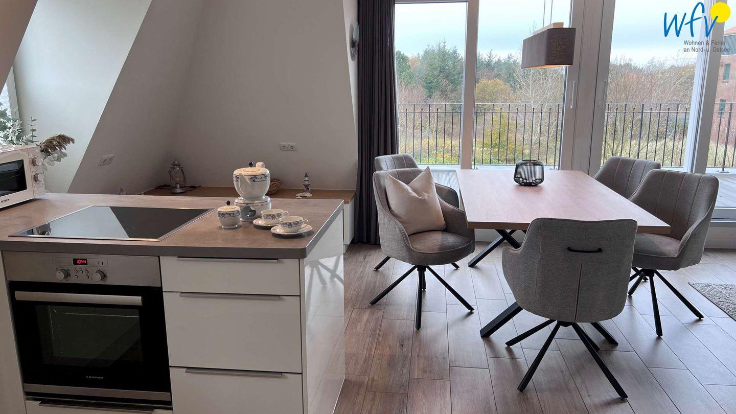 Die moderne Küche lässt Sie auch im Urlaub zu Gourmets werden. Ausgestattet ist sie u.a. mit einem Cerankochfeld, einem Backofen und einer Mikrowelle, den Abwasch übernimmt die Spülmaschine. Küche, Essbereich und Couchecke bilden ein geselliges Ensemble, sodass gemeinsame Mahlzeiten, Spieleabende oder Filmabende möglich sind.