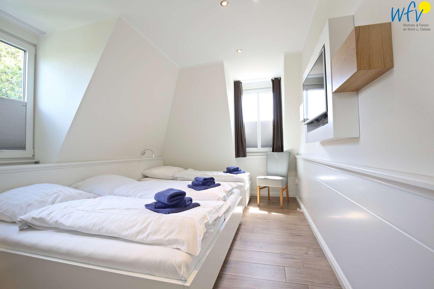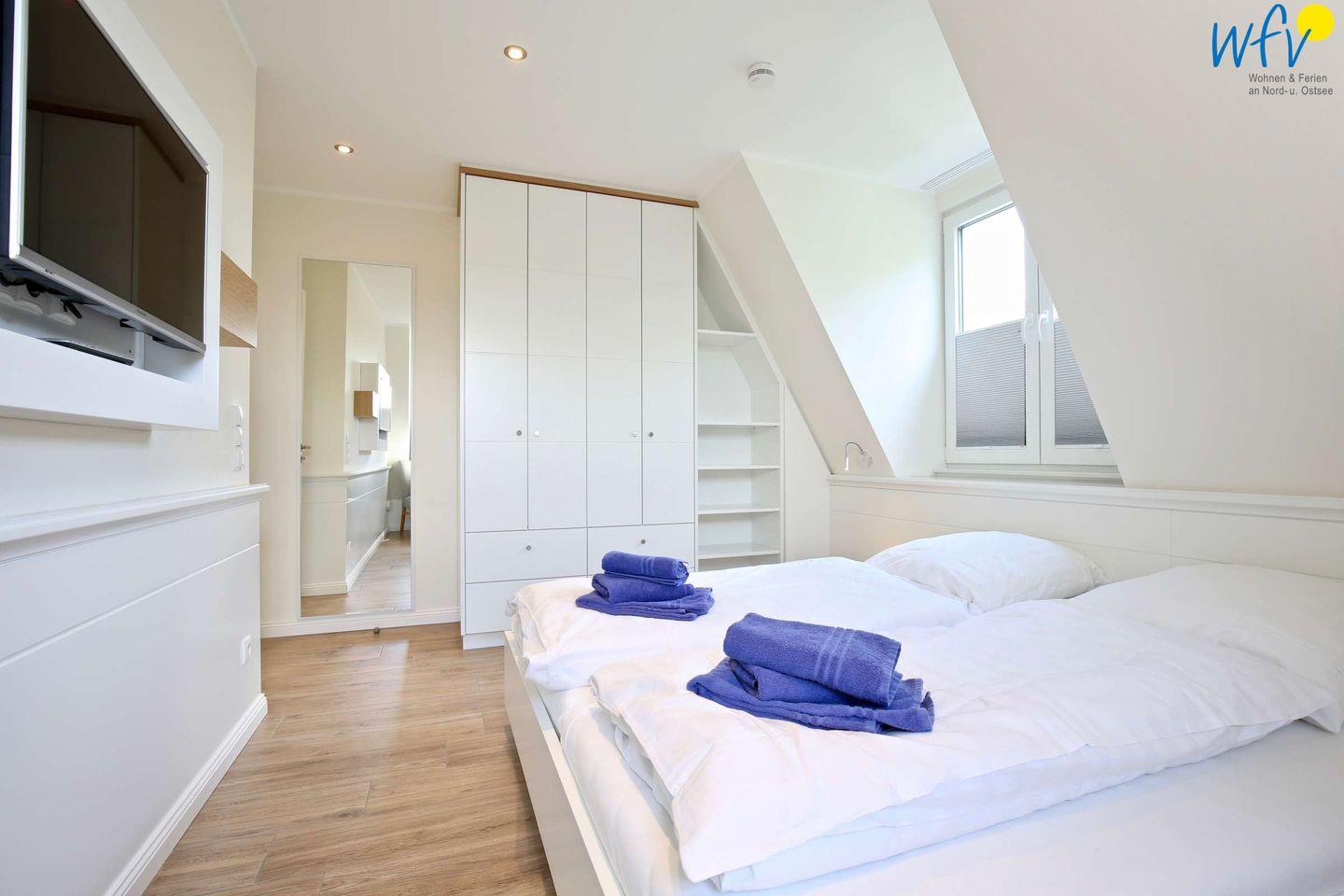 Durch zwei separate Schlafzimmer mit komfortablen Doppelbetten bestehen angenehme Rückzugsmöglichkeiten. In einem der Zimmer befindet sich ein Einzelbett für eine weitere Person. Vom Bett aus können Sie gemütlich fernsehen. Die geräumigen Kleiderschränken bieten viel Platz für Ihre Urlaubsgarderobe.