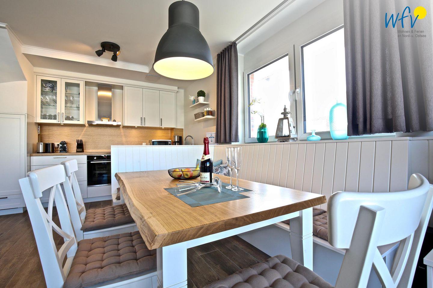 Die helle Ferienwohnung ist liebevoll und modern eingerichtet, maritime Accessoires sorgen für Gemütlichkeit und das entsprechende Nordseegefühl. Nach dem Strandtag oder der Fahrradtour lädt die breite Couchlandschaft im Wohnbereich zum ausgiebigen Entspannen ein. In der offenen Küche mit hochwertigen Geräten (u.a. Ceranherd, Backofen, Spülmaschine) und großem Essplatz lassen sich beim gemeinsamen Kochen und Klönen herrlich gesellige Abende verbringen. Die Fußbodenheizung und der hochwertige Parkettboden verleihen dem Raum eine angenehme Raumtemperatur bzw. an kühleren Tagen eine wohlige Wärme.