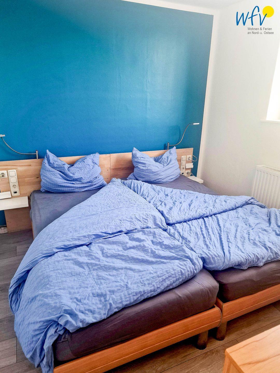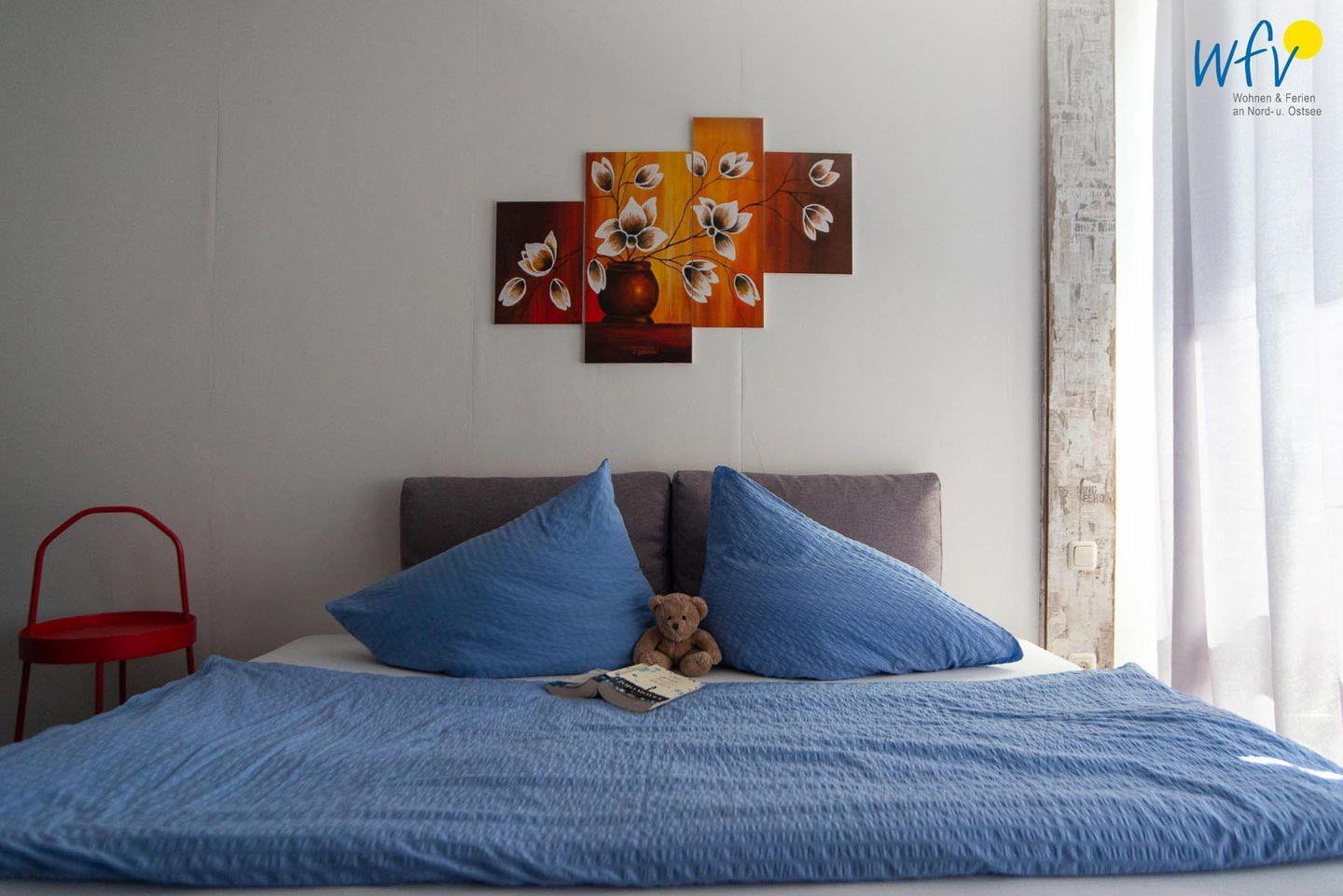 Das separate Schlafzimmer ist mit einem komfortablen Doppelbett ausgestattet. Ein Kleiderschrank bietet Ihnen Platz für die Urlaubsgarderobe. Und wenn Sie morgens nach dem Aufstehen aus dem Fenster schauen, begrüßt Sie ein schöner Blick aufs Meer!