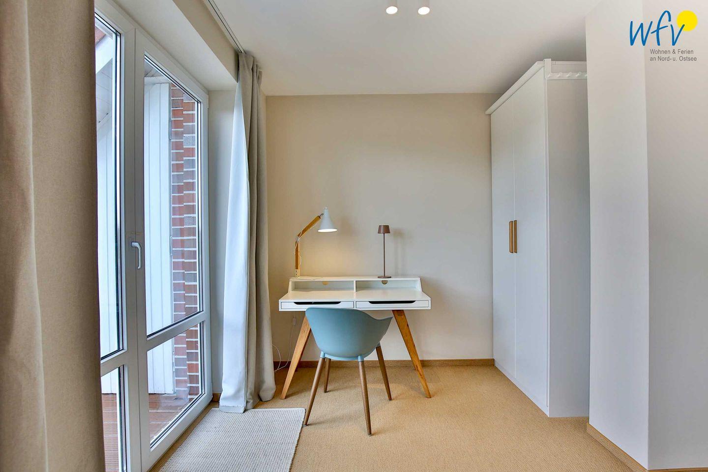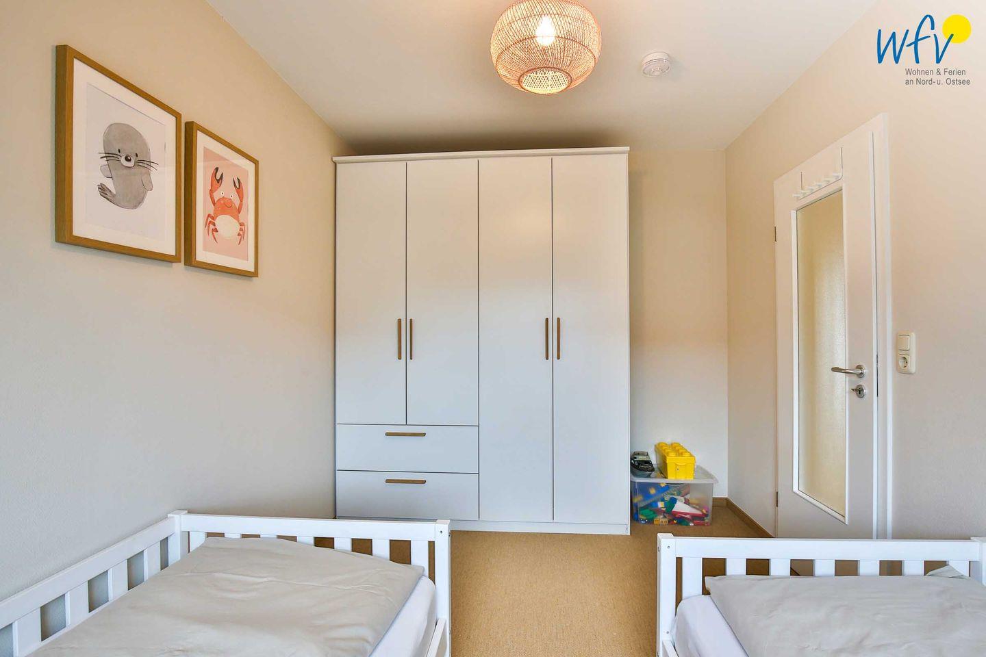 Wenn auf Wangerooge die Sonne untergeht, laden drei separate Schlafzimmer zum entspannten Ausschlafen ein. Die beiden Schlafzimmer im OG sind mit einem Doppelbett eingerichtet (2 m x 1,80 m) bzw. mit zwei Einzelbetten (2 m x 0,90 m), die durch einen Rausfallschutz ideal für Kinder geeignet sind. In dem Schlafzimmer im DG befindet sich ein weiteres Doppelbett (2 m x 1,80 m). Ihre Urlaubsgarderobe können Sie jeweils in den großzügigen Kleiderschränken verstauen.