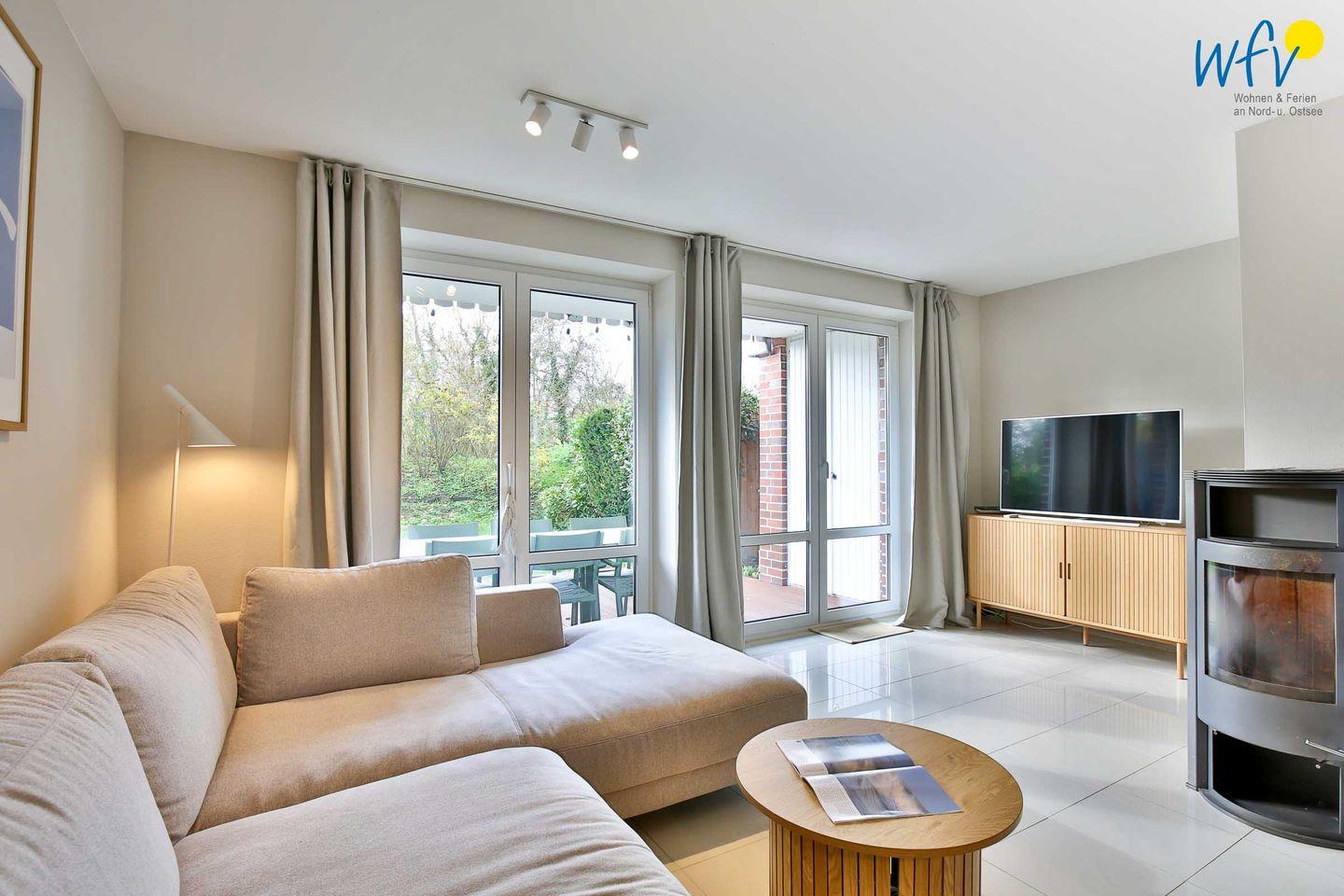 In dem hellen Wohnraum (EG) empfängt Sie ein geschmackvolles Ensemble aus einer Couchecke mit modernem SmartTV und einem langem Esstisch. So können Sie nach der Fahrradtour oder dem Strandtag gemütlich zusammen sitzen, Filme schauen oder Ihre Mahlzeiten genießen und klönen. Leckere Snacks für den Ausflug oder Gerichte am Abend lassen sich schnell und einfach in der separaten voll ausgestatteten Küche zaubern - u.a. mit Herd, Backofen und Mikrowelle. Den Abwasch übernimmt für Sie der Geschirrspüler. Kaffeegourmets genießen hier die Auswahl zwischen einer klassischen Kaffeemaschine, einem MoccaMaster und einer Nespresso.