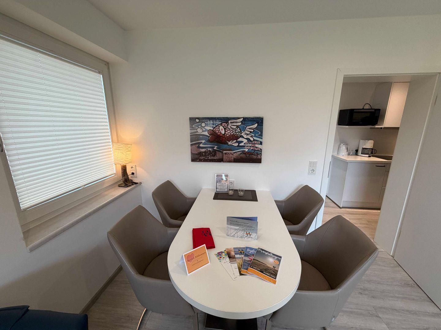Das Apartment verfügt über zwei Zimmer, darunter ein separates Schlafzimmer mit hochwertigem Vinylboden, Sichtschutz für alle Fenster und gemütlicher Atmosphäre. Der offene Wohnbereich bietet eine komfortable Sofaecke sowie einen Sessel und wird durch einen gemütlichen Essbereich ergänzt. Ein digitales TV-Gerät mit internationalen Kanälen, ein weiteres TV-Gerät im Schlafzimmer, Radio und WLAN ab 25Mbit/s sorgen für angenehme Unterhaltung.