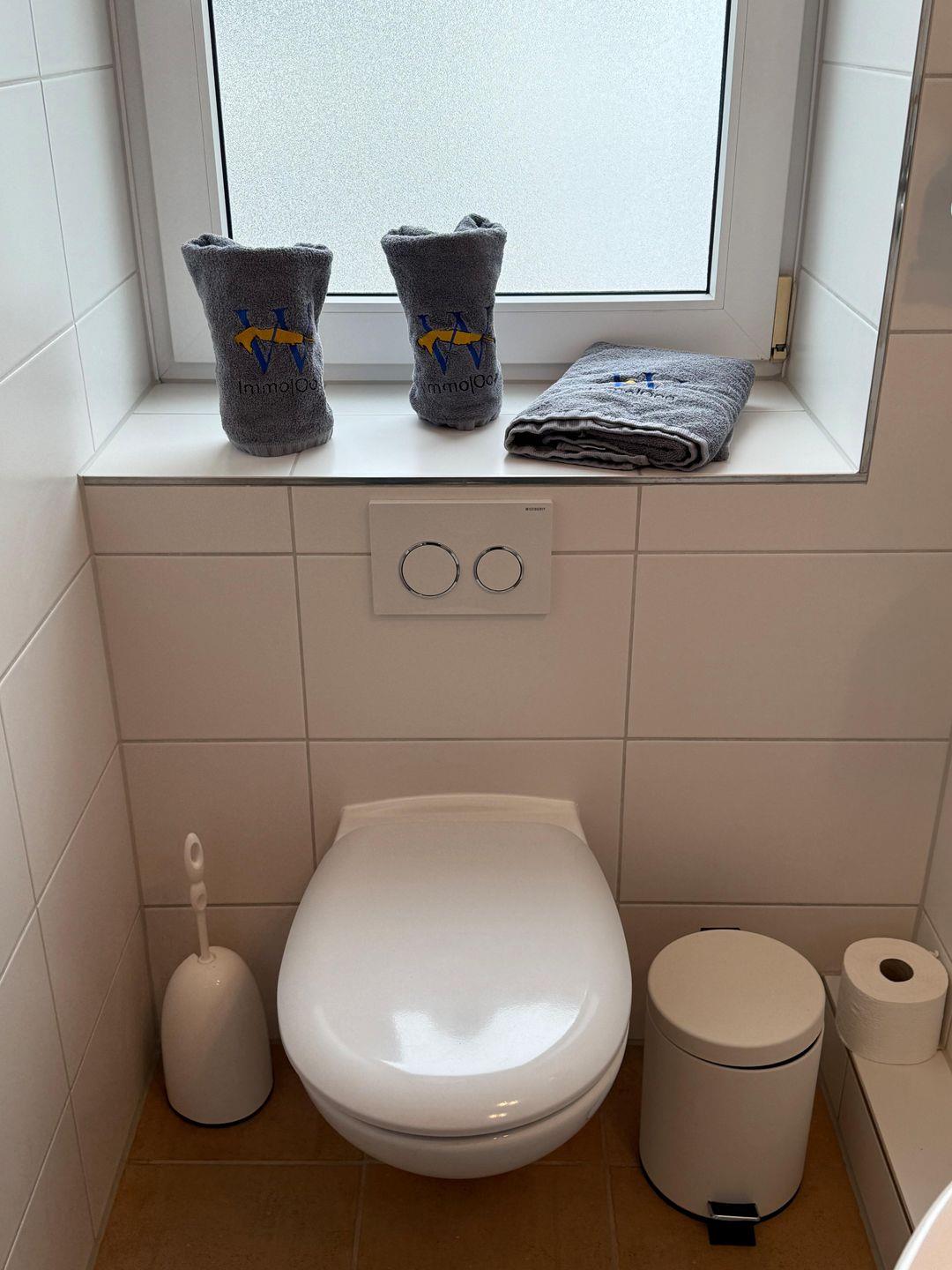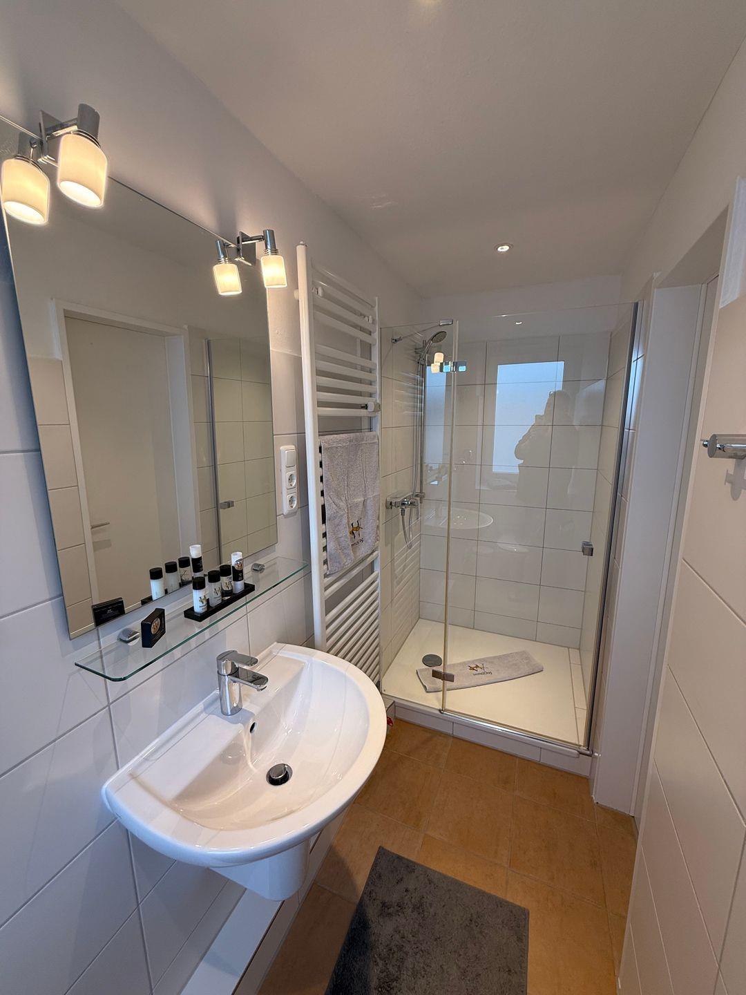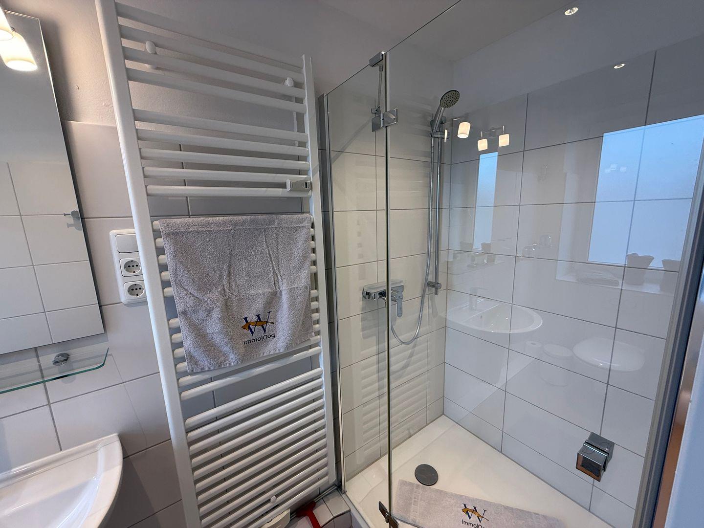 Das Badezimmer verfügt über eine Dusche, Waschbecken, Spiegel und ist mit einem WC ausgestattet. Für längere Aufenthalte steht Ihnen zudem eine gemeinschaftliche Nutzung von Waschmaschine und Trockner zur Verfügung, ein Staubsauger sowie ein Wäscheständer befinden sich im Appartement. Ein Ganzkörperspiegel, Garderobe und Schuhschrank ergänzen die Ausstattung sinnvoll.