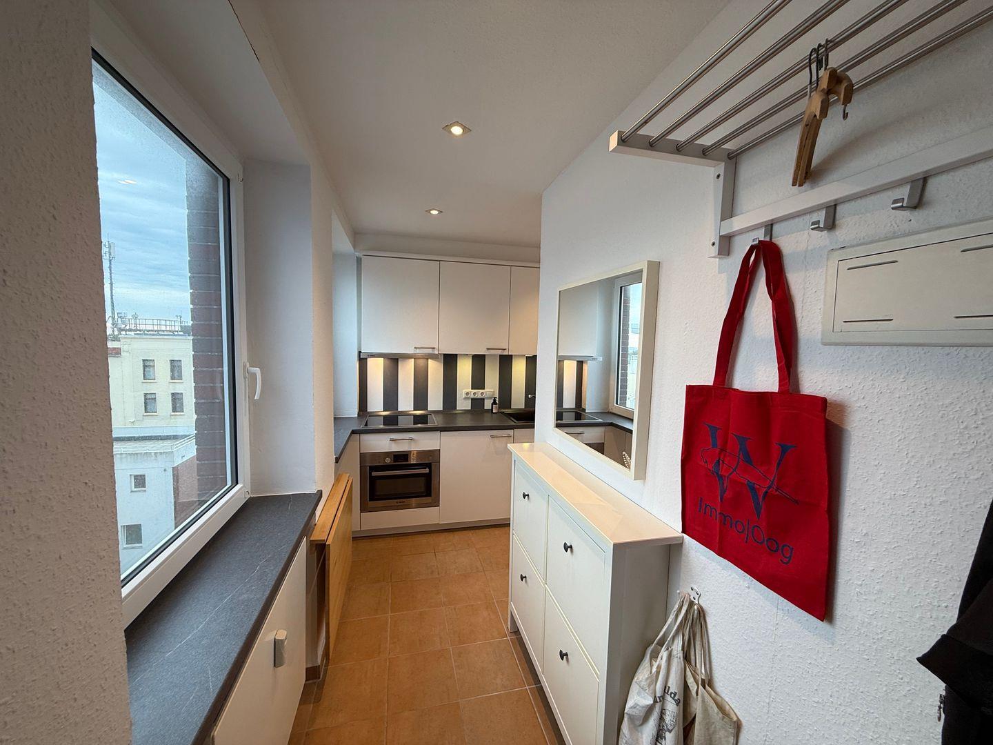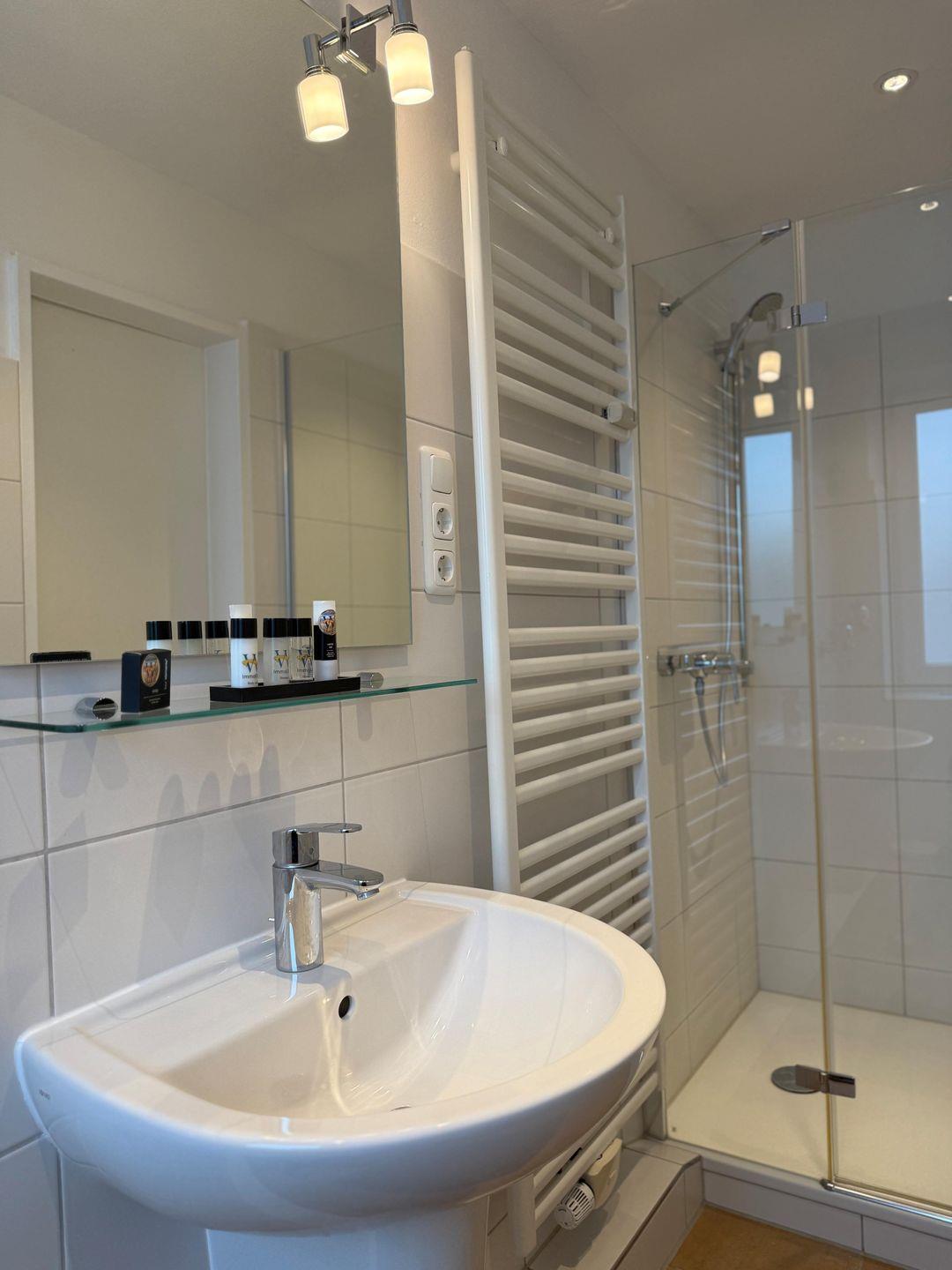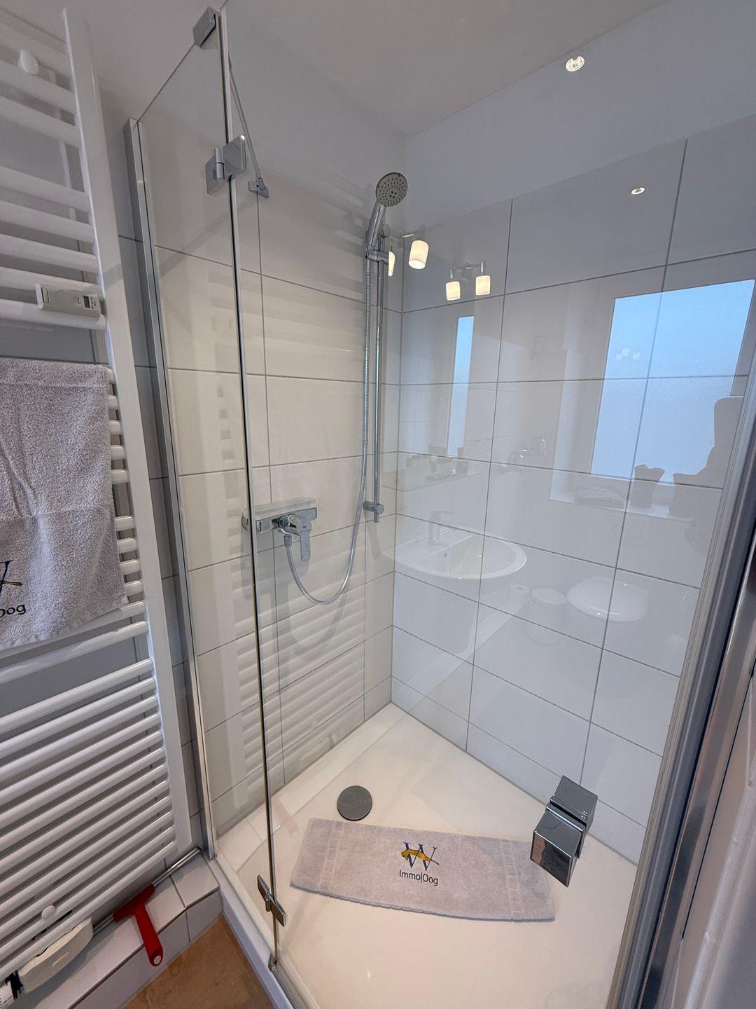 Das Badezimmer verfügt über eine Dusche, Waschbecken, Spiegel und ist mit einem WC ausgestattet. Für längere Aufenthalte steht Ihnen zudem eine gemeinschaftliche Nutzung von Waschmaschine und Trockner zur Verfügung, ein Staubsauger sowie ein Wäscheständer befinden sich im Appartement. Ein Ganzkörperspiegel, Garderobe und Schuhschrank ergänzen die Ausstattung sinnvoll.