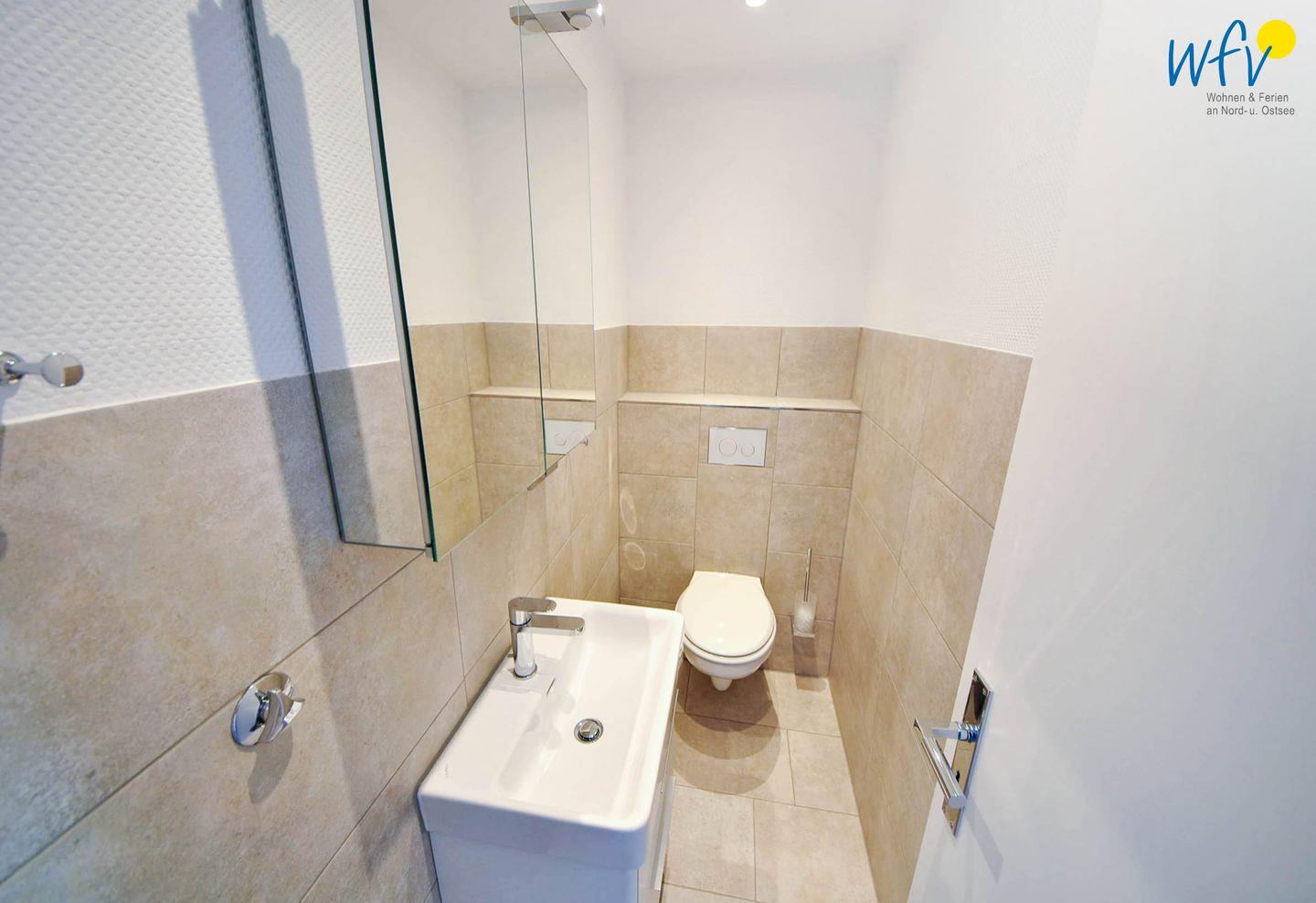 Ein elegantes Badezimmer - u.a. mit bodentiefer Dusche, großem Spiegelschrank und Handtuchheizung - ergänzt den Wohnkomfort. Separat befindet sich das WC in einem kleinen Bad gegenüber, das ebenfalls mit einem großen Spiegelschrank und einer Handtuchheizung ausgestattet ist.