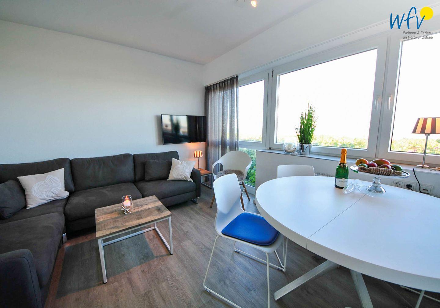 Die helle und freundliche Atmosphäre lädt auf Anhieb zum Entspannen und Wohlfühlen ein - ganz besonders der außergewöhnliche Panorama-Blick auf die Wellen der Nordsee. Von der breiten Fensterfront im Wohnraum erleben Sie eine einzigartige Aussicht auf Dünenlandschaft und Meer.