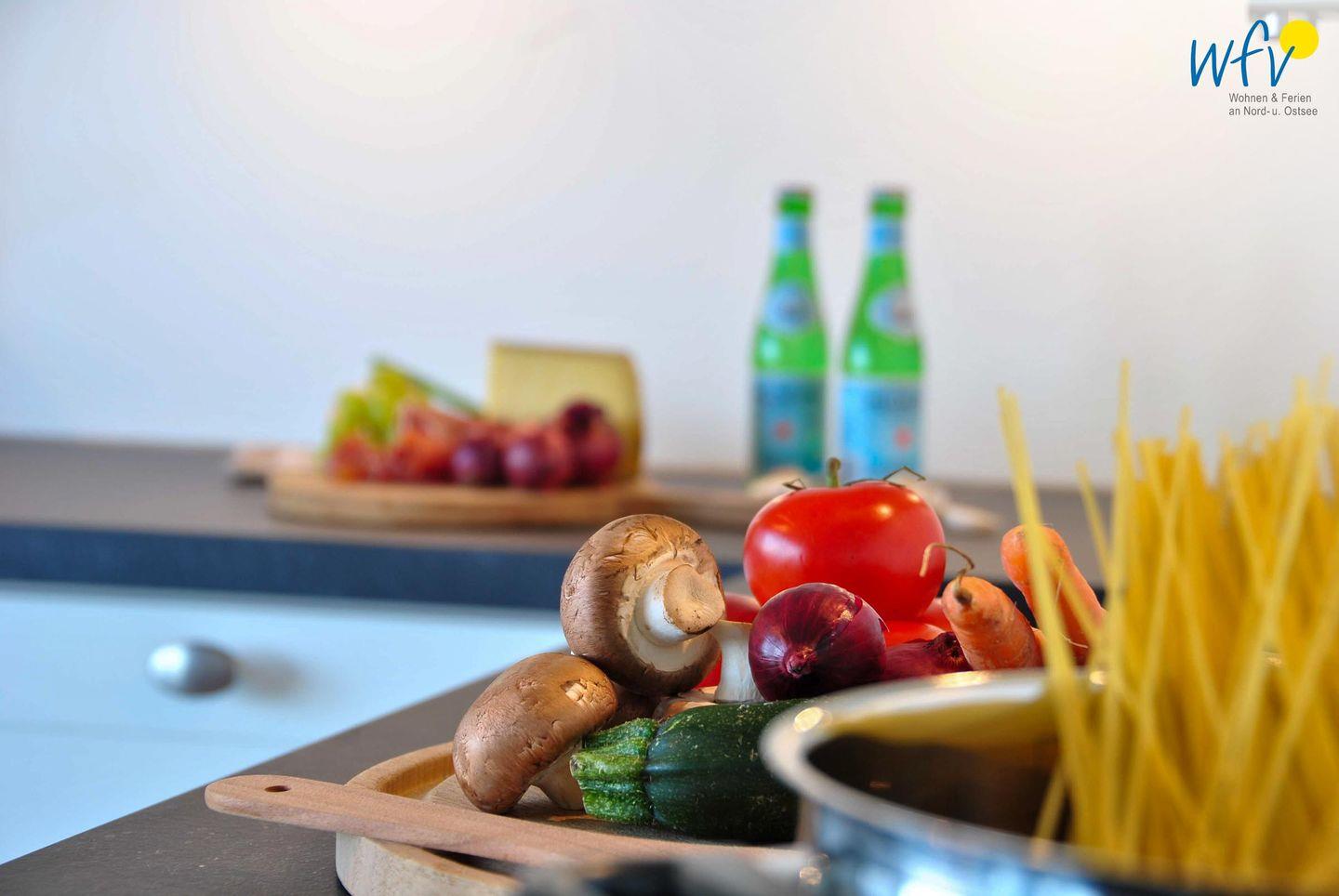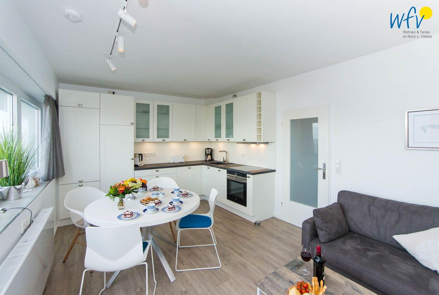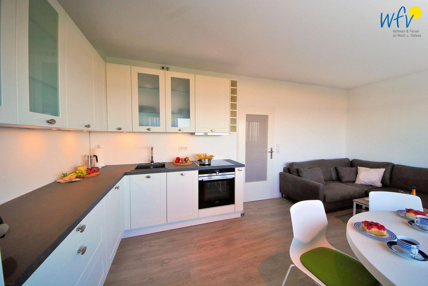 Genießen Sie Ihren morgendlichen Kaffee an dem Essplatz mit Meerblick oder entspannen Sie in der gemütlichen Sitzecke mit Couch und TV. Für die bequeme Selbstverpflegung ist die moderne Küchenzeile u.a. mit Herd, Backofen, Mikrowelle (im Backofen integriert) und Spülmaschine ausgestattet.