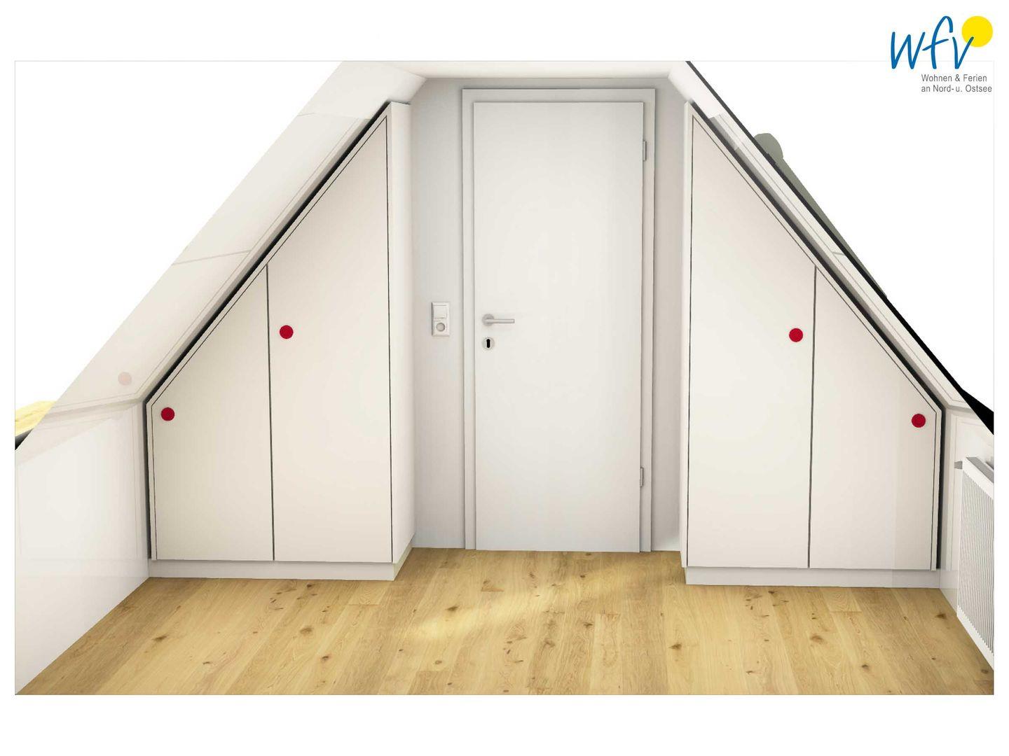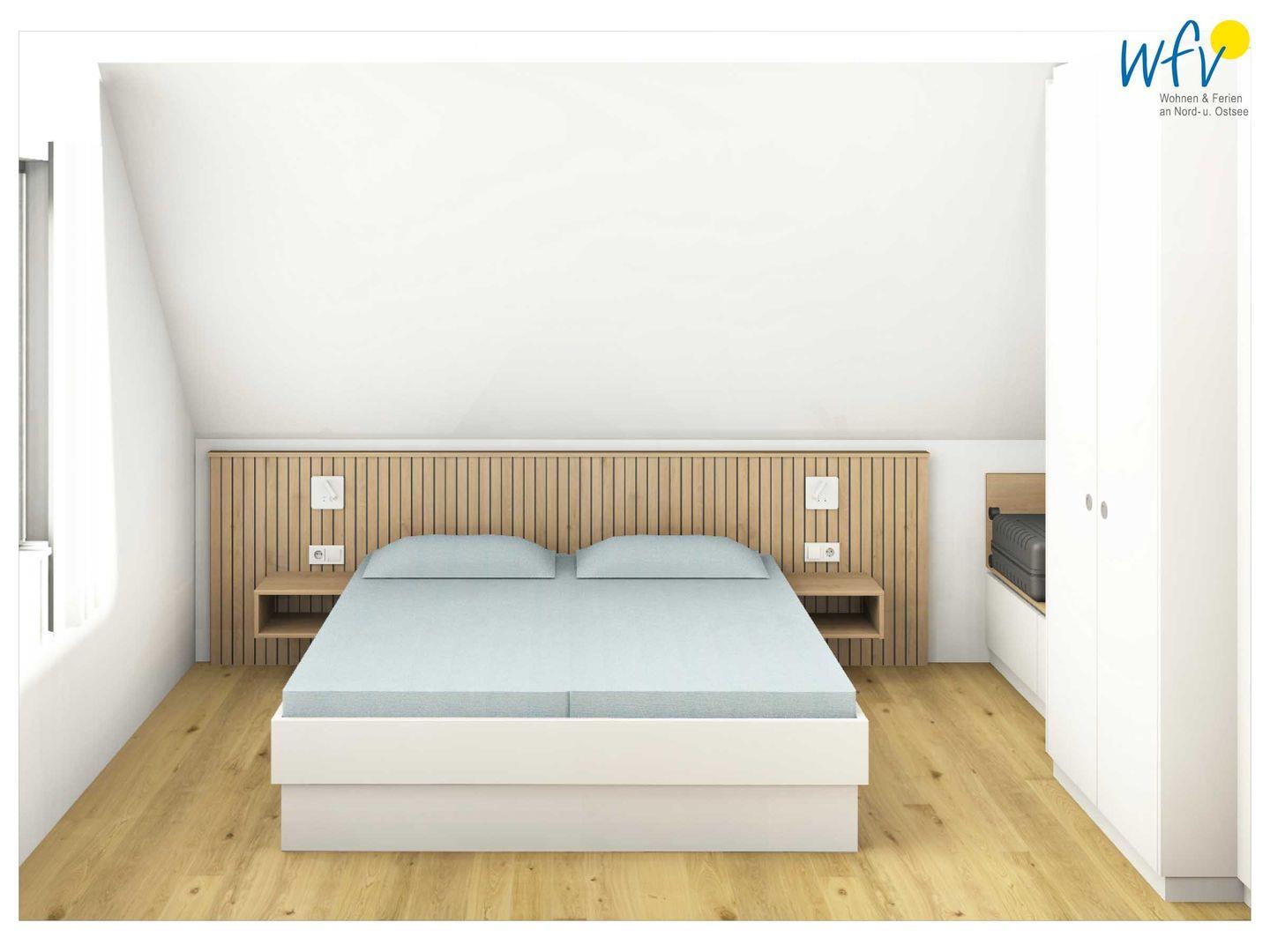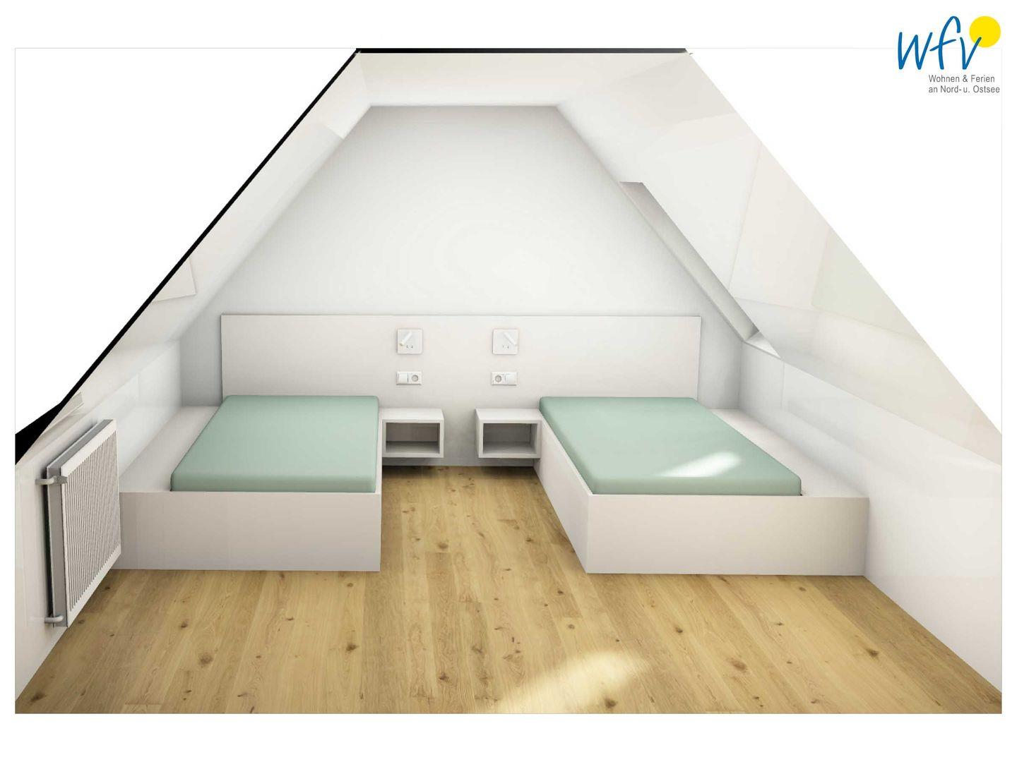 Wenn auf Wangerooge die Sonne untergeht, versprechen zwei separate Schlafzimmer eine angenehme Nachtruhe. Das Schlafzimmer im Dachgeschoss ist mit einem komfortablen Doppelbett eingerichtet, im Spitzboden erwarten Sie zwei Einzelbetten. Geräumige und maßgefertigte Einbauschränke bieten Platz für Ihre Urlaubsgarderobe.