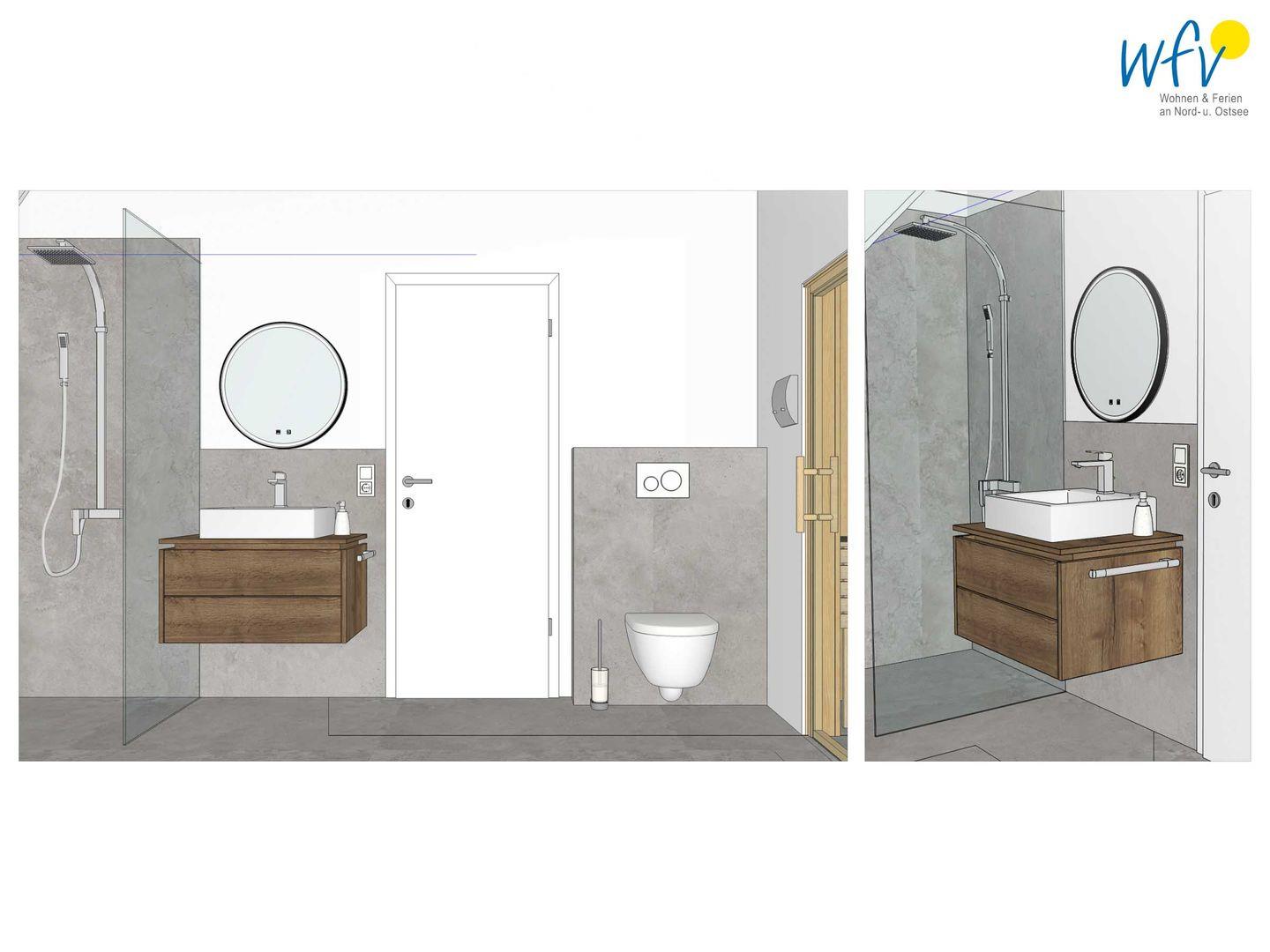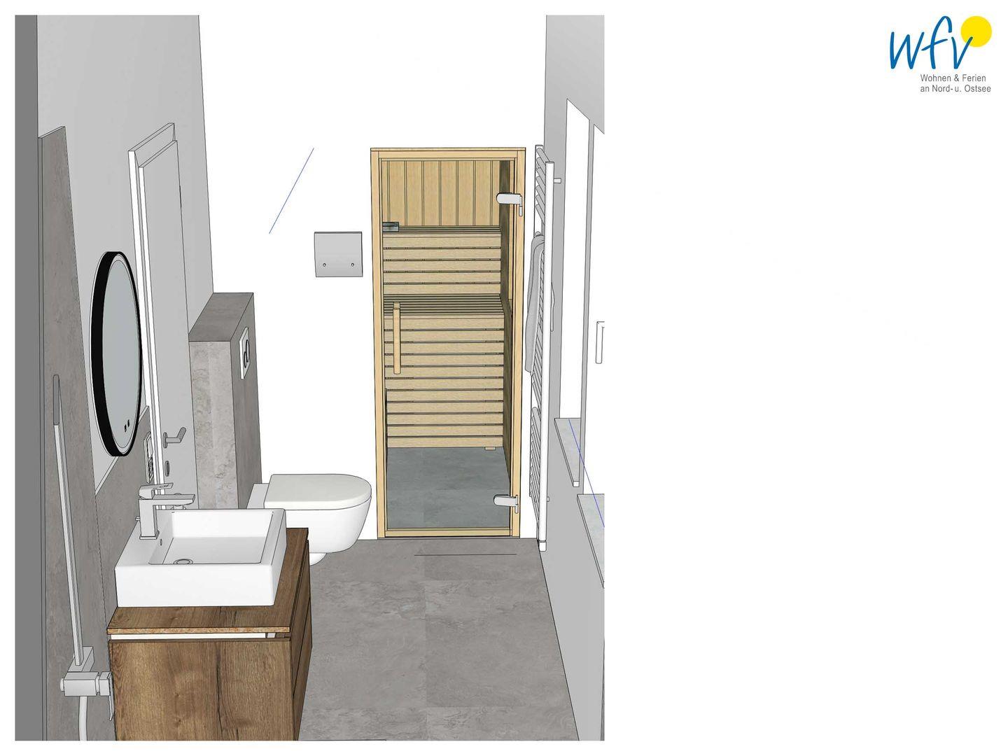 Das elegante Tageslicht mit ebenerdiger Dusche lädt zur Erfrischung nach dem Strandtag ein, die wohnungseigene Sauna zur Erholung mit wohliger Wärme.