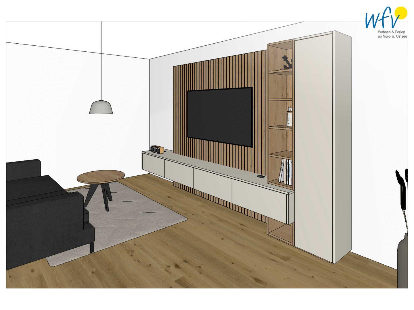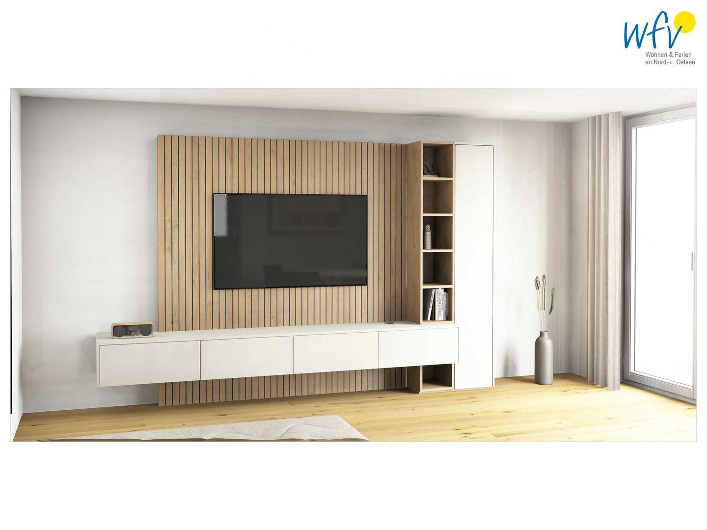 Großzügige 66 m² Wohnfläche und bodentiefe Fenster bieten Ihnen ein weites Raumgefühl. Der helle Wohnbereich mit einem Ensemble aus bequemer Couchecke, modernem SmartTV und rundem Esstisch lädt nach dem Strandspaziergang zur Entspannung ein. Vom Wohnzimmer aus gelangen Sie direkt auf die Terrasse / Garten. Ideal zum Ausspannen, Lesen oder um den Tag bei einem Glas Wein ausklingen zu lassen.