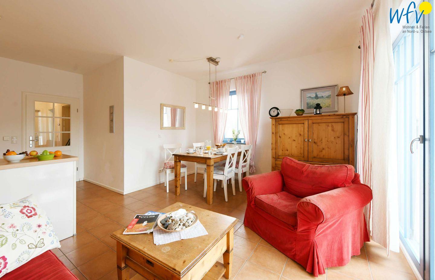 Die Wangerooger Ferienwohnung verfügt über einen großzügigen Wohnbereich mit hochwertiger Einrichtung, gemütlichem Sofa und Urlaubssessel. Die Stereoanlage mit Dolby-Surround und integriertem DVD-Spieler lässt neben Filmen auch Ihre mitgebrachte Musik (USB) gut zur Geltung kommen.
