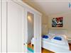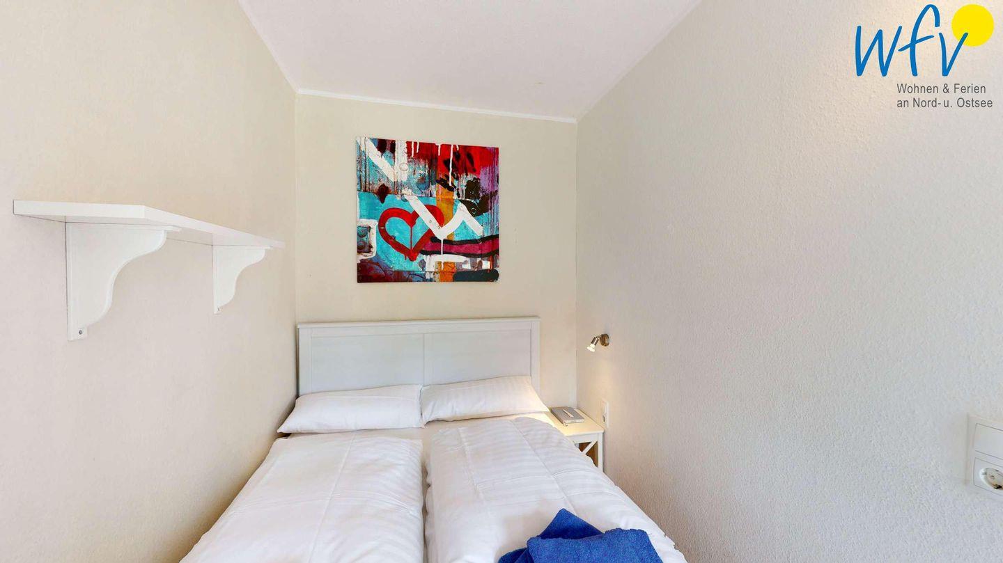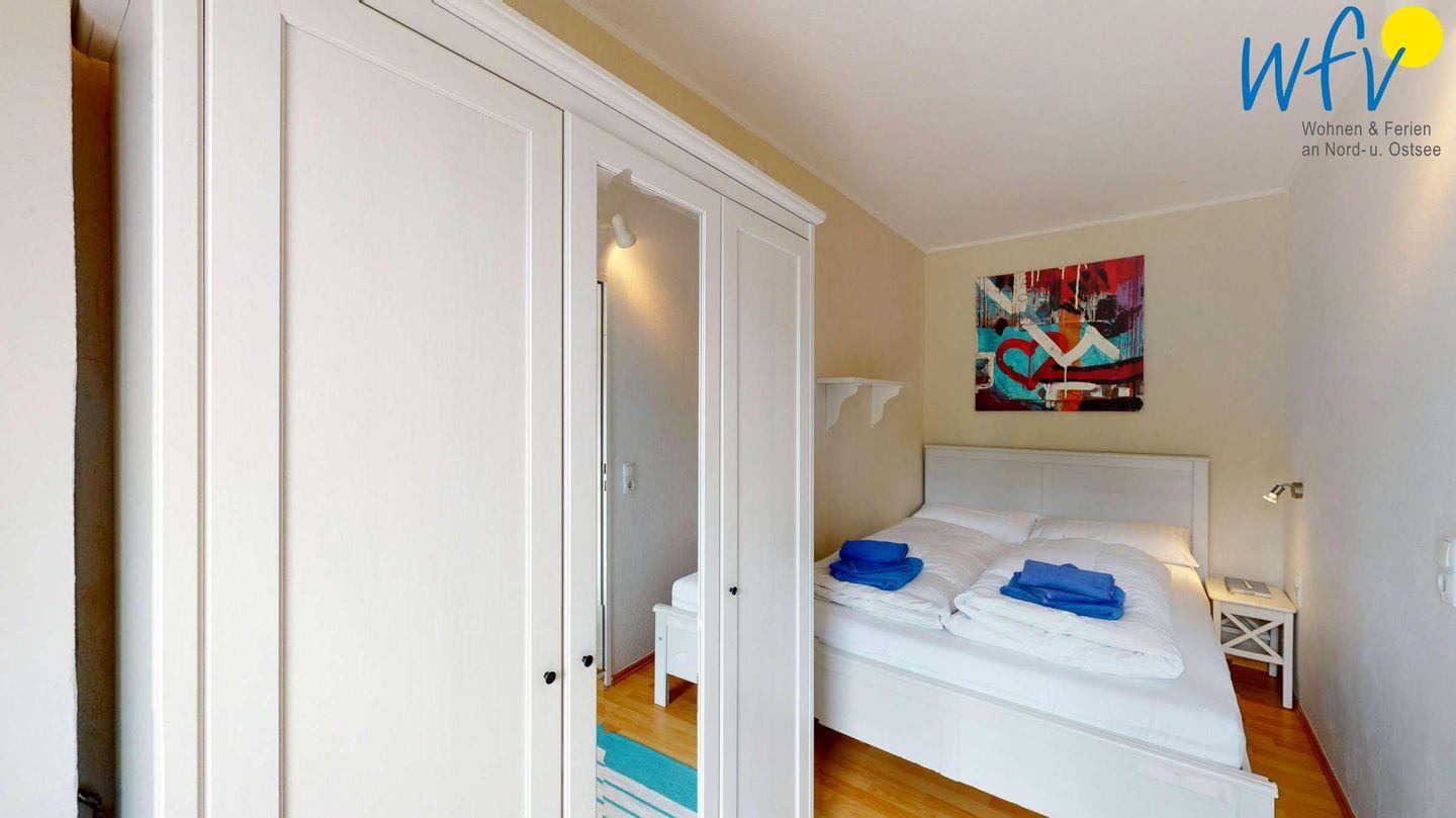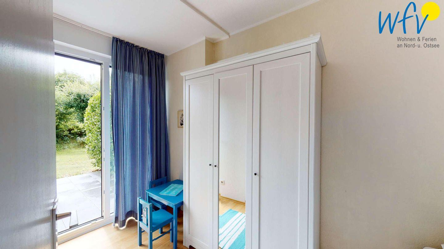 Herrlich ausschlafen können Sie in dem separaten Schlafzimmer mit französischem Doppelbett (1,40 m). Ihre Urlaubsgarderobe findet Platz im Kleiderschrank. Für die kleinen Gäste gibt es in dem Raum eine Kindersitzecke mit schönem Blick nach draußen. Weitere Schlafmöglichkeiten bestehen durch das bequeme Sofa im Wohnraum (1,50 m Schlafbreite). Für Ihren Schlafkomfort wurden in beiden Räumen Rollläden angebracht.
